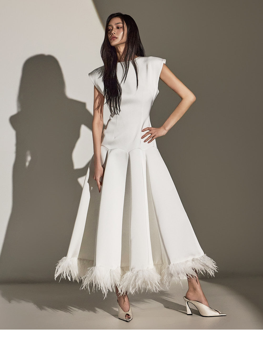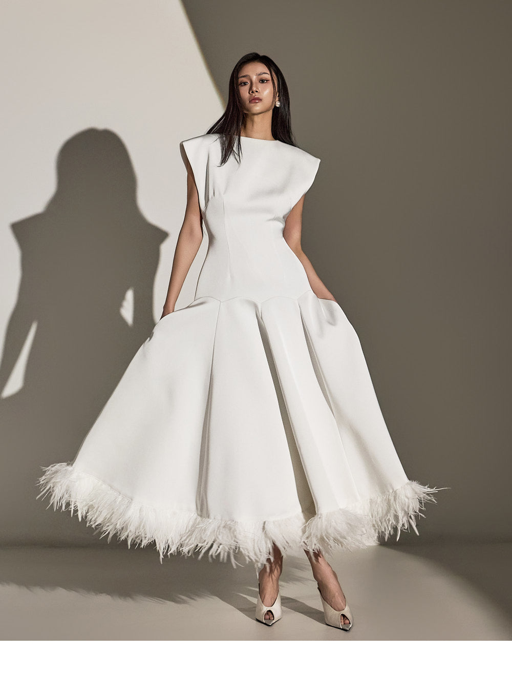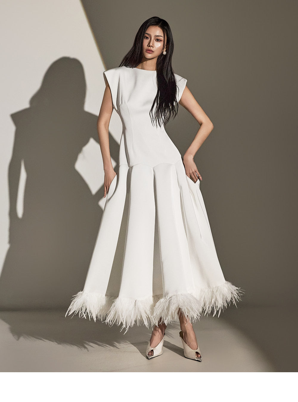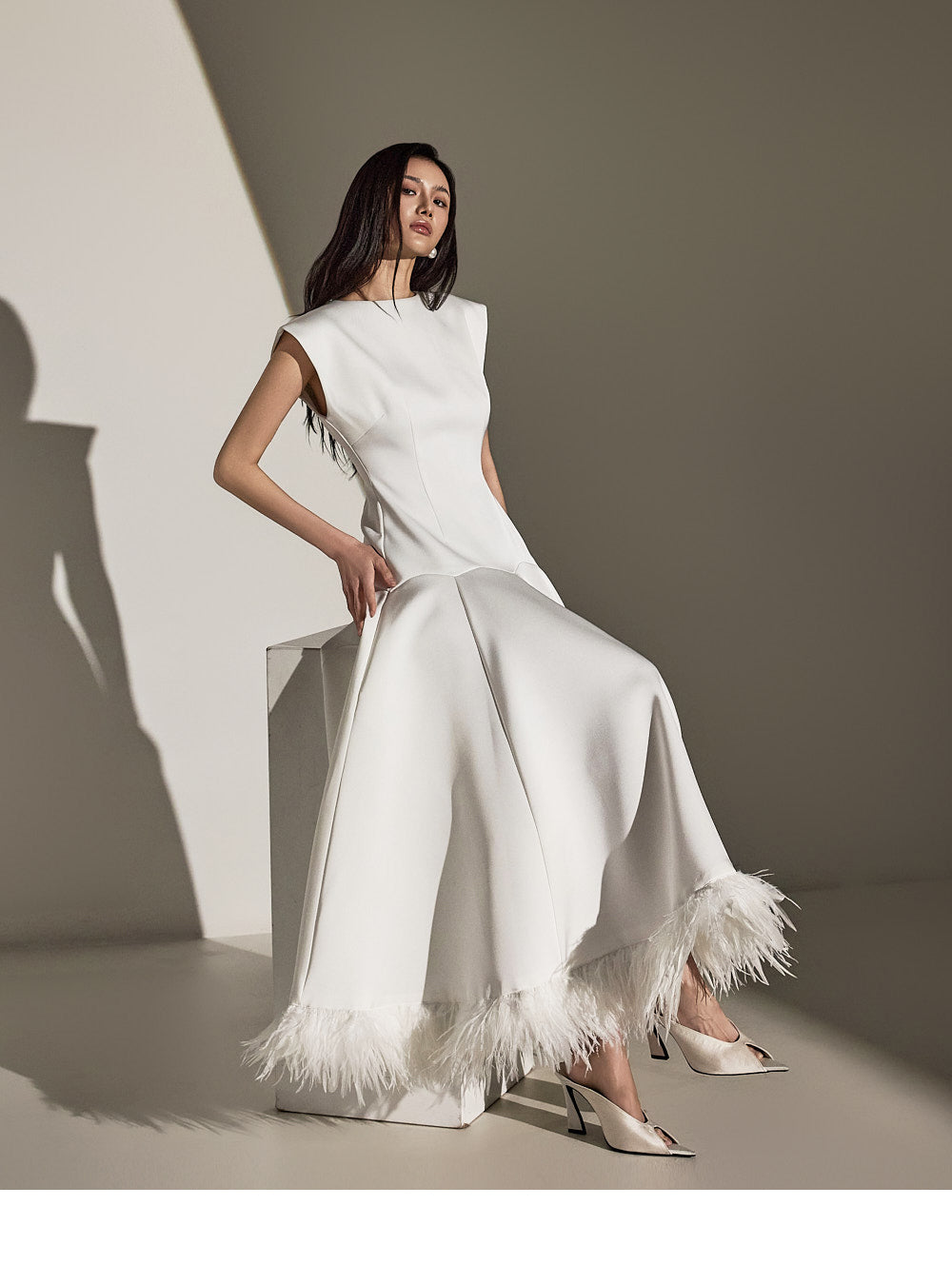 纤细的腰线与喇叭形的下摆形成鲜明对比,??