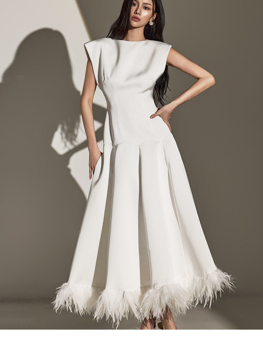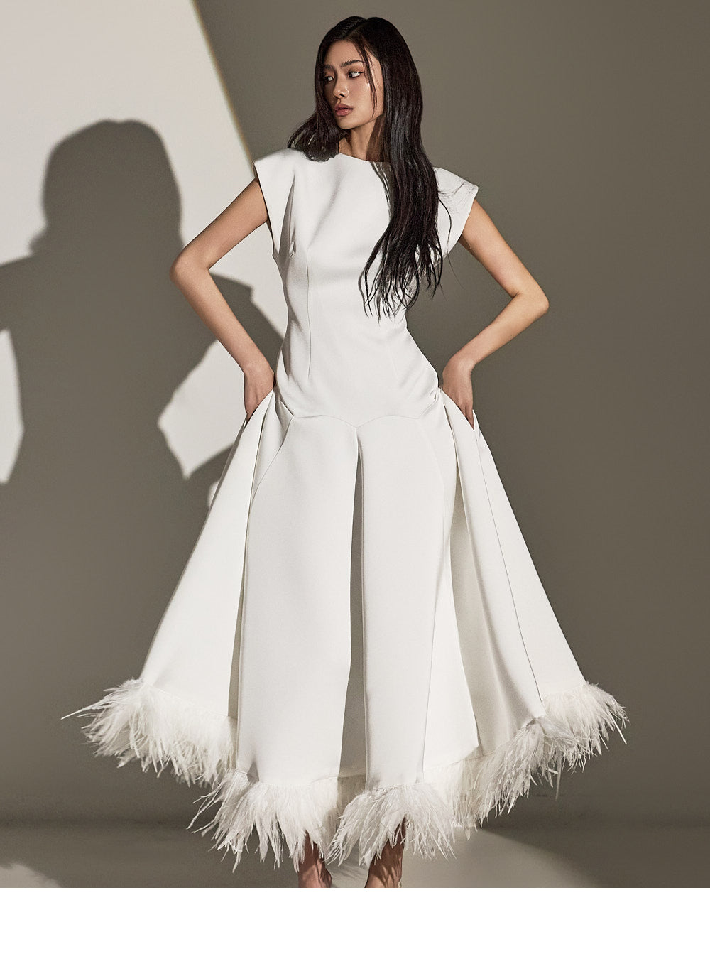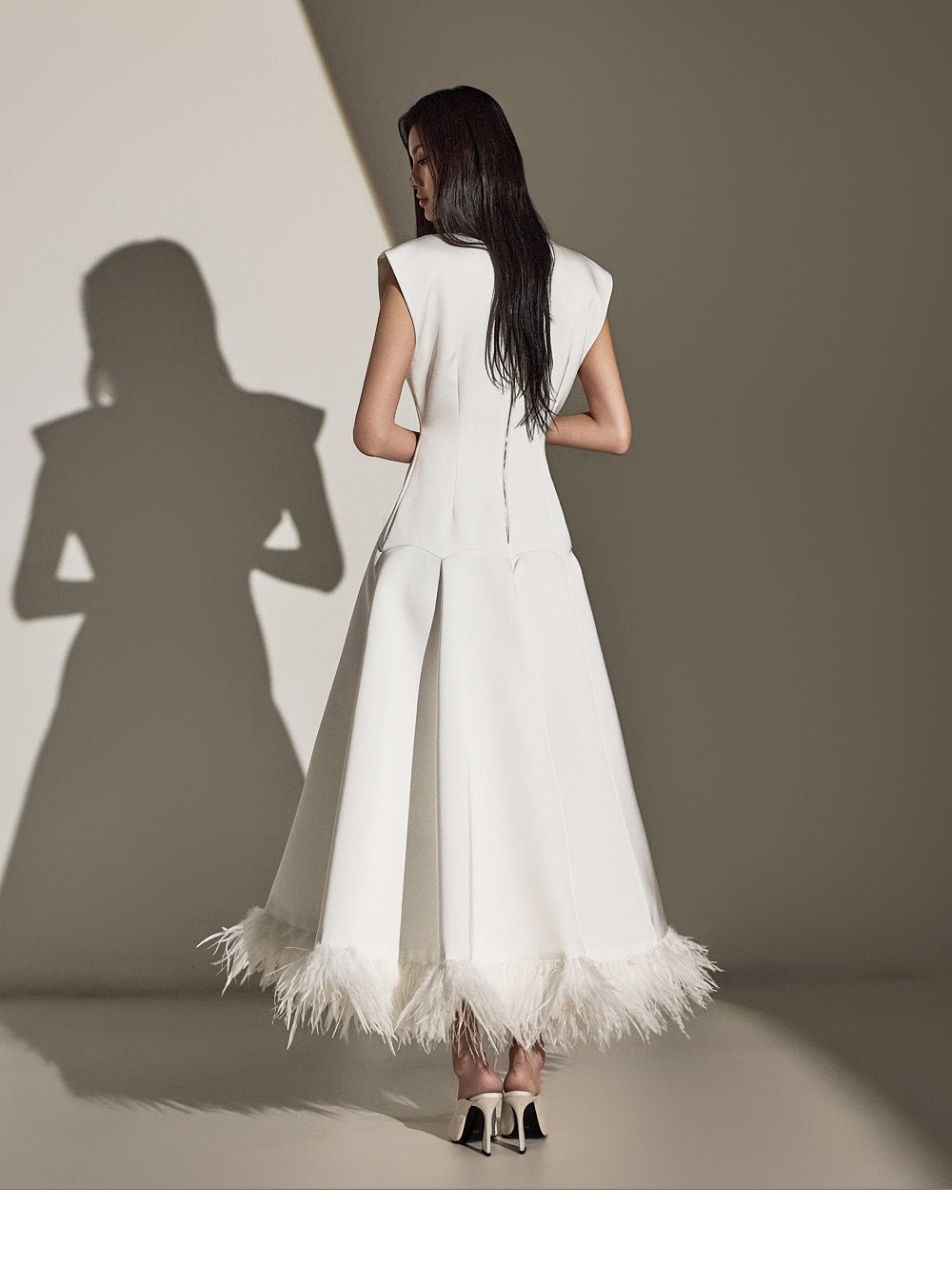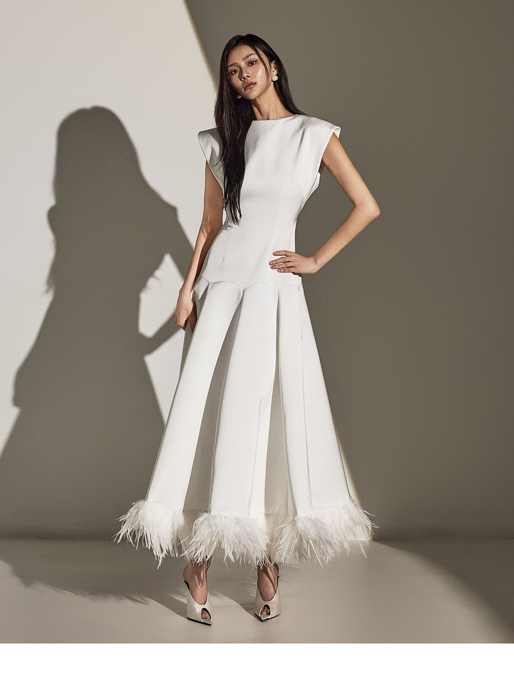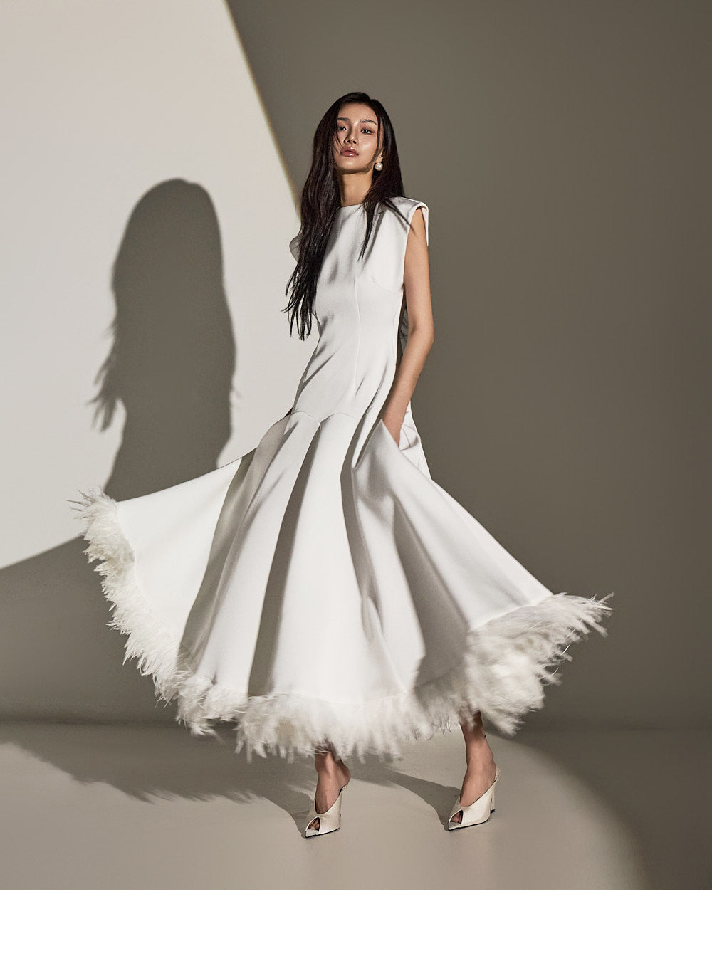 纤细的腰线与喇叭形的下摆形成鲜明对比,??