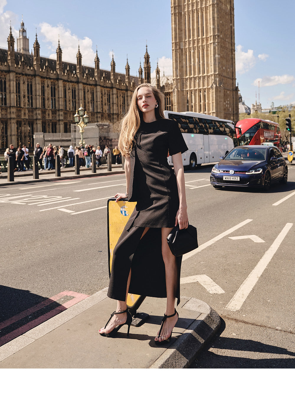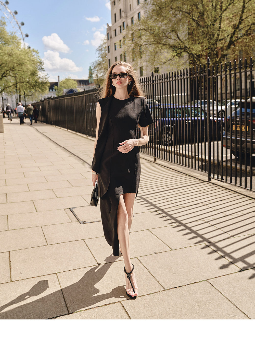不对称的下摆和袖子设计营造出独特的轮廓,