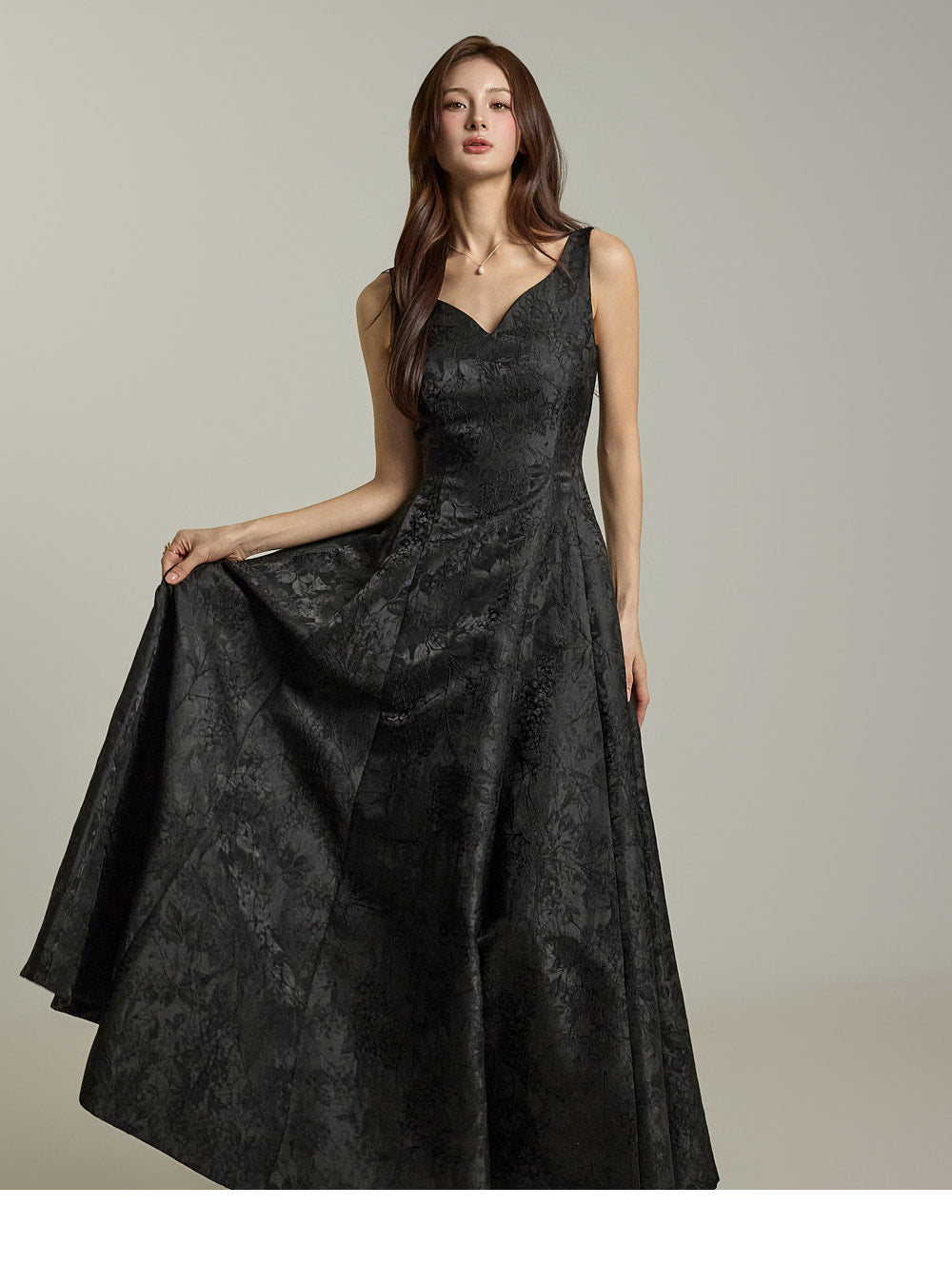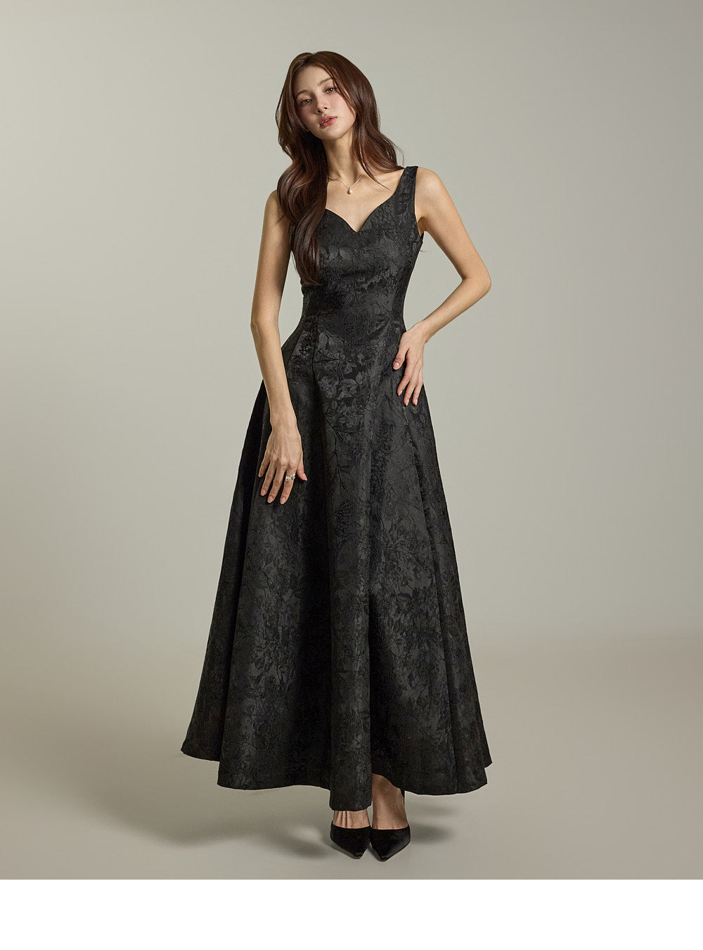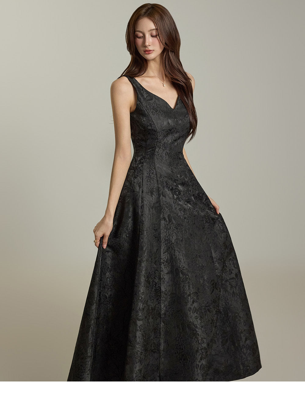 纤细的腰身和宽大的 A 字裙摆营造出优雅的沙漏形身材。