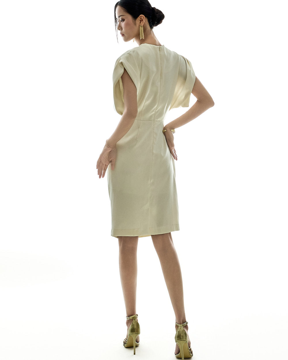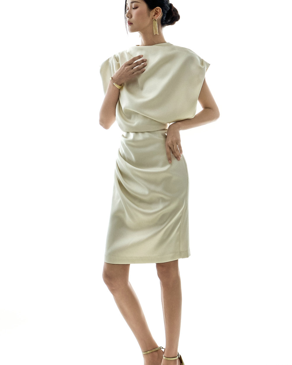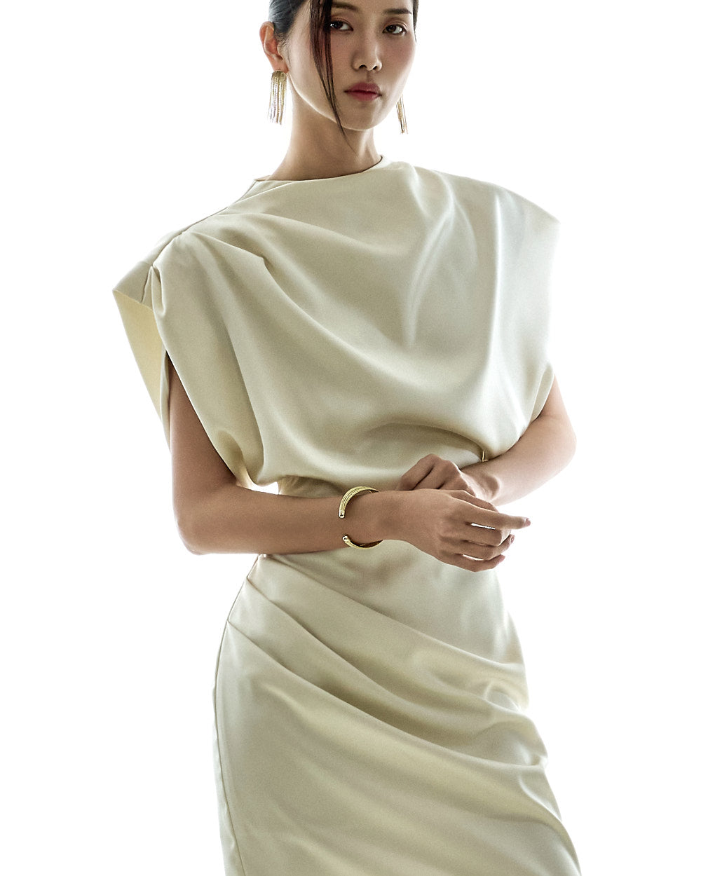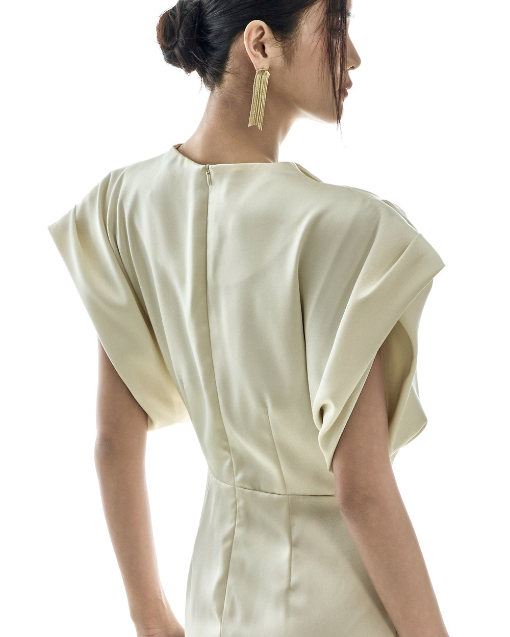 The loose, voluminous shirring detailing along the shoulders