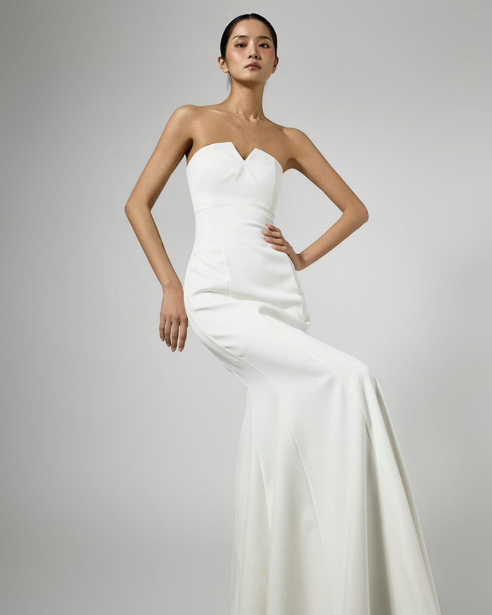 The slim-fitting torso and mermaid silhouette,