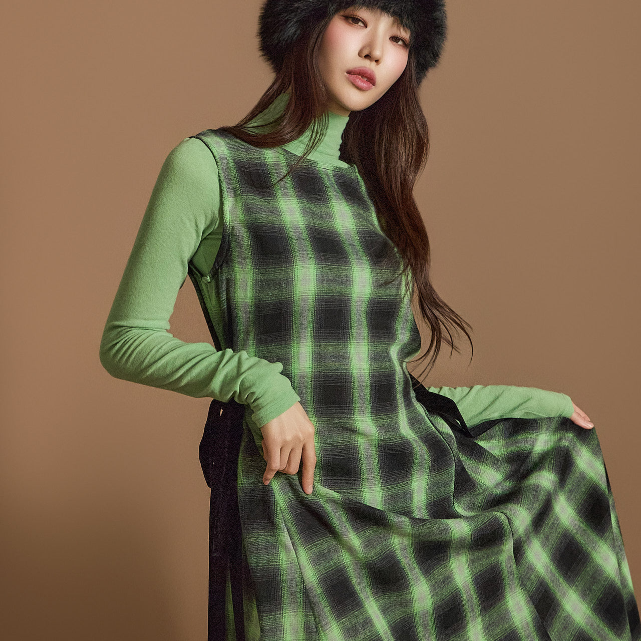 模特身高 171 厘米,穿着黄绿色均码的衣服。
