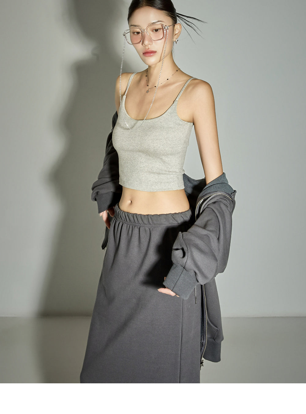 The cropped length and slim fit naturally hug the body,