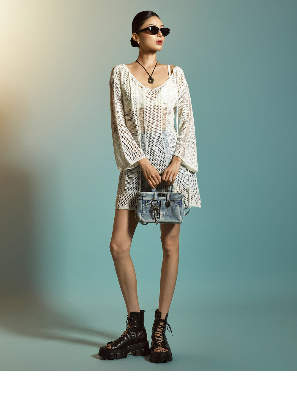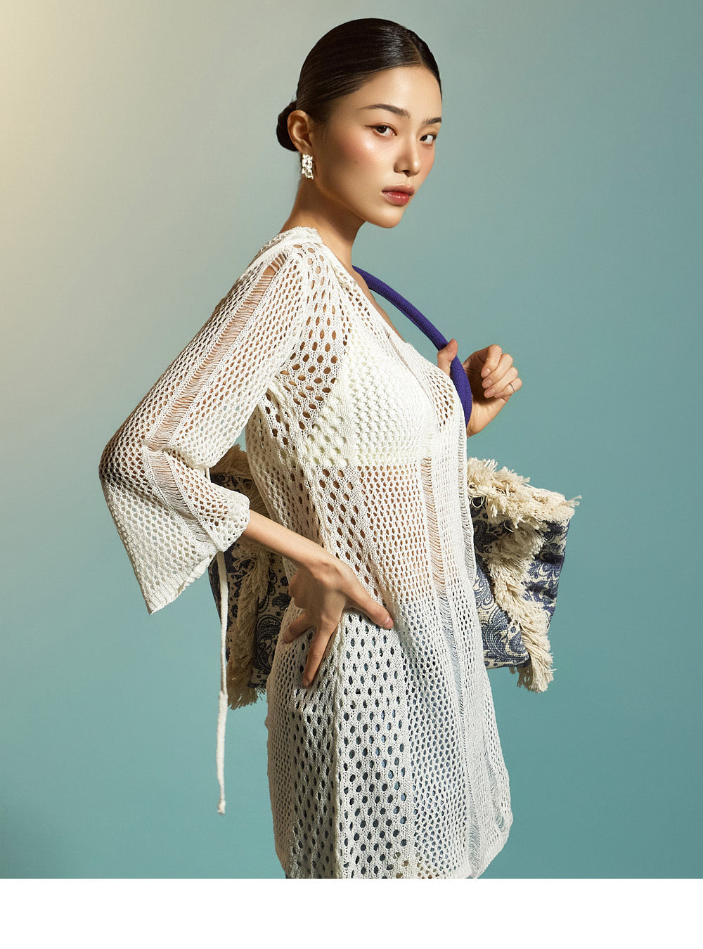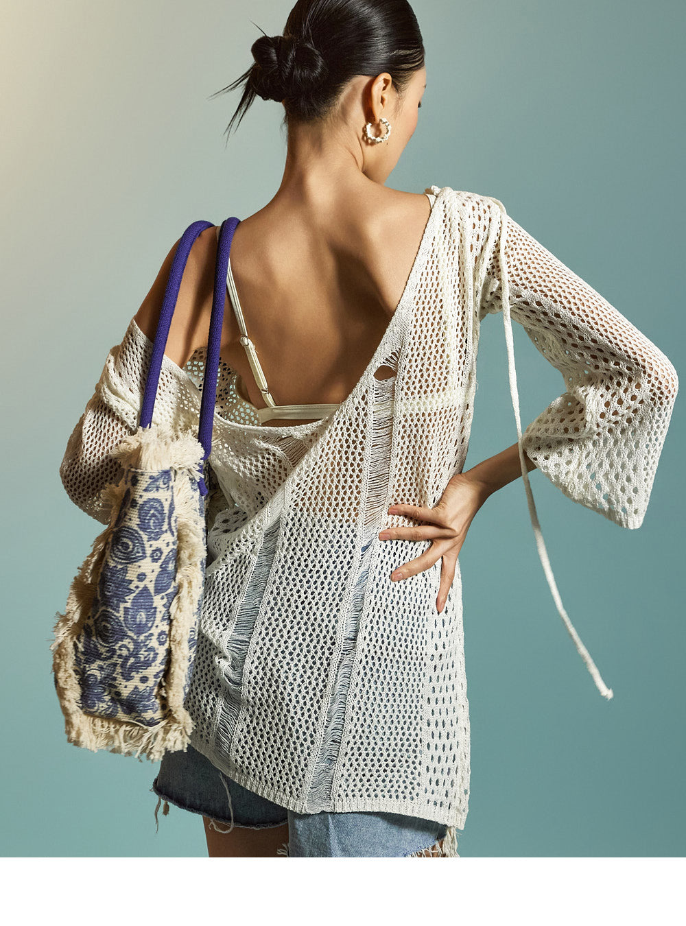 这款 V 领网眼针织上衣给人一种自然、轻松的感觉。