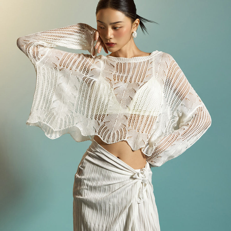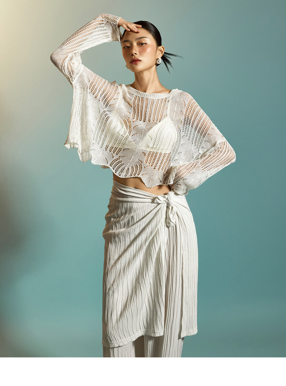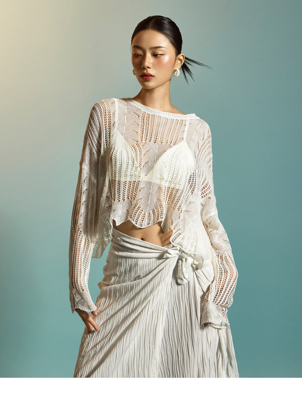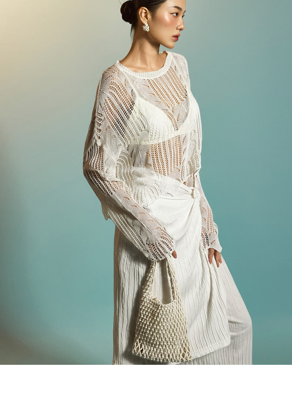 这款网状透明针织上衣将度假氛围与日常风格融为一体。