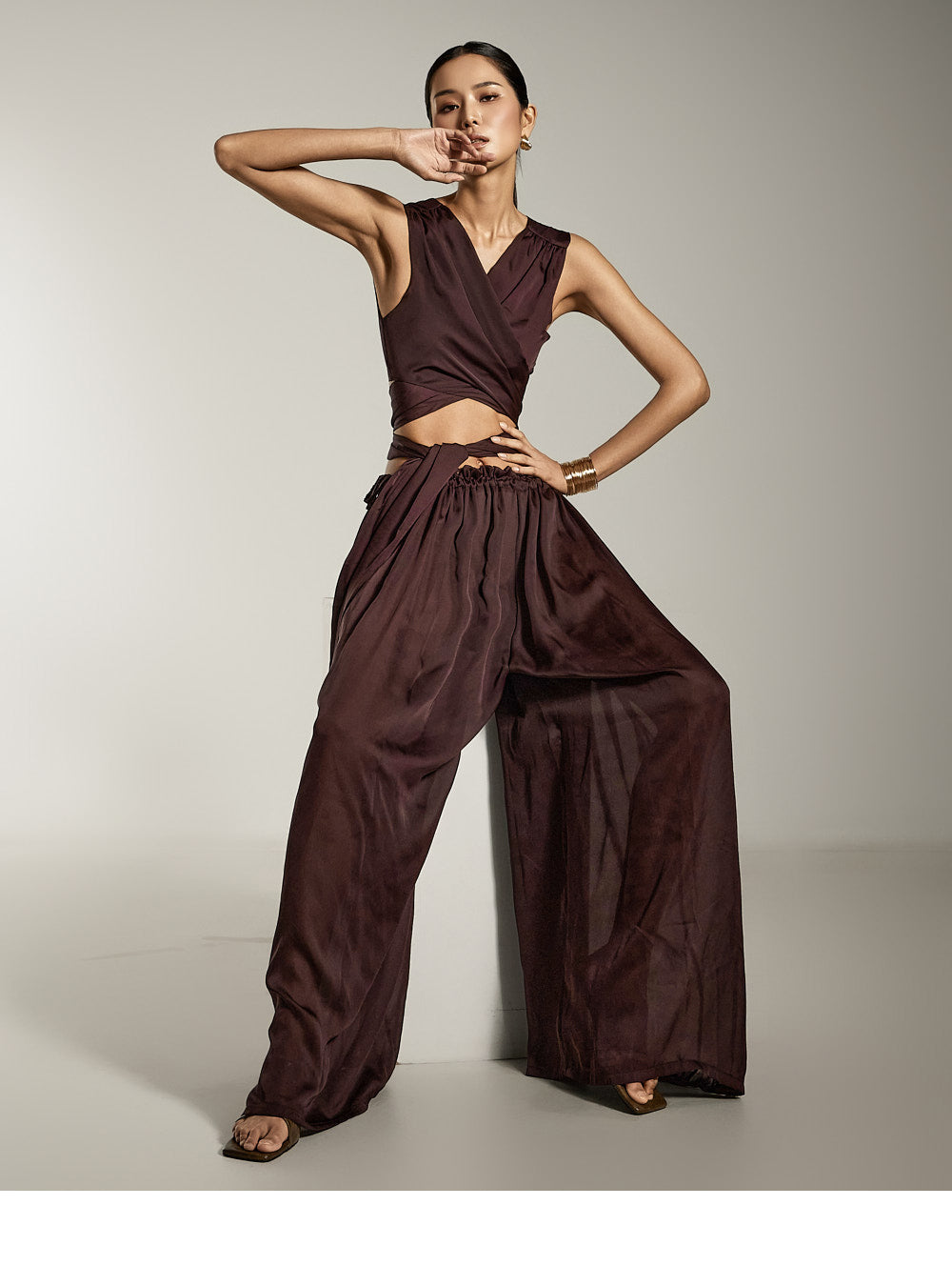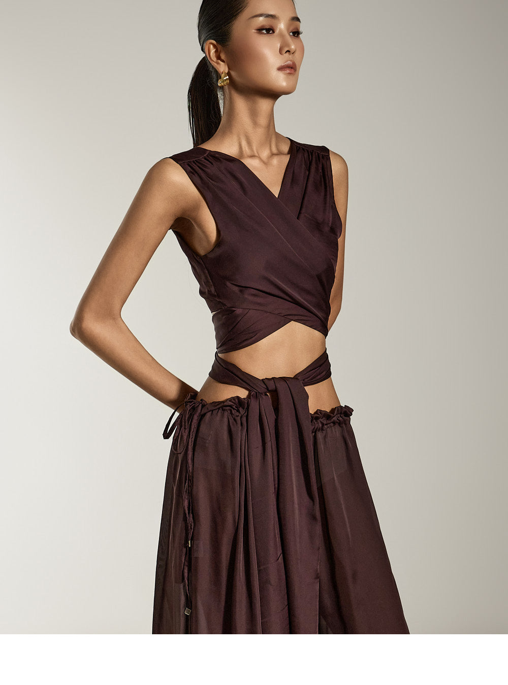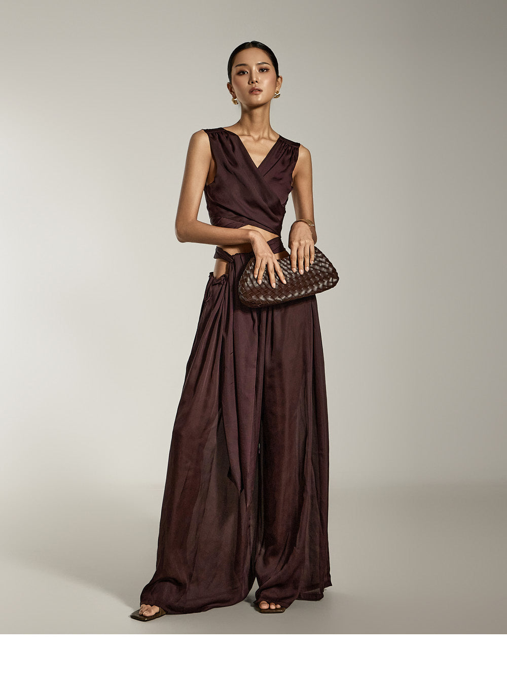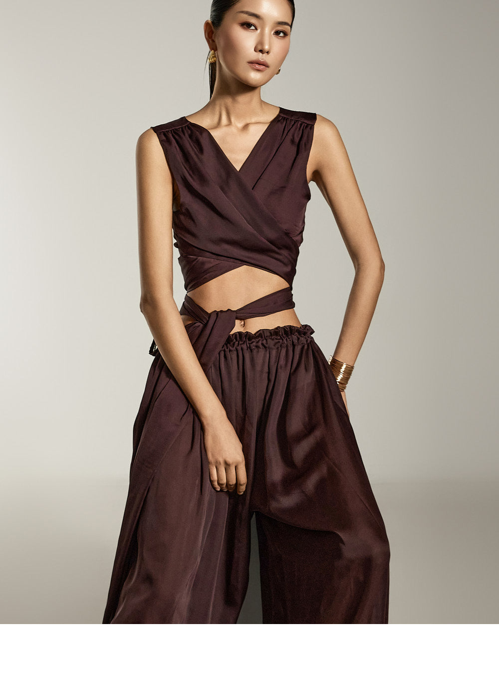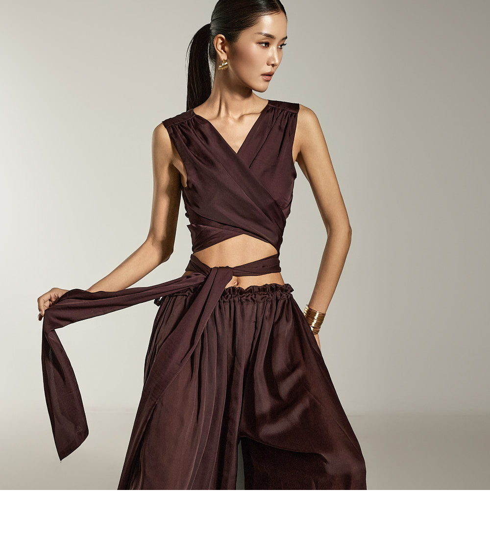 这是一款具有别致、现代气息的缎面裹身上衣。