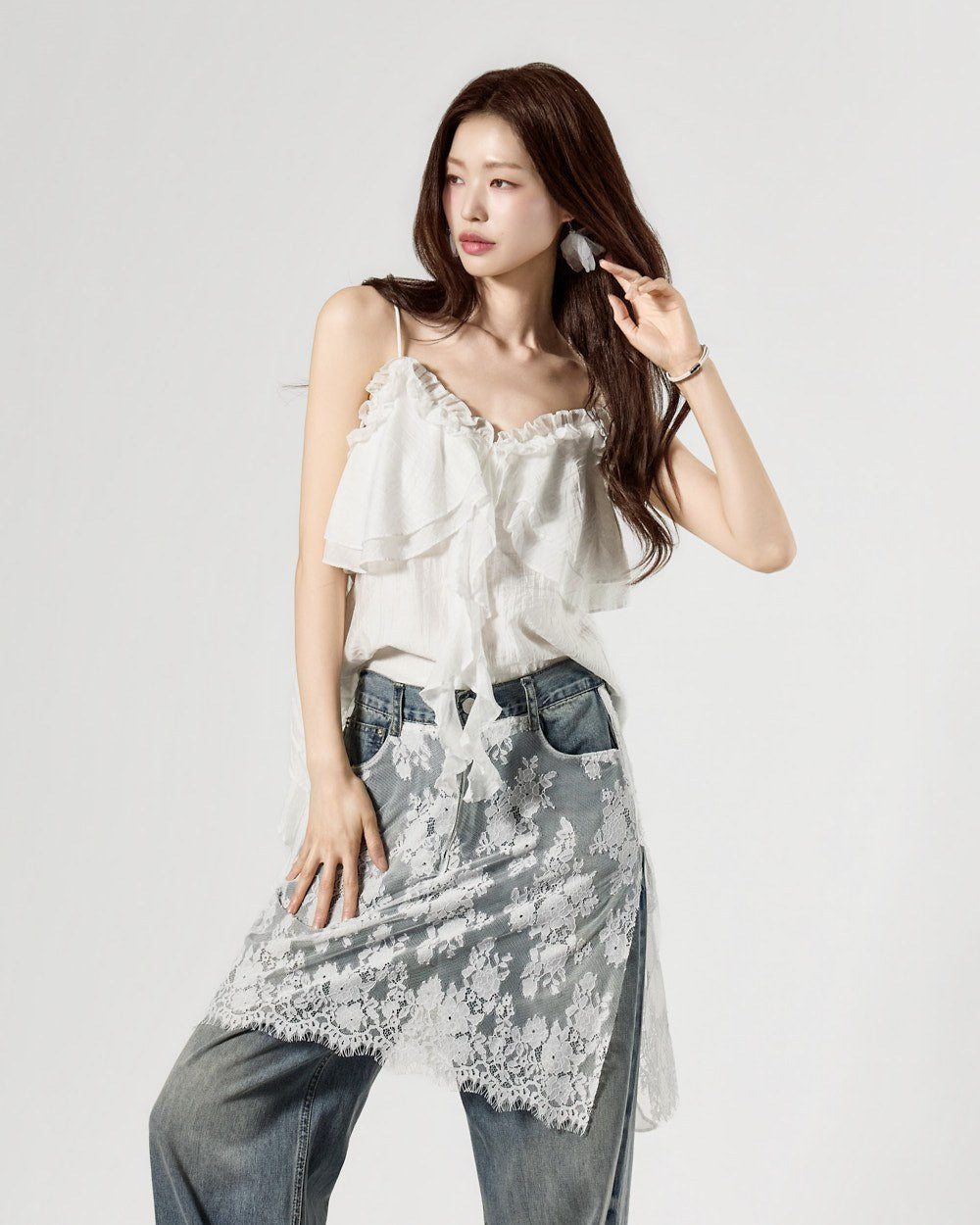 侧面长长的荷叶边随着每一次的摆动,勾勒出自然流畅的轮廓。