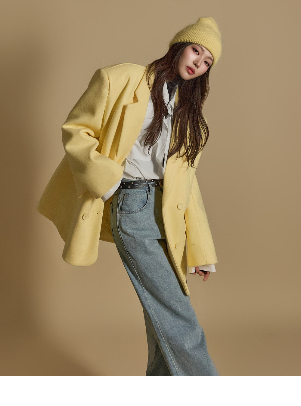 模特身高 171 厘米,穿着均码浅黄色
