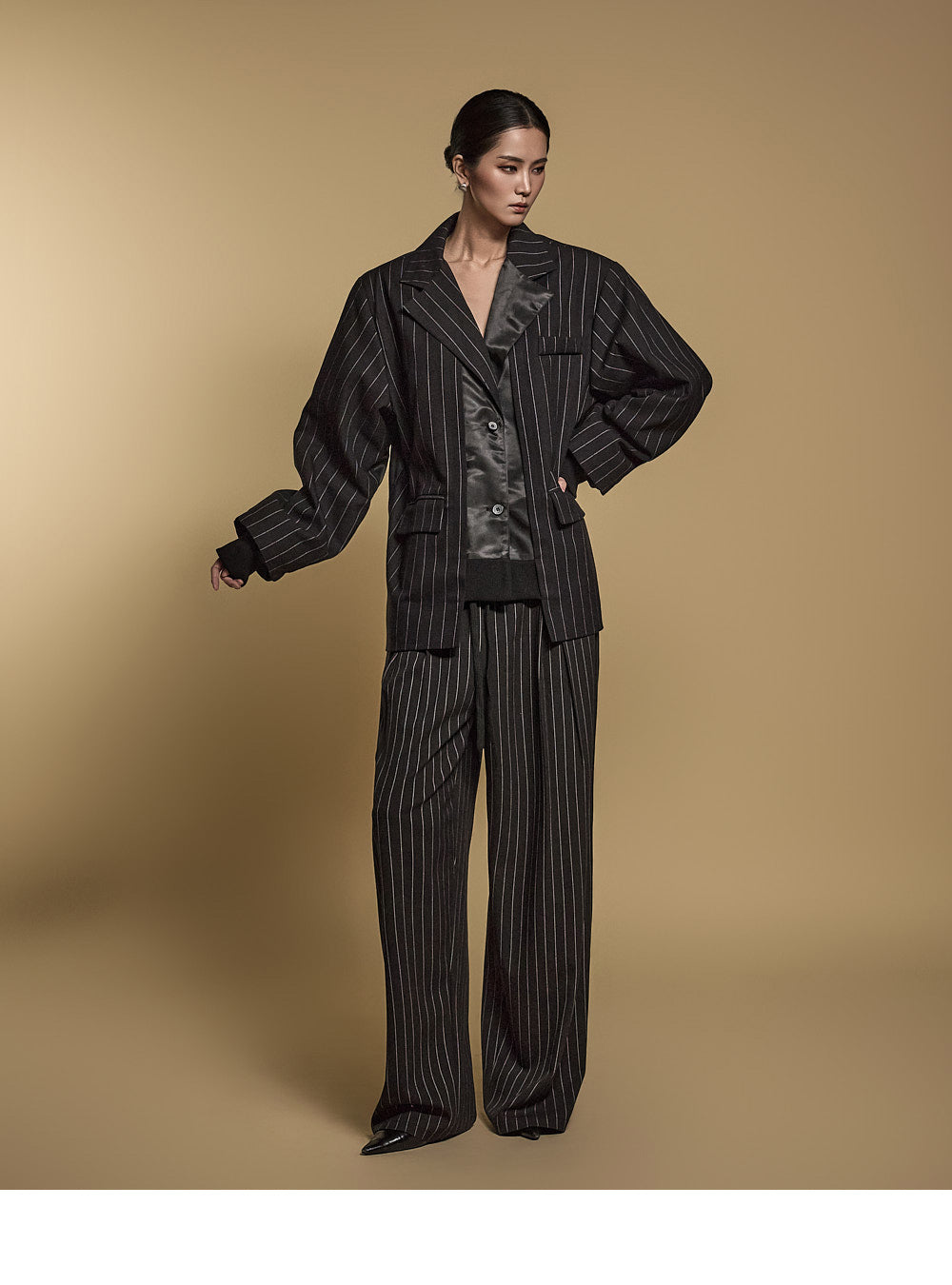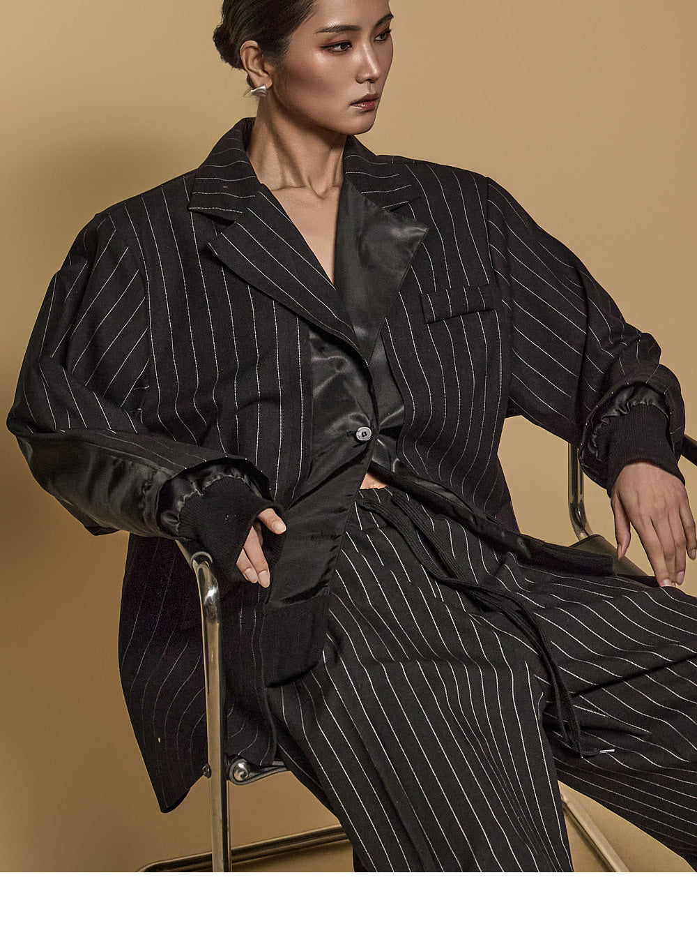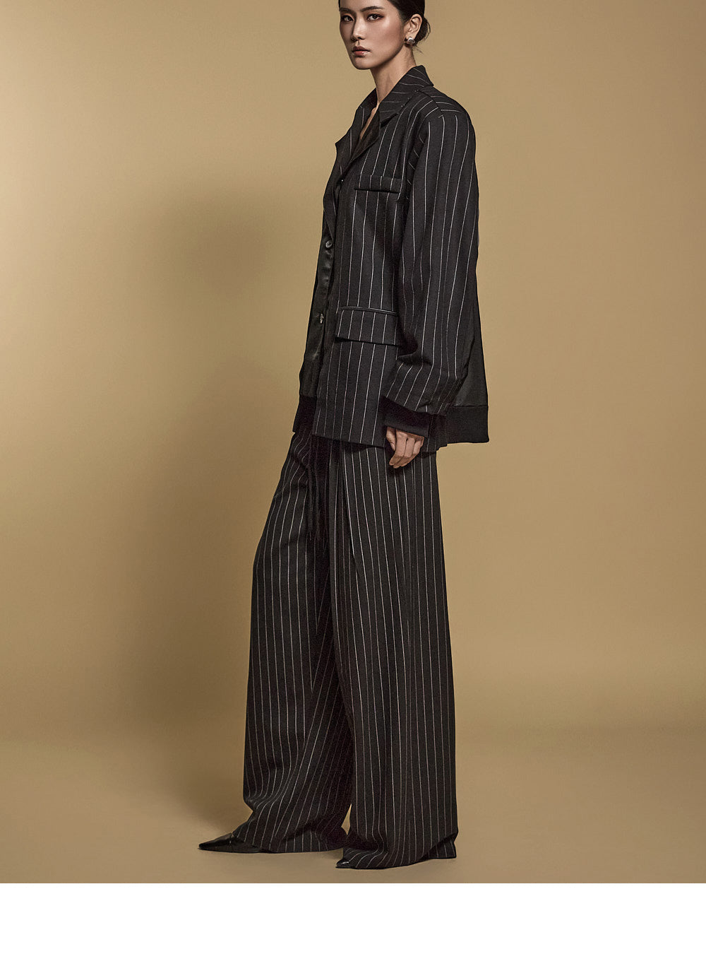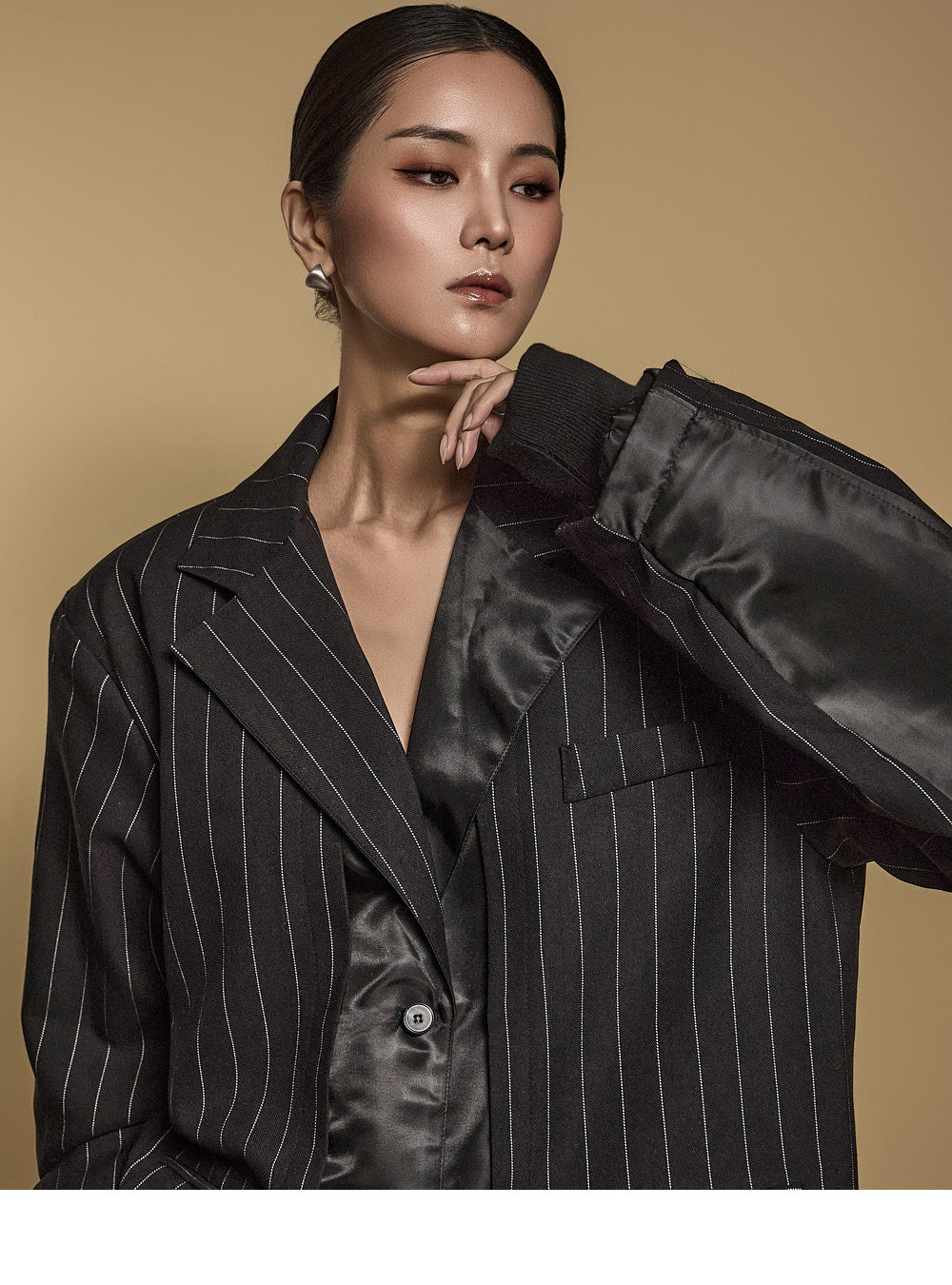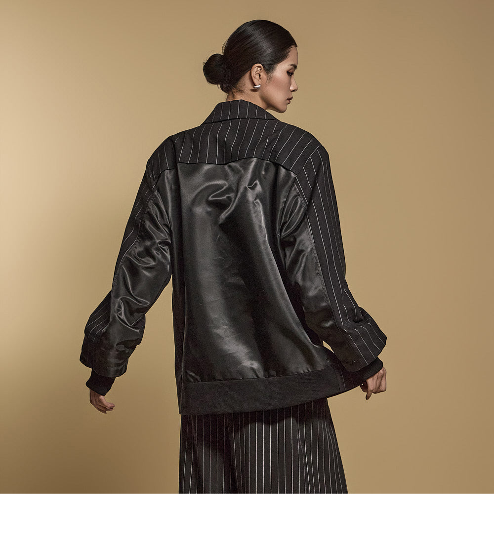 光泽的面料搭配条纹图案,增强了它的时尚魅力,