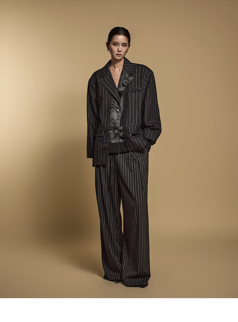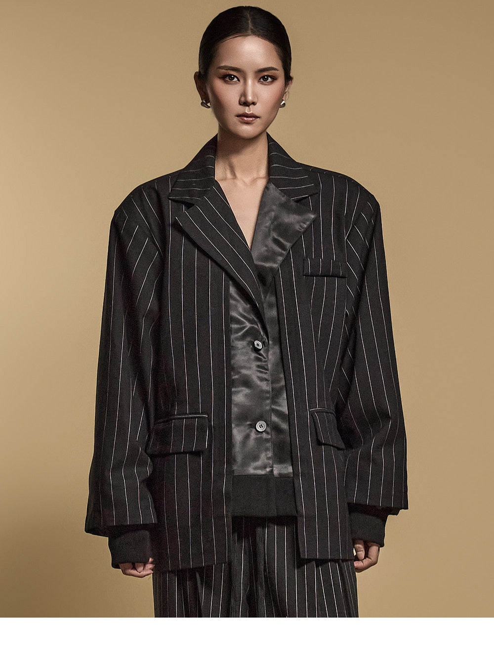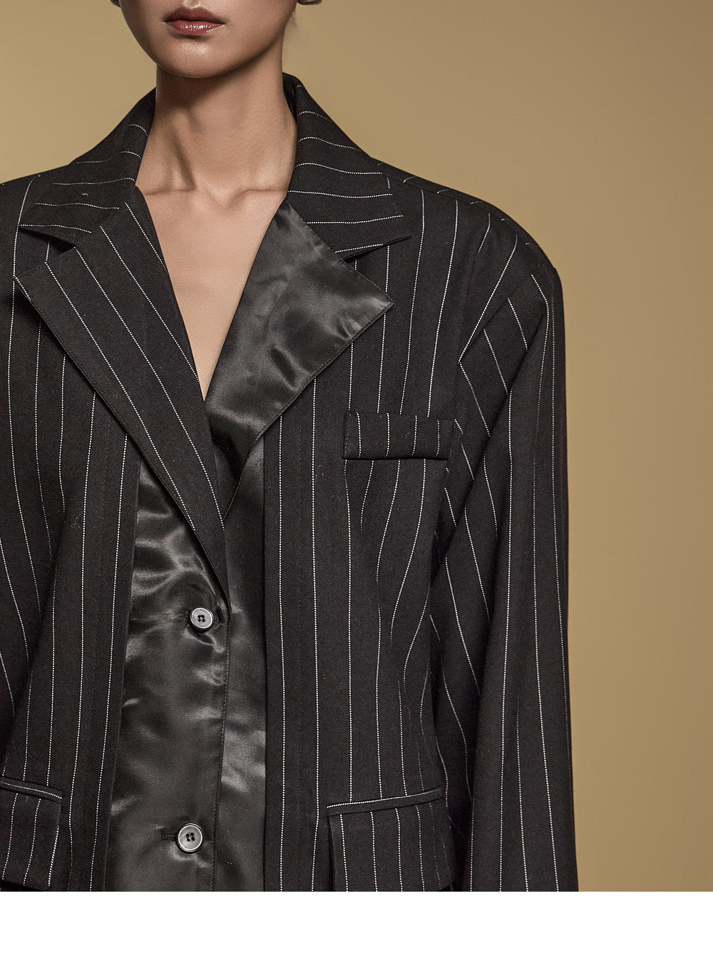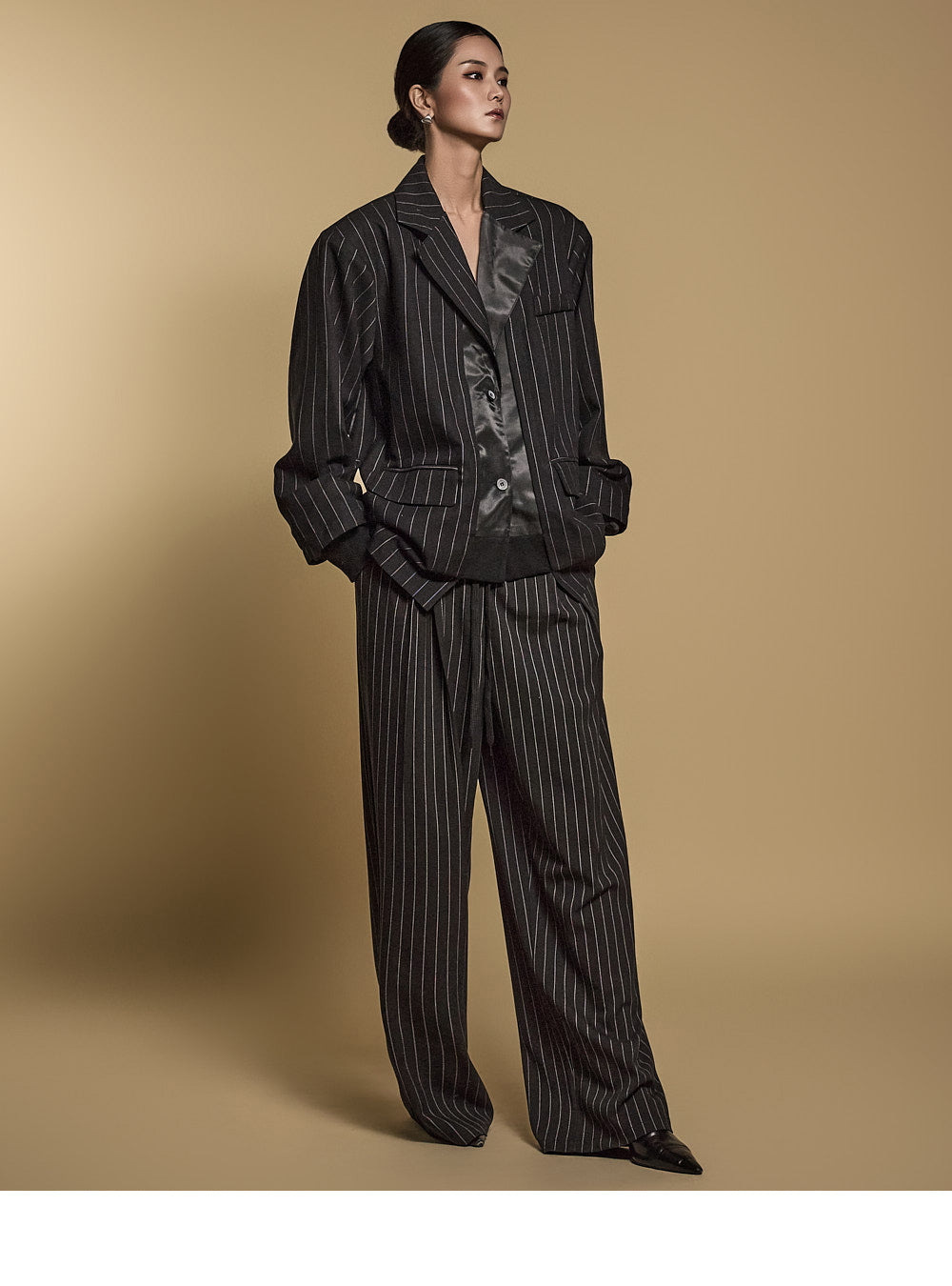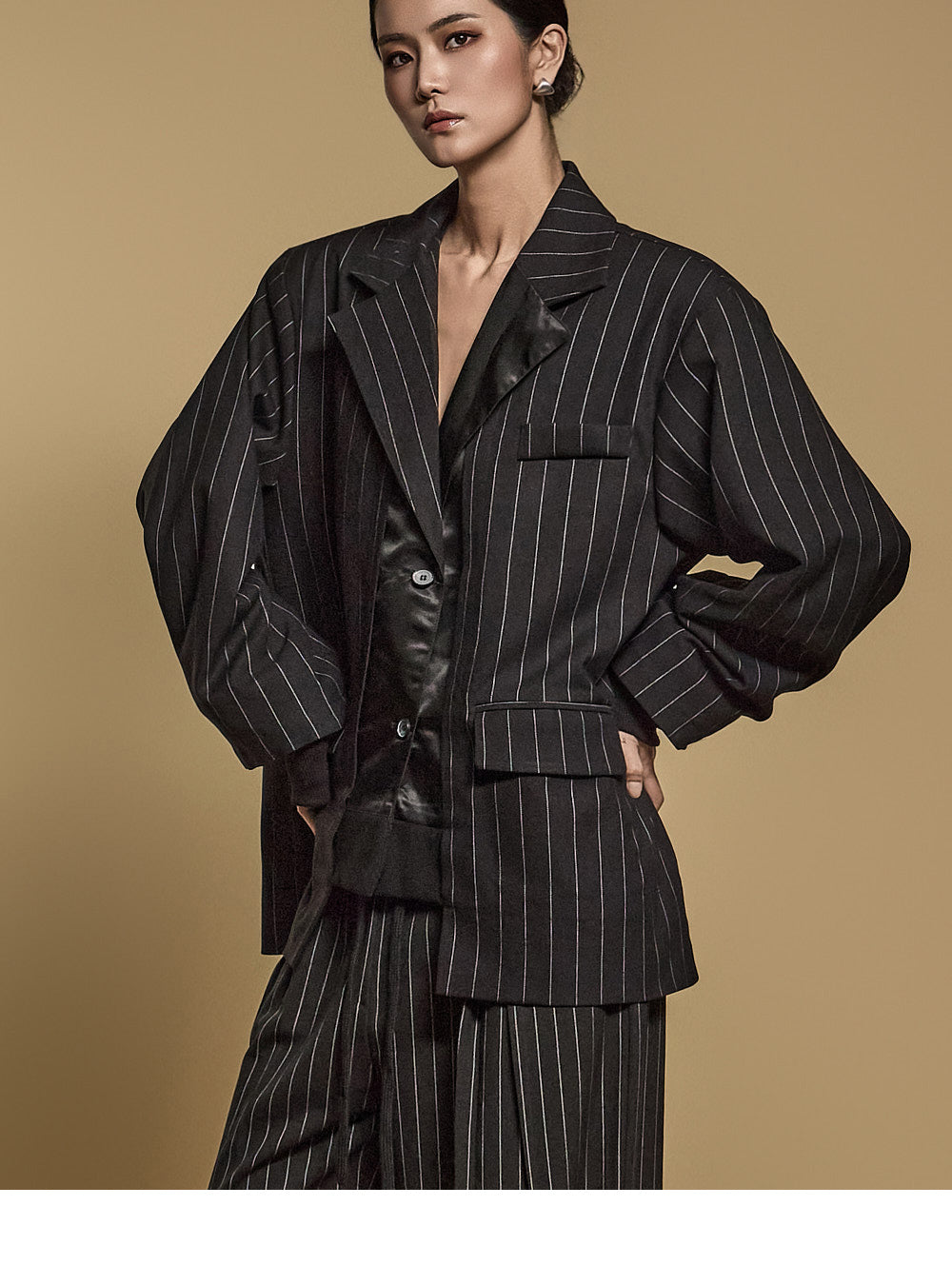 光泽的面料搭配条纹图案,增强了它的时尚魅力,
