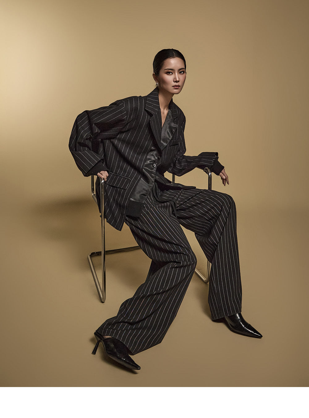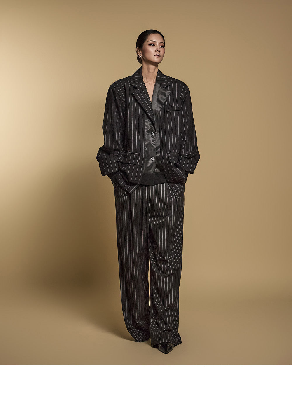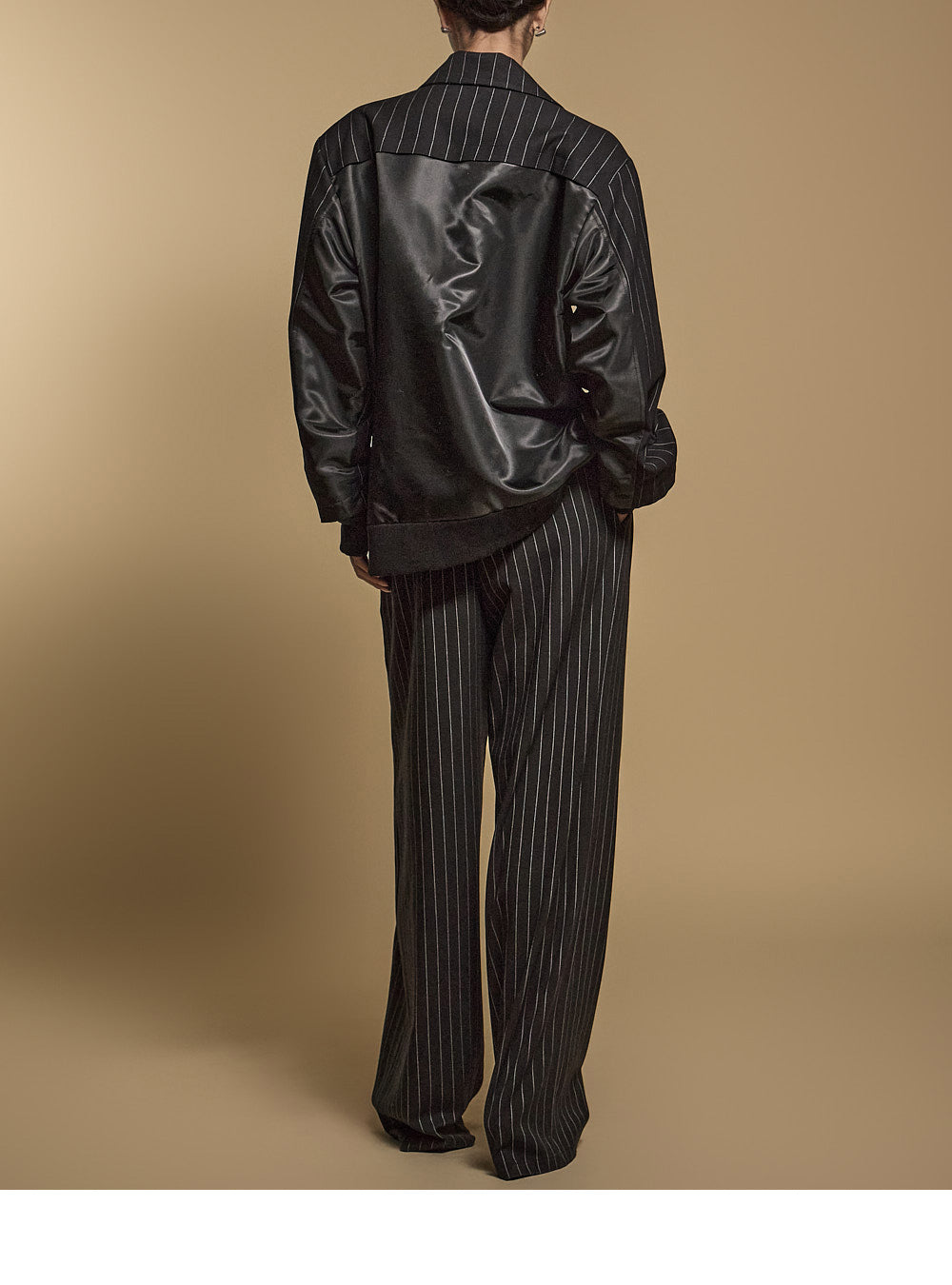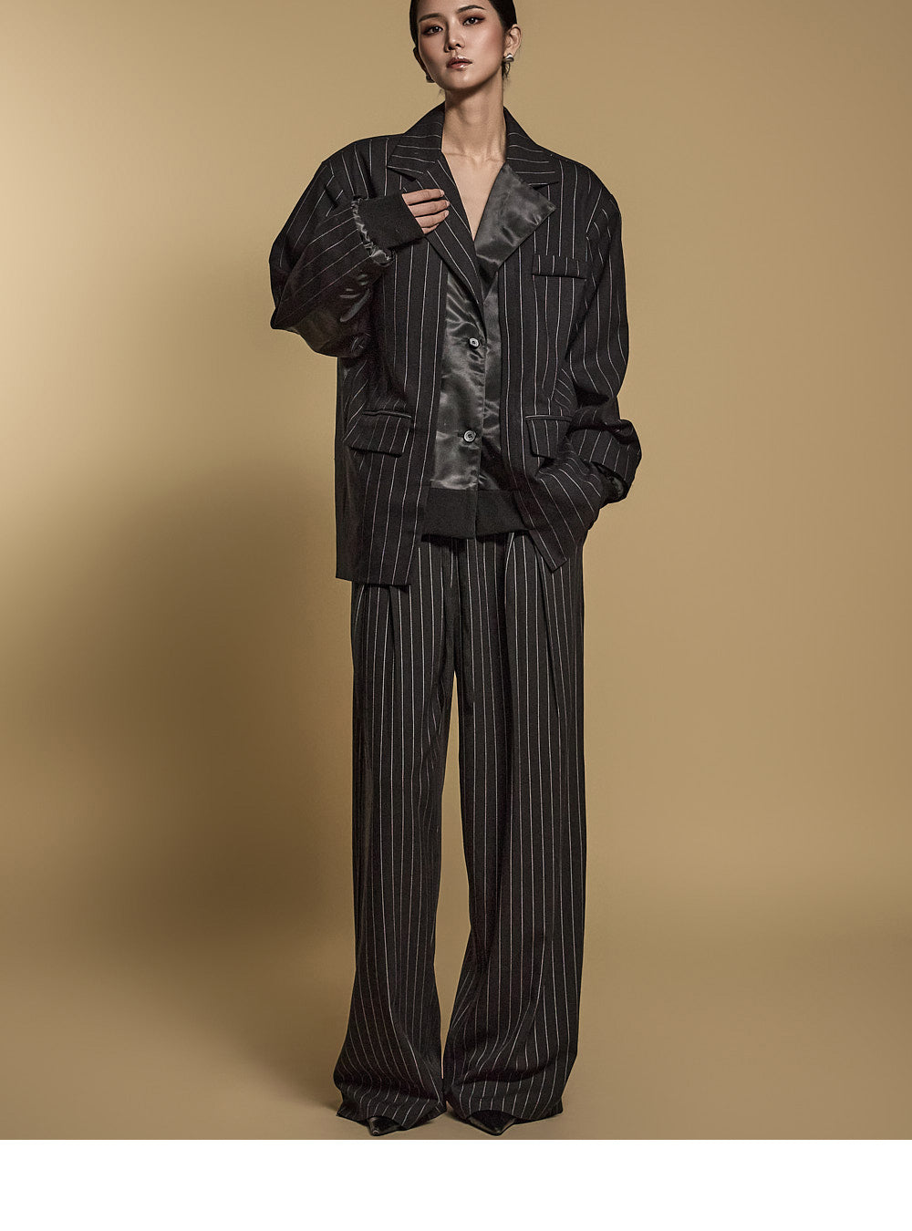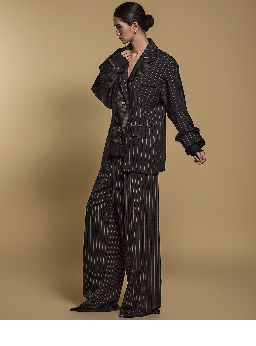 光泽的面料搭配条纹图案,增强了它的时尚魅力,