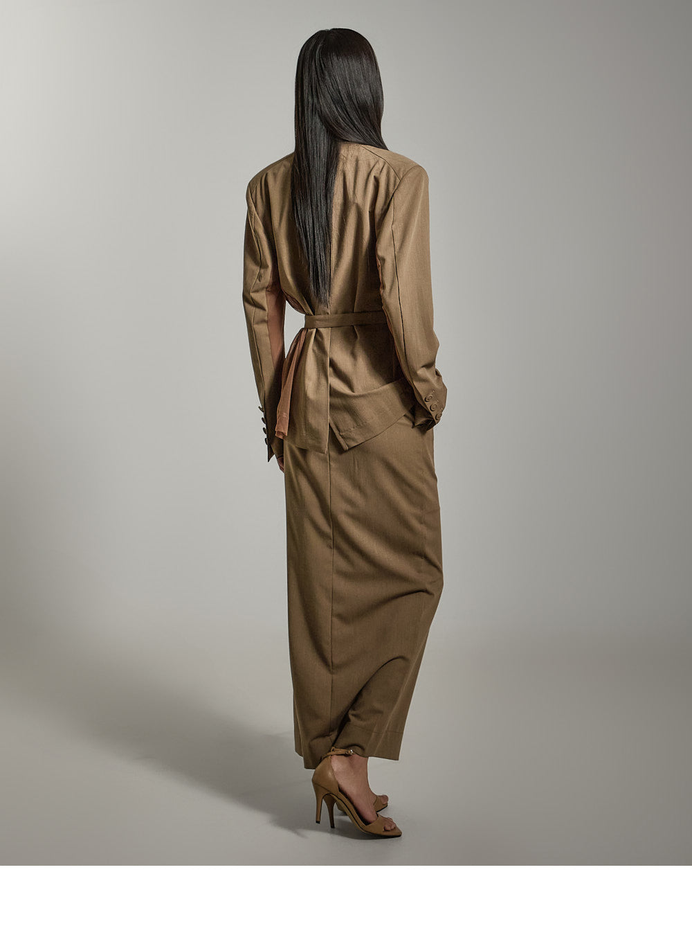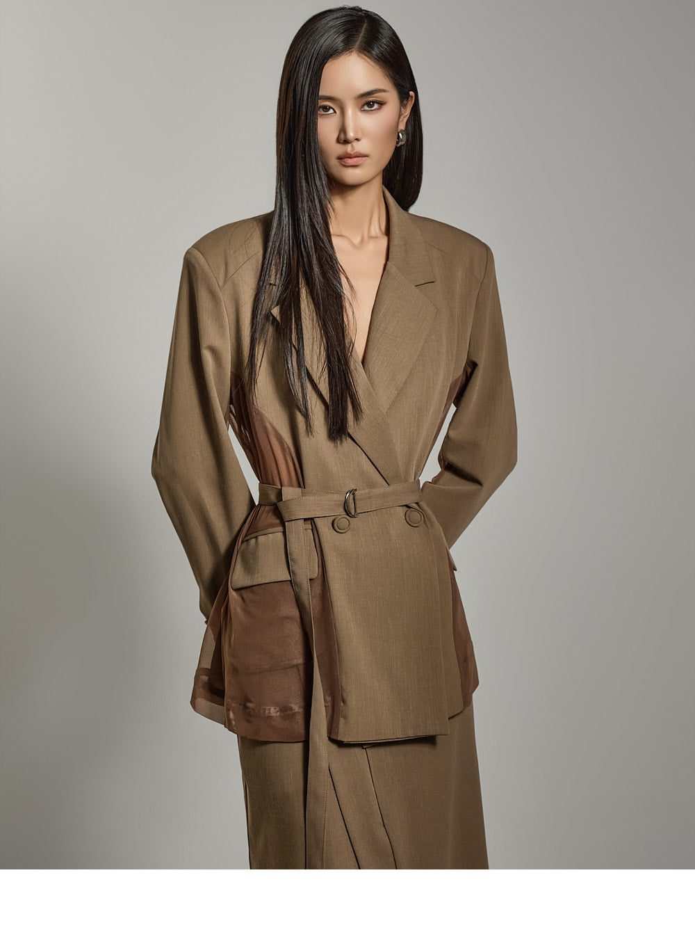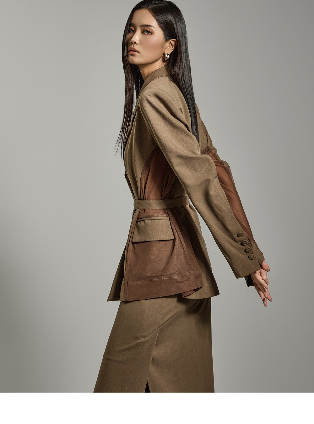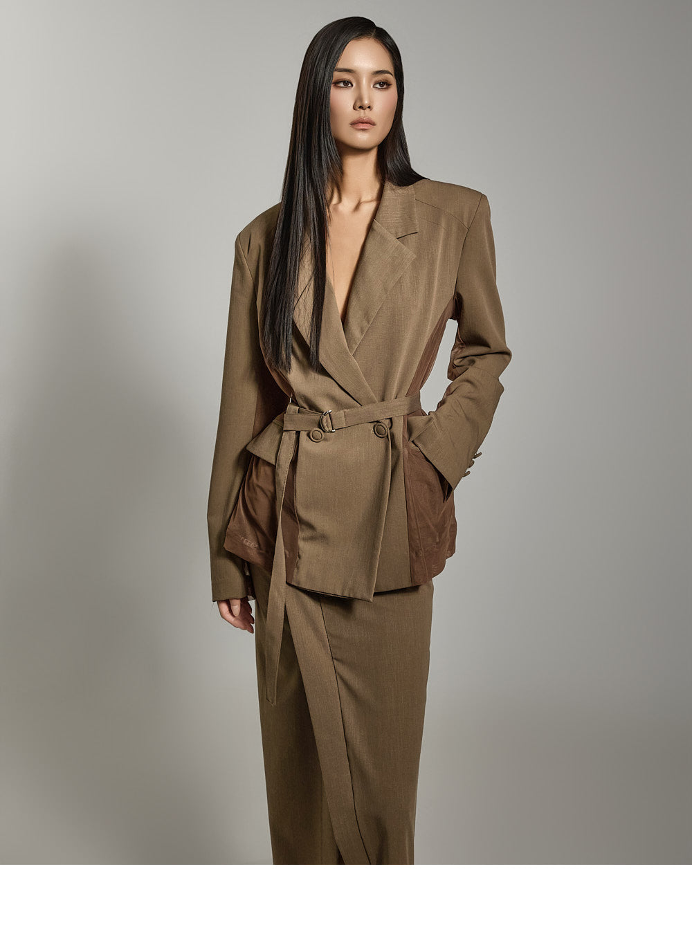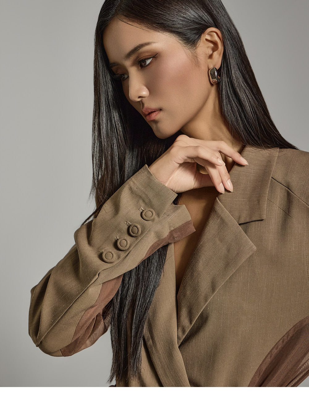 采用聚酯纤维、人造丝、亚麻、醋酸纤维和氨纶混纺而成,