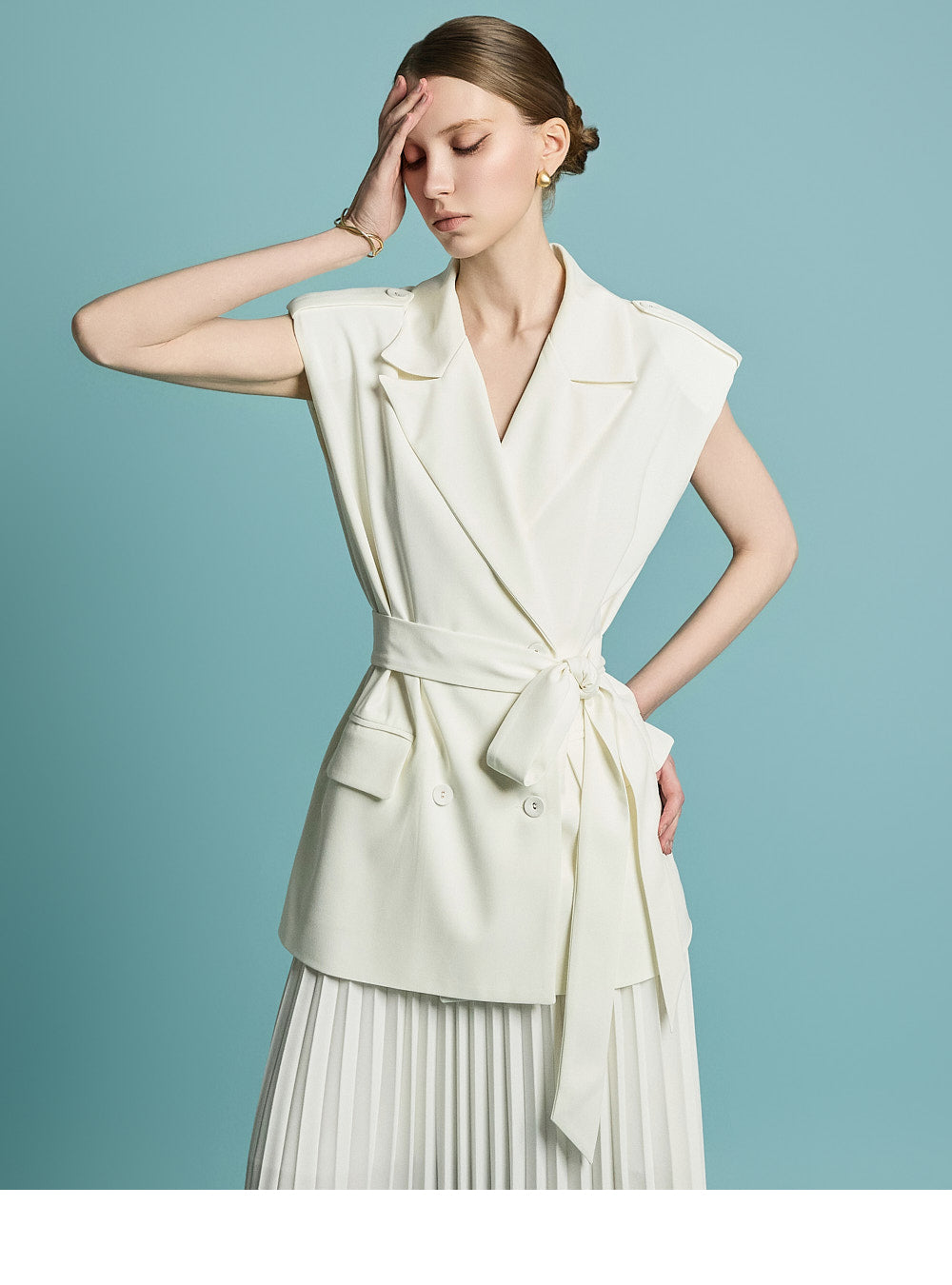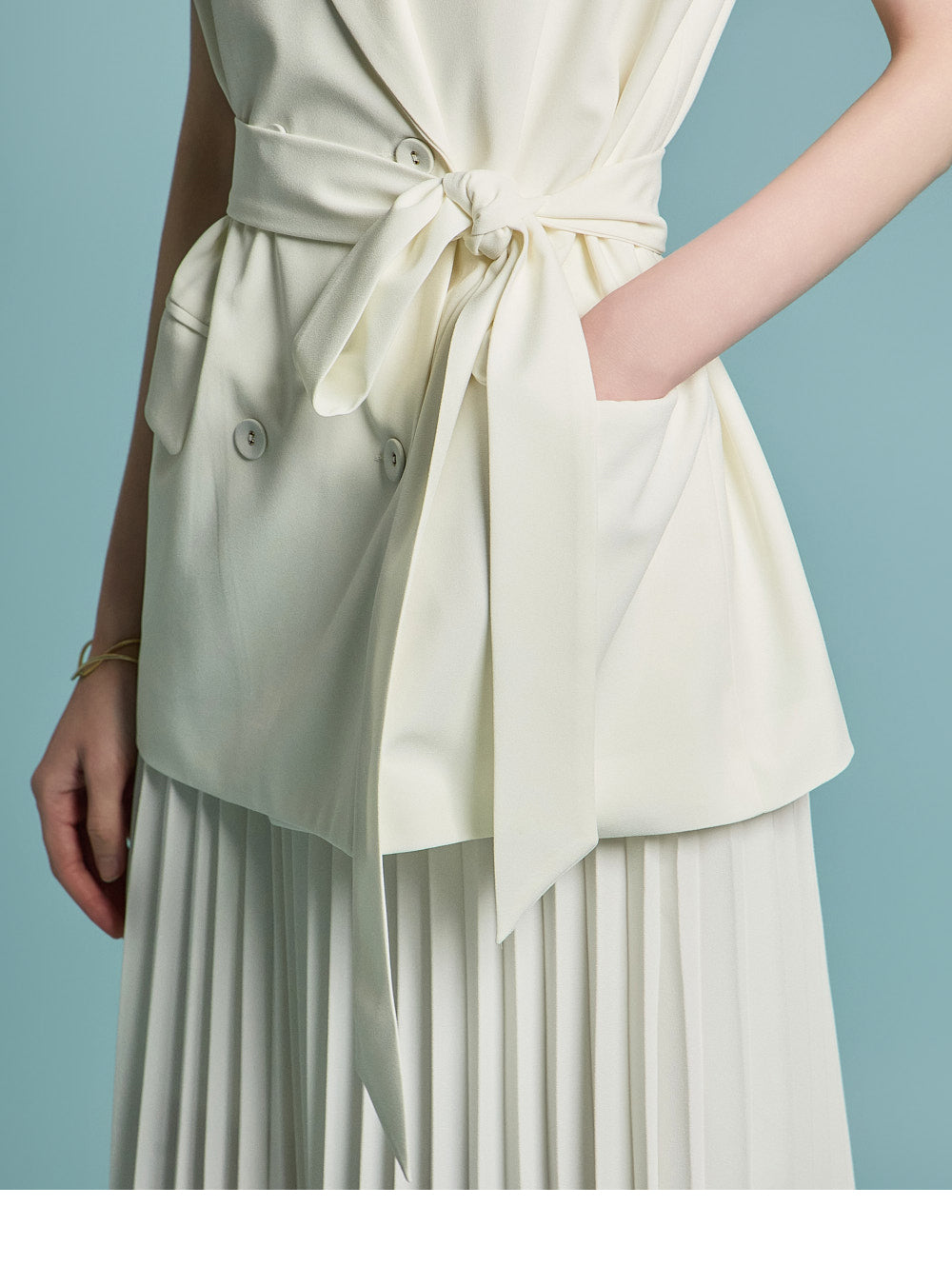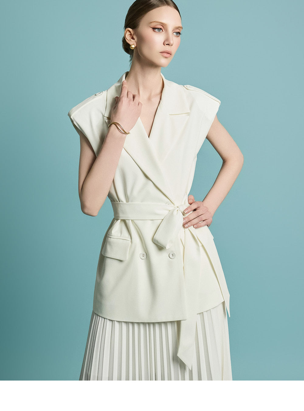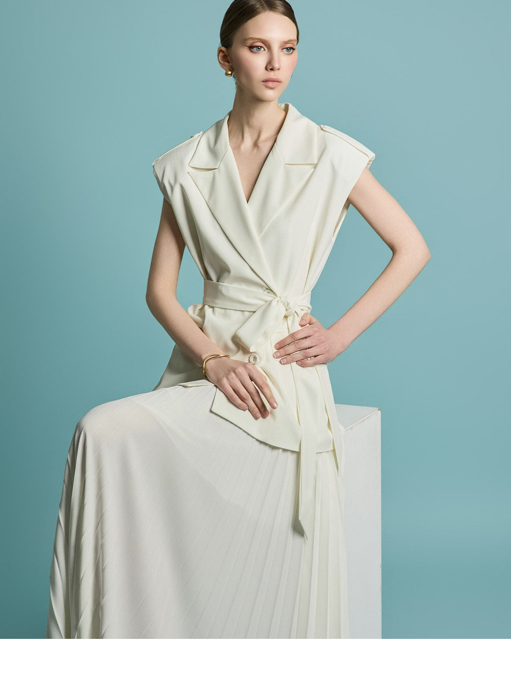 模特身高 174 厘米,穿着均码象牙色服装。