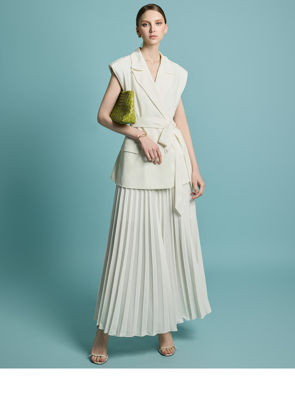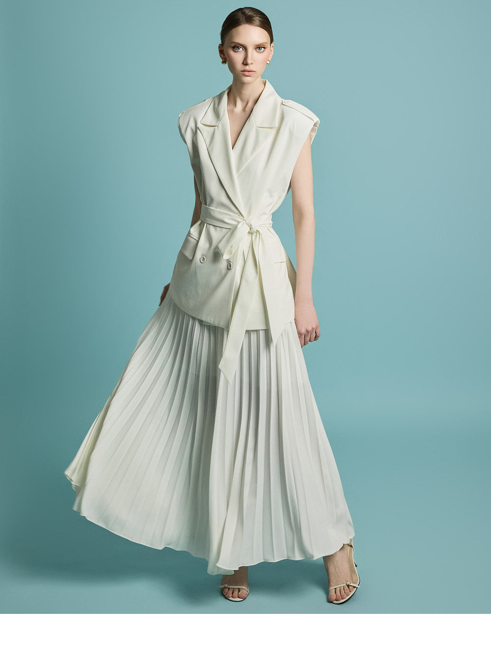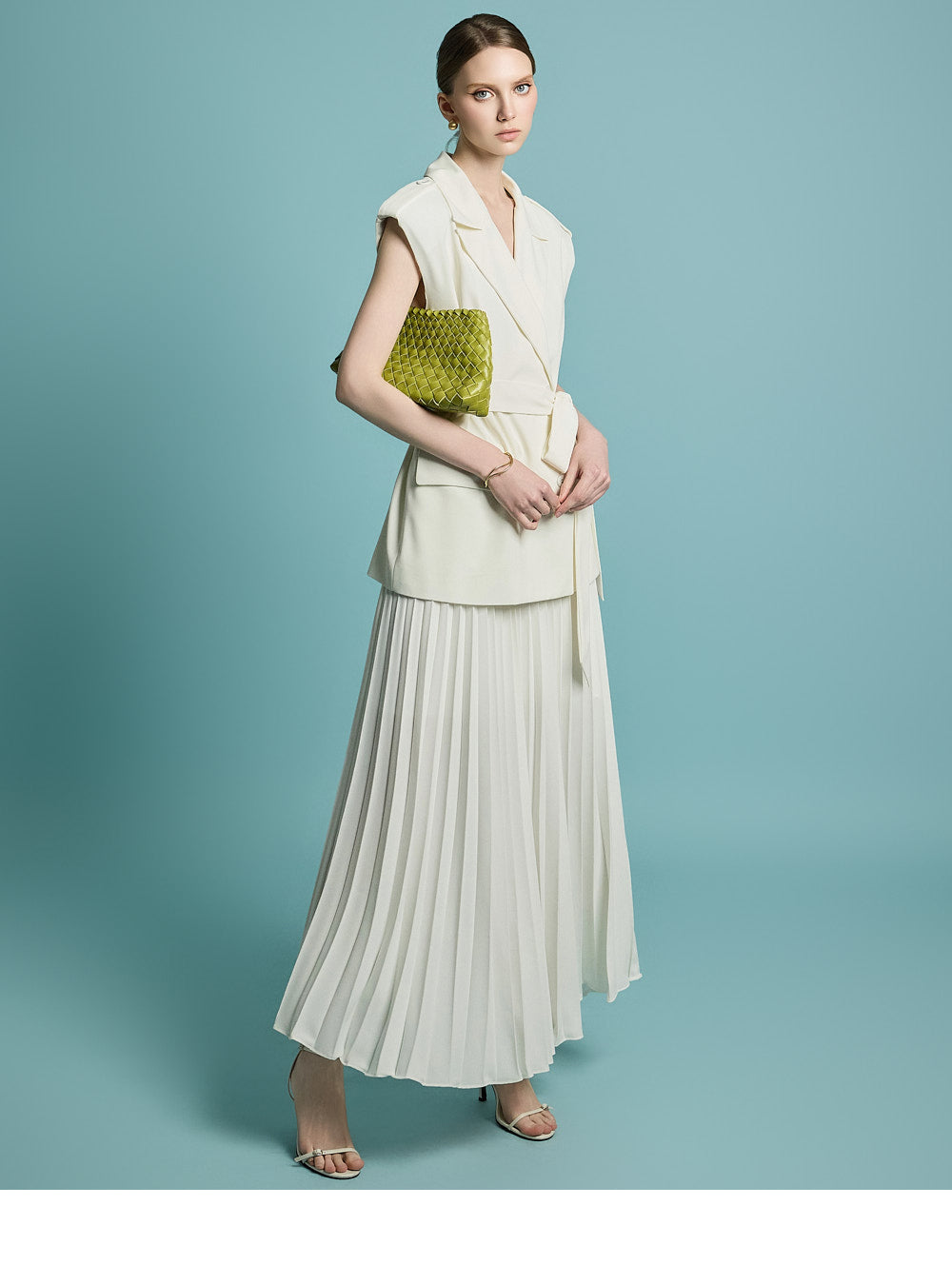 模特身高 174 厘米,穿着均码象牙色服装。