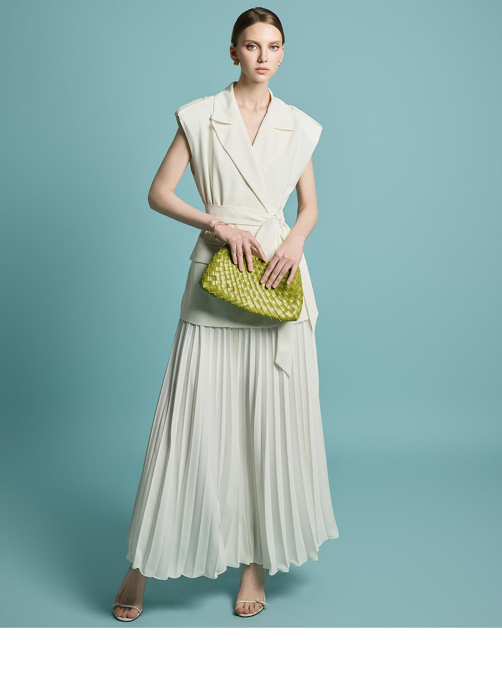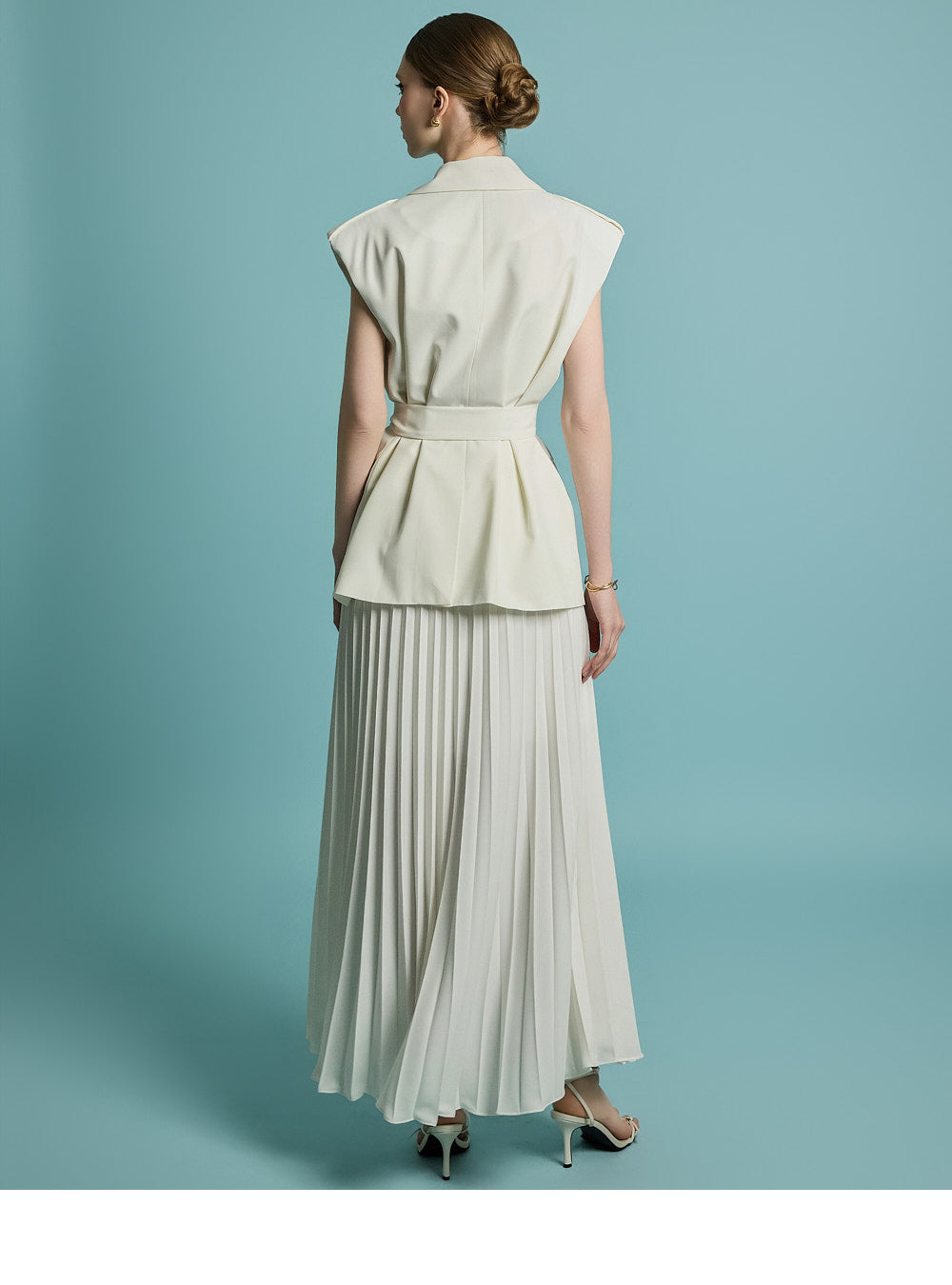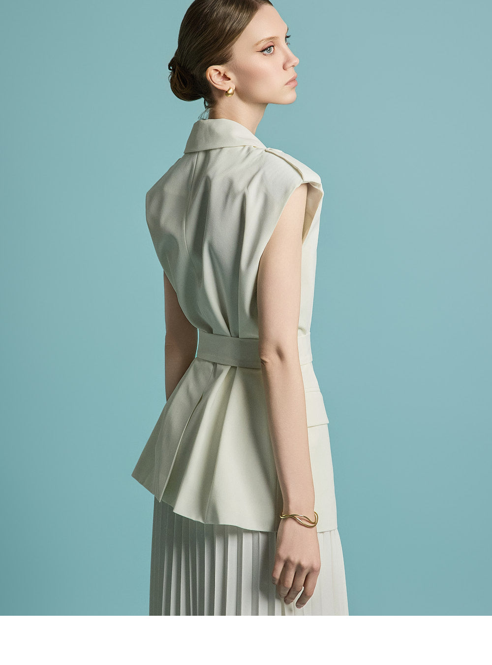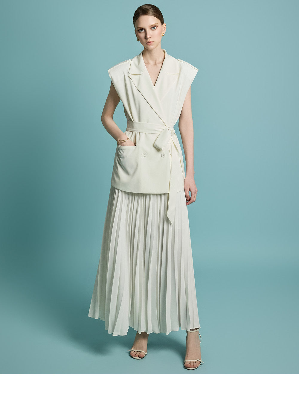 模特身高 174 厘米,穿着均码象牙色服装。