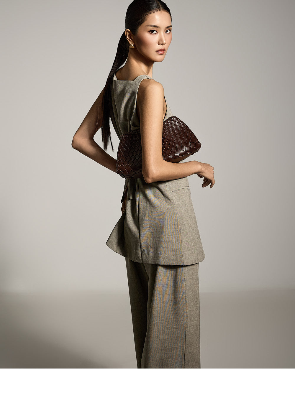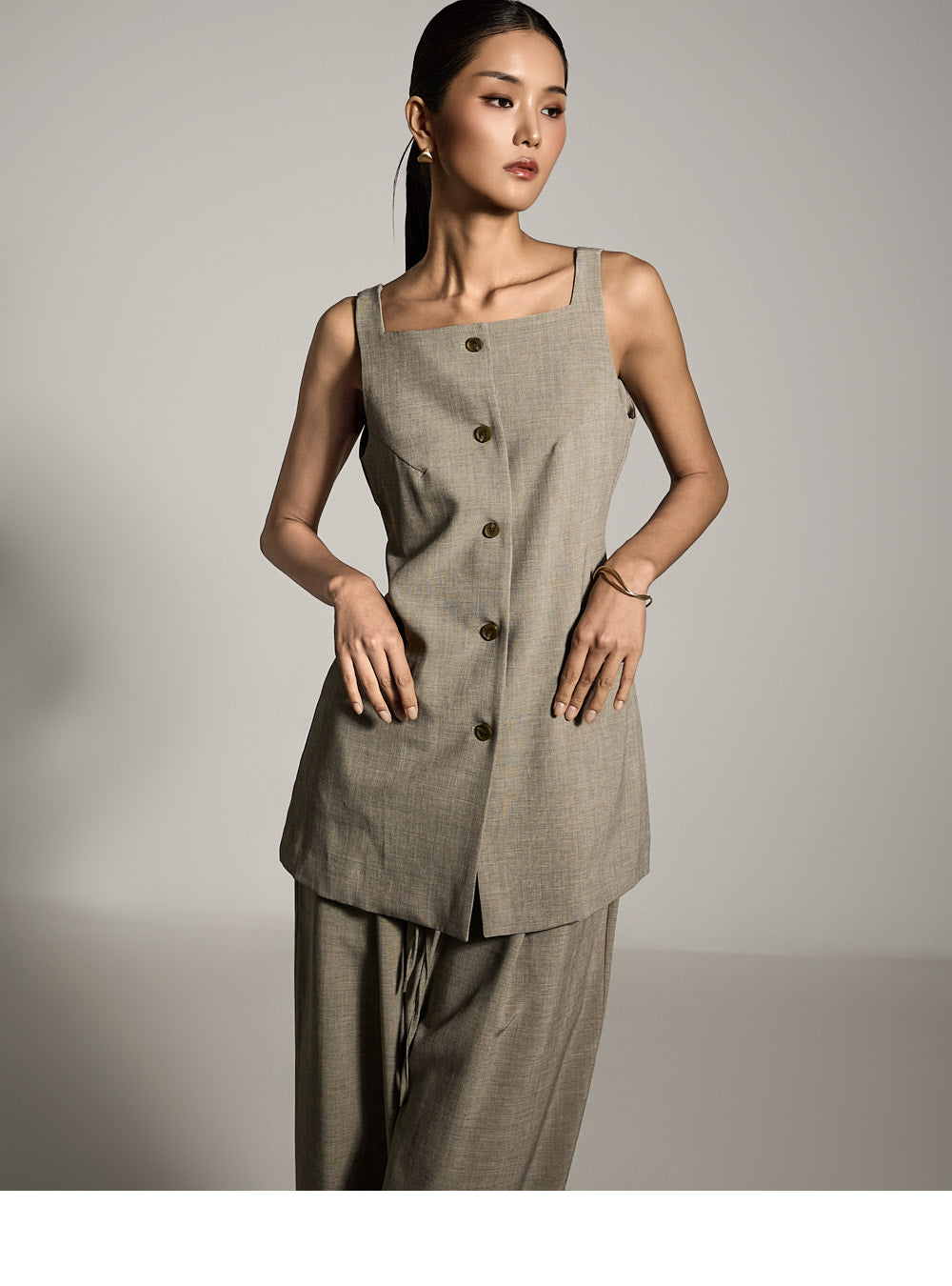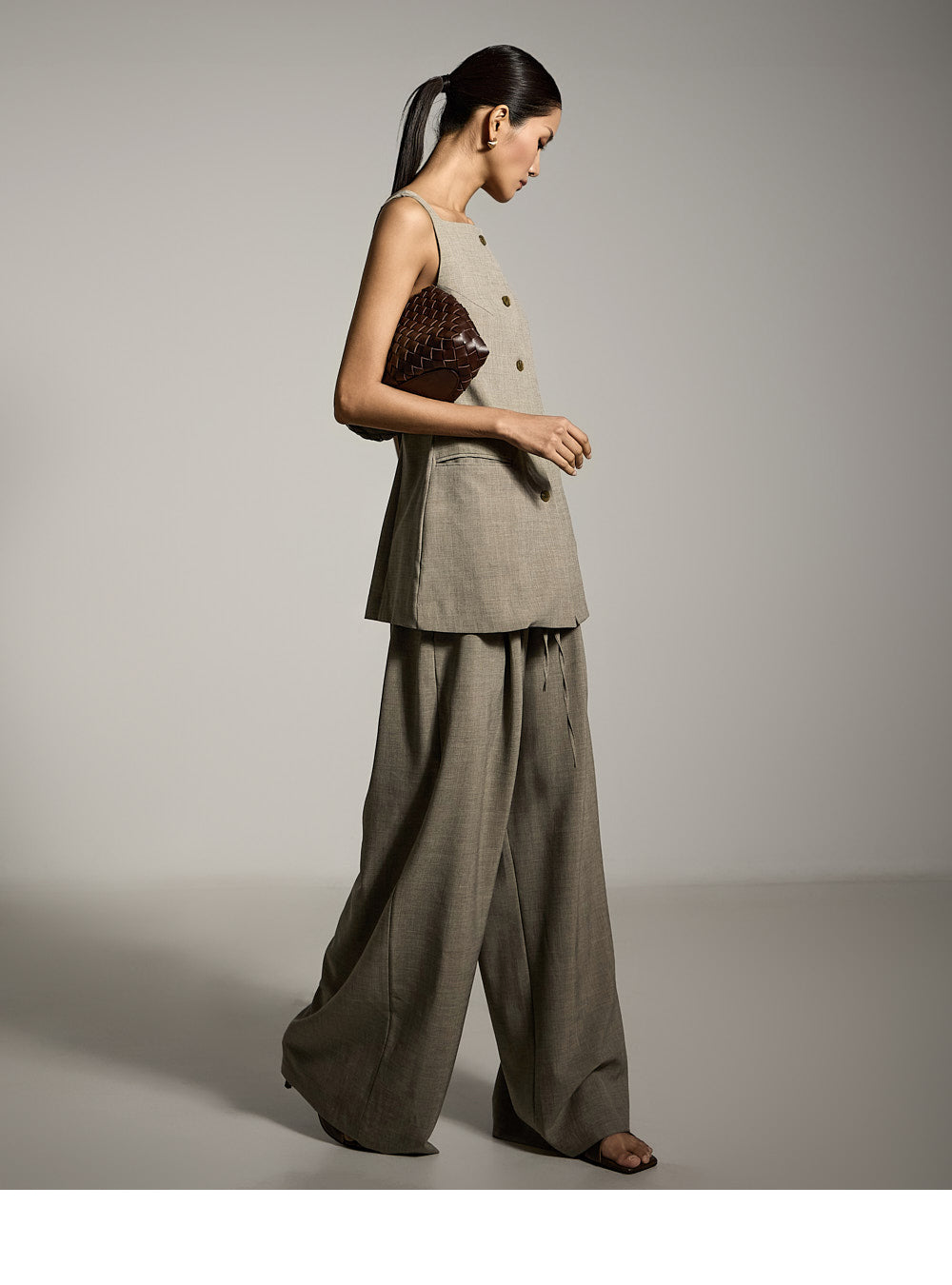 修长的廓形自然地修饰着身材,