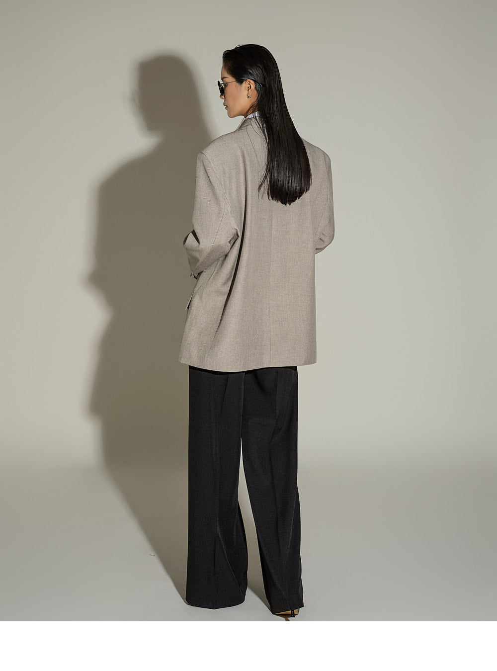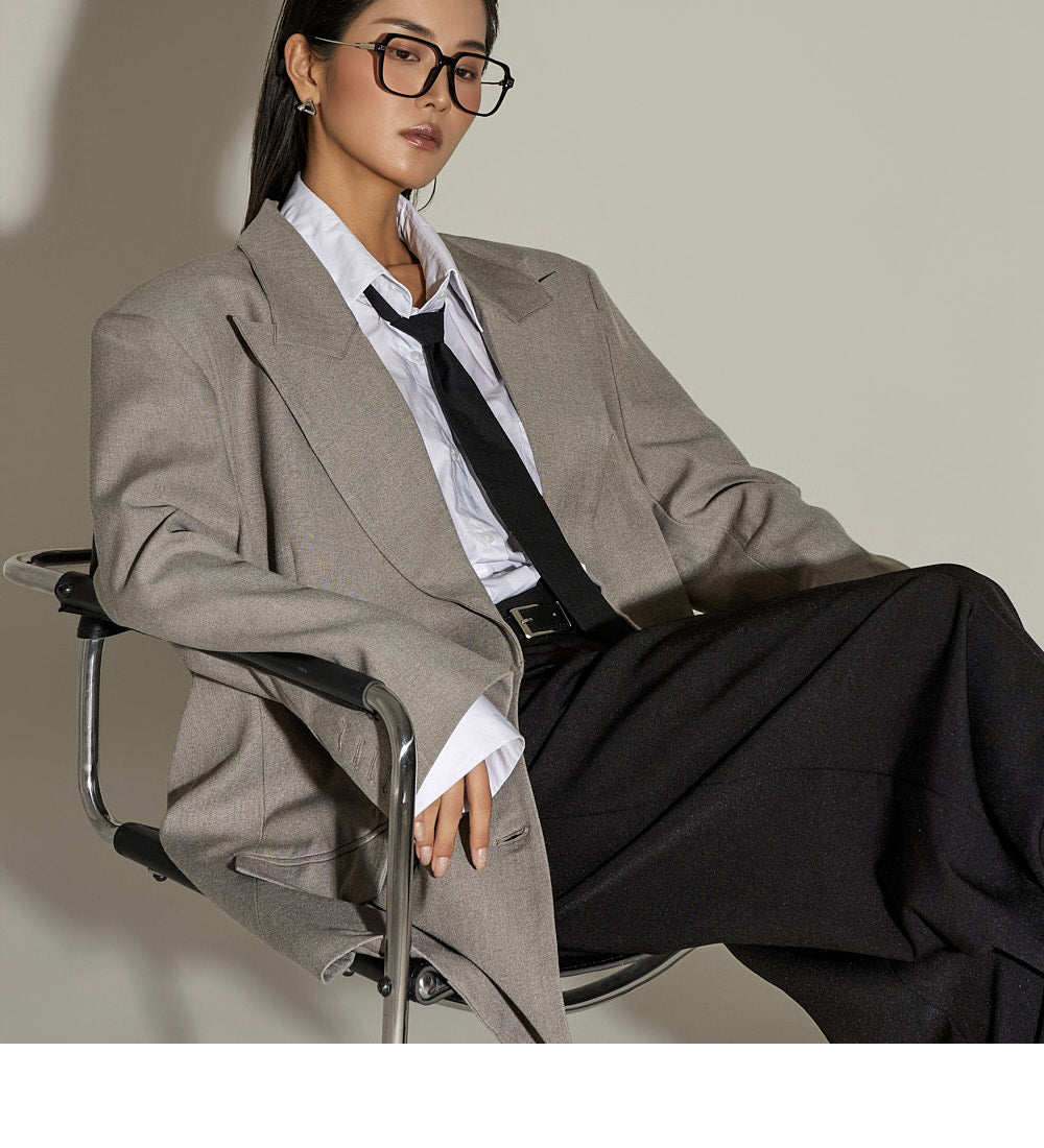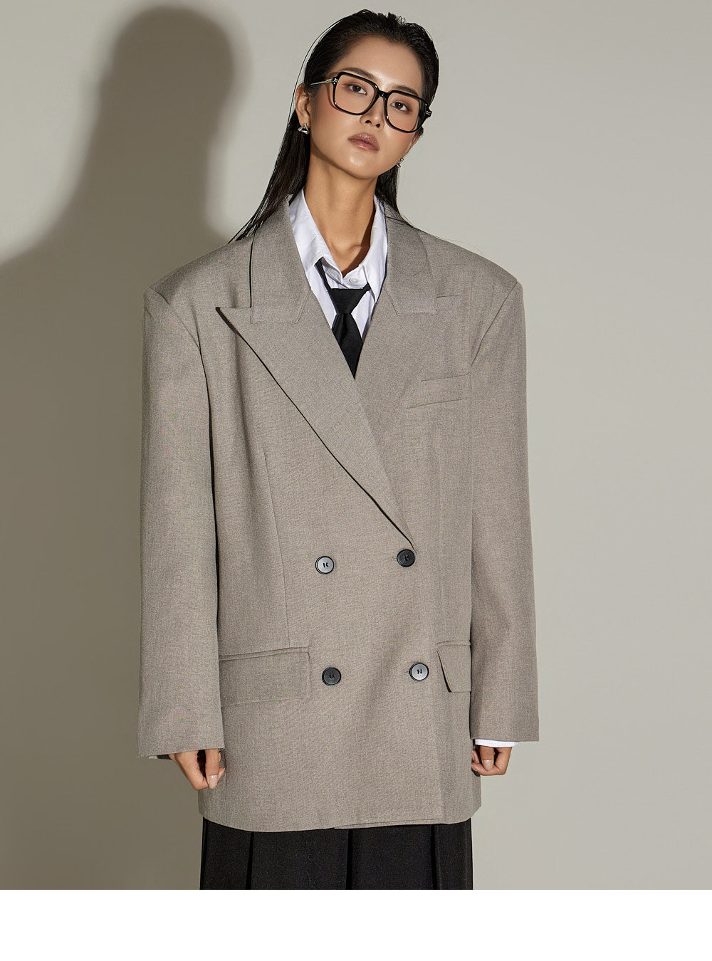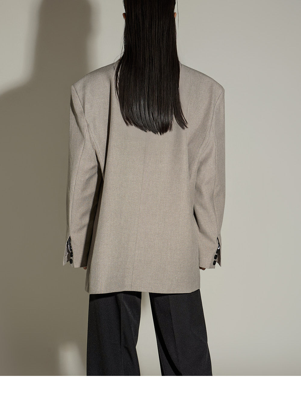 The loose, oversized silhouette and double-button design