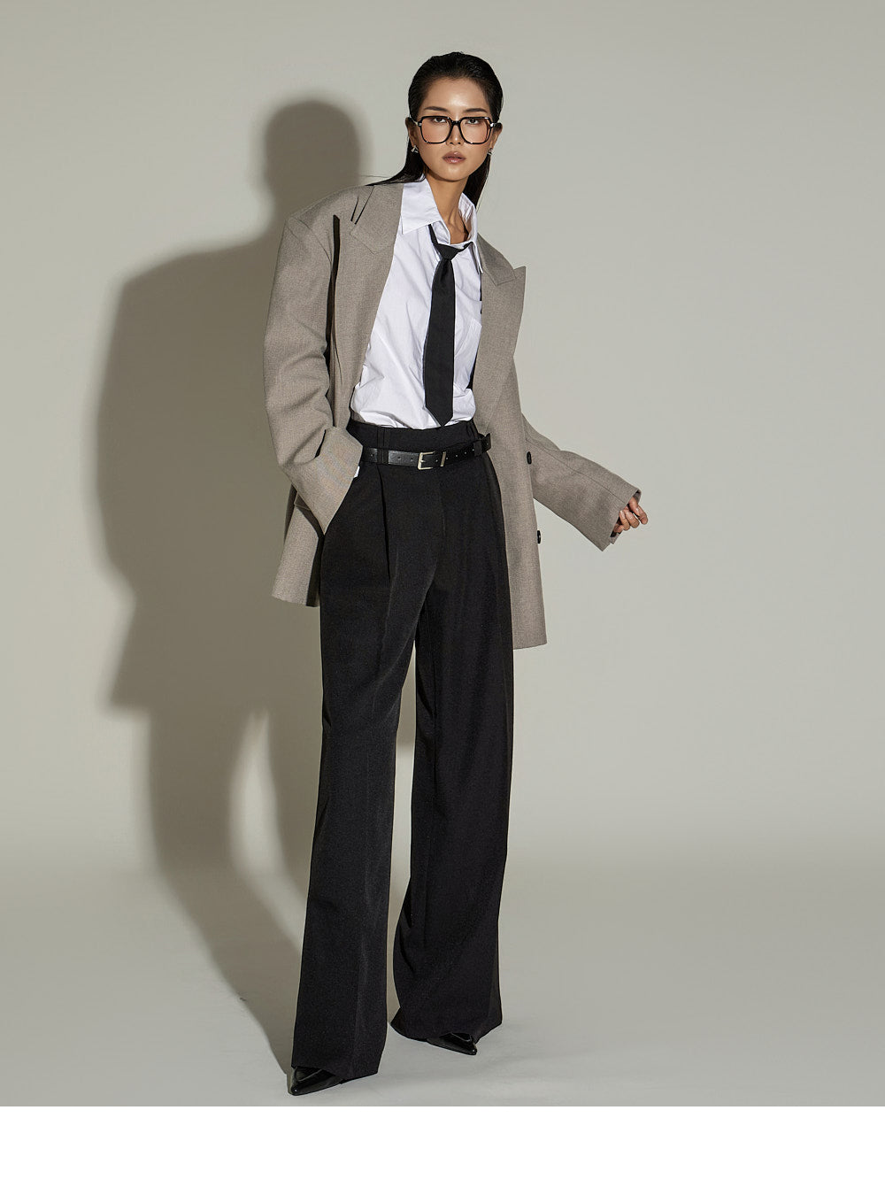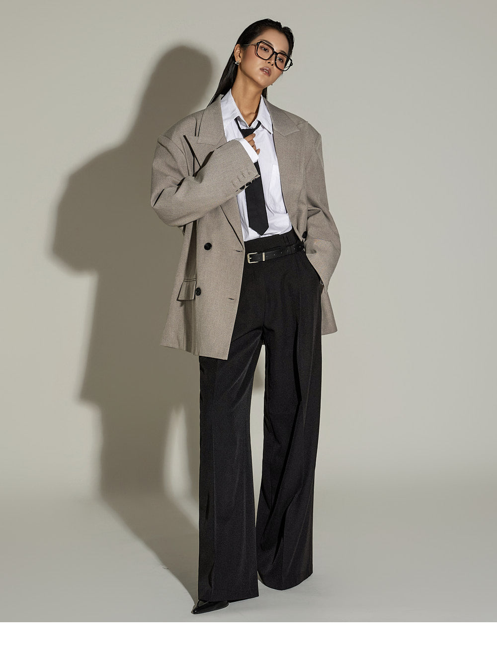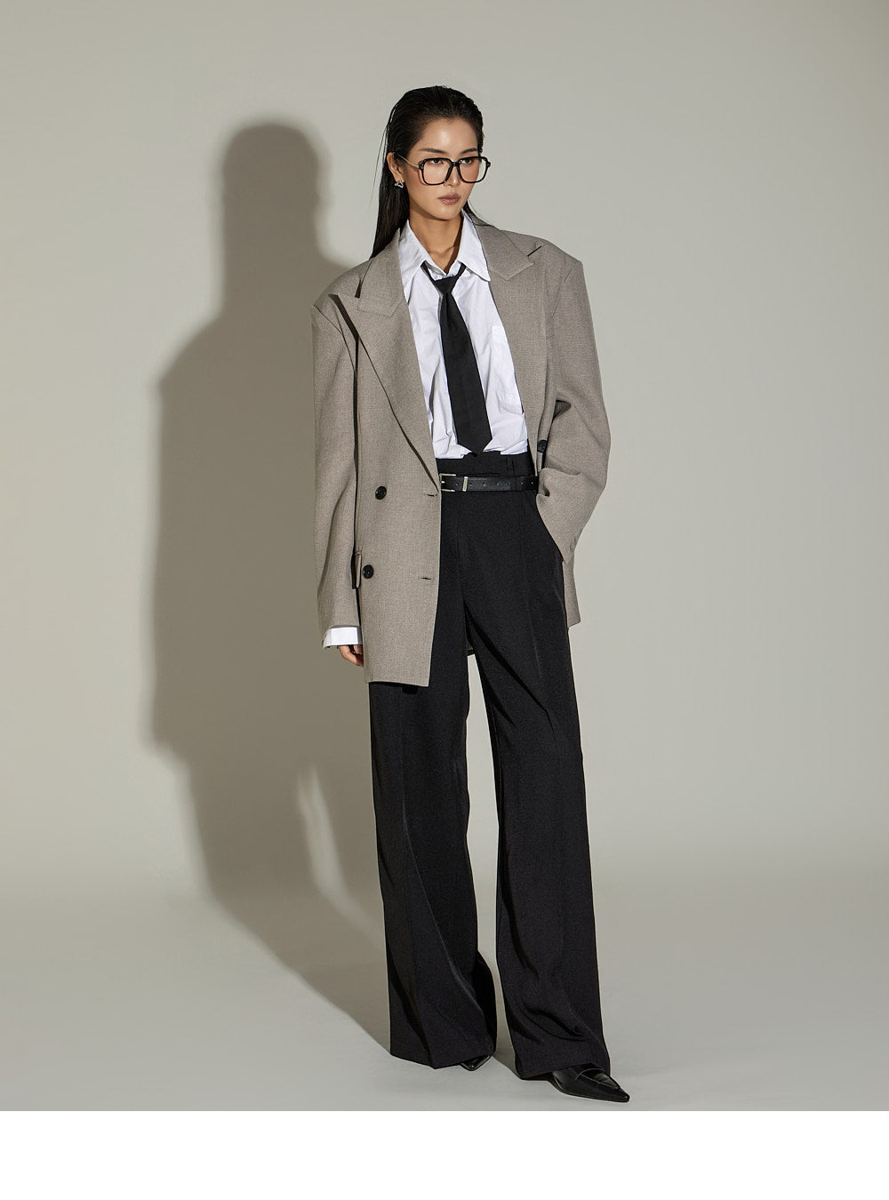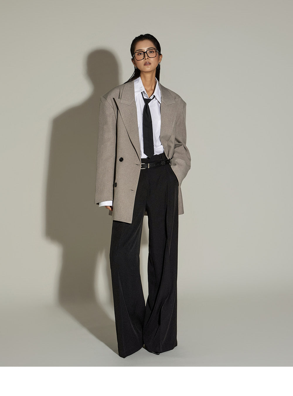 The loose, oversized silhouette and double-button design
