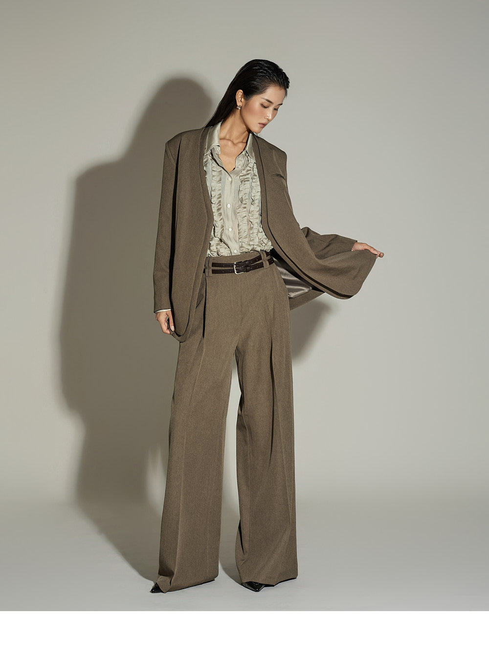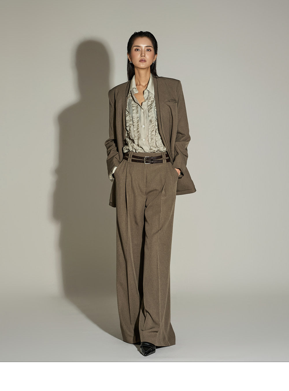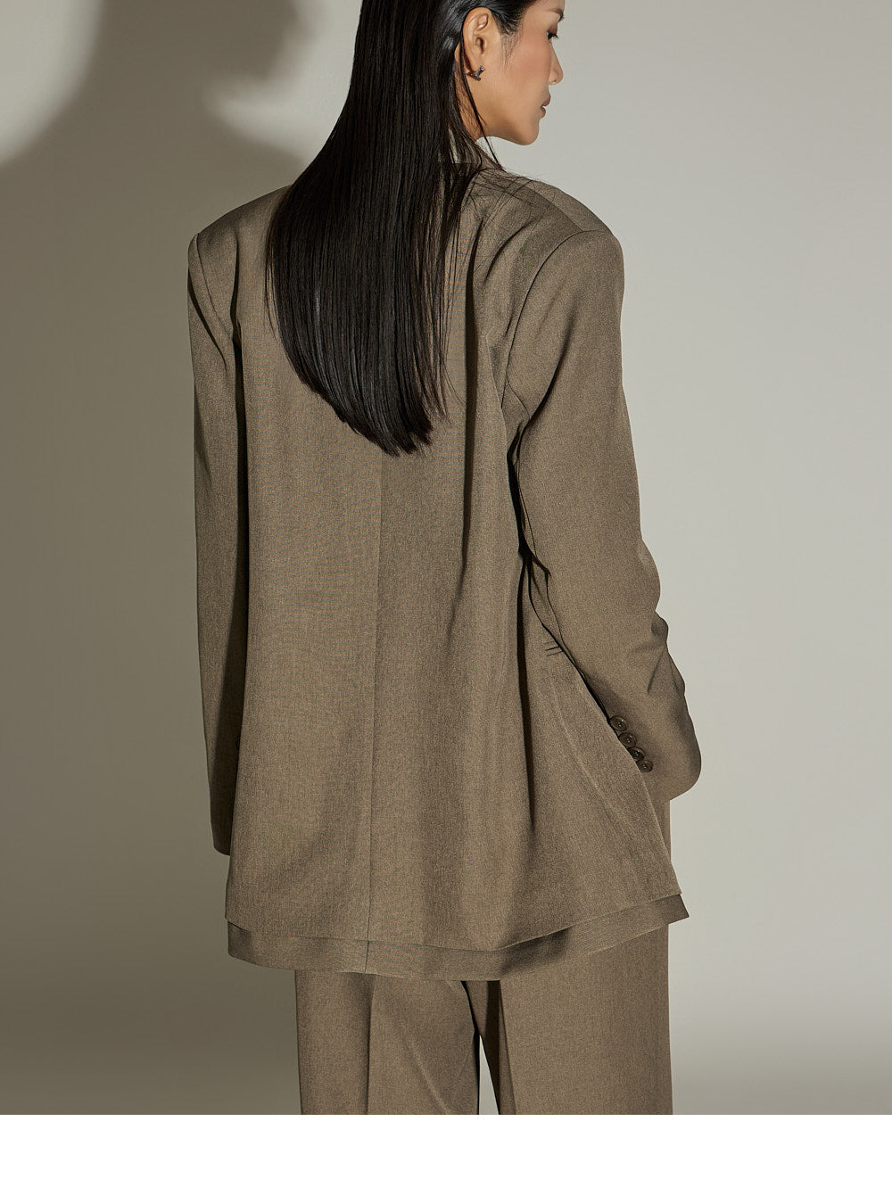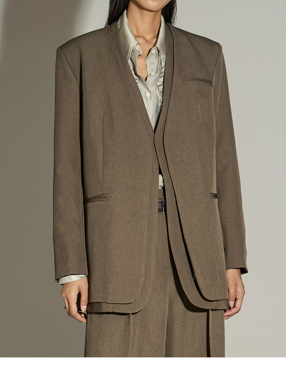 The jacket features a clean finish with no fastenings, slits, or elastic,
