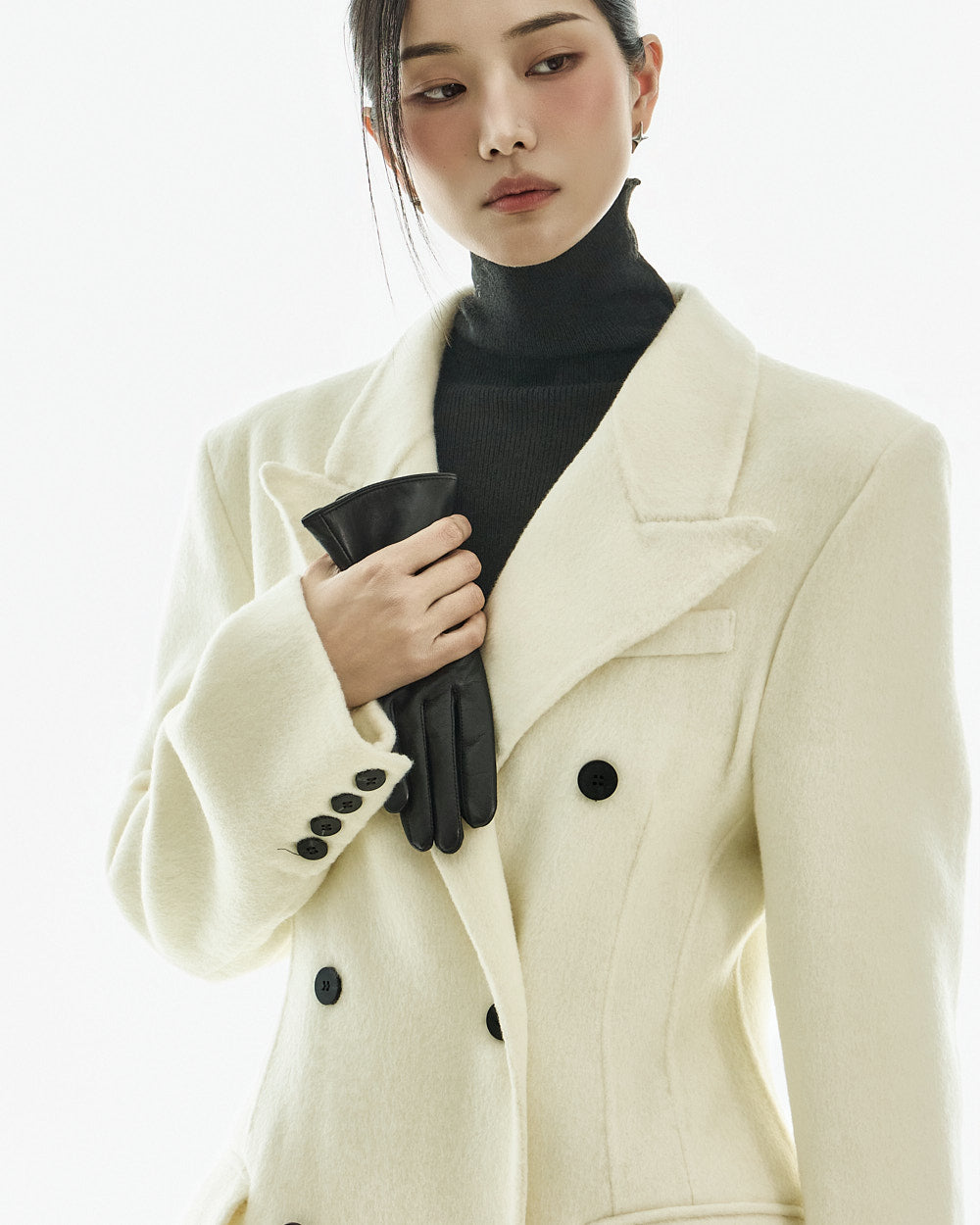 The tailored collar and double-breasted front button detail create a refined look,