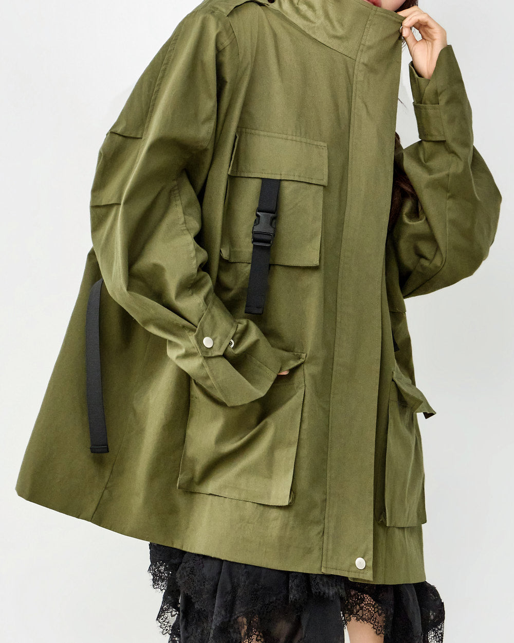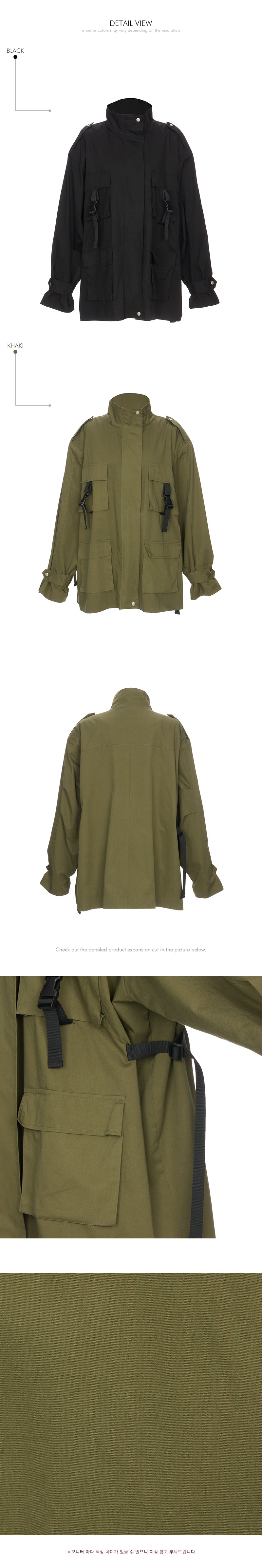 The front zipper and snap button closure, and four pockets
