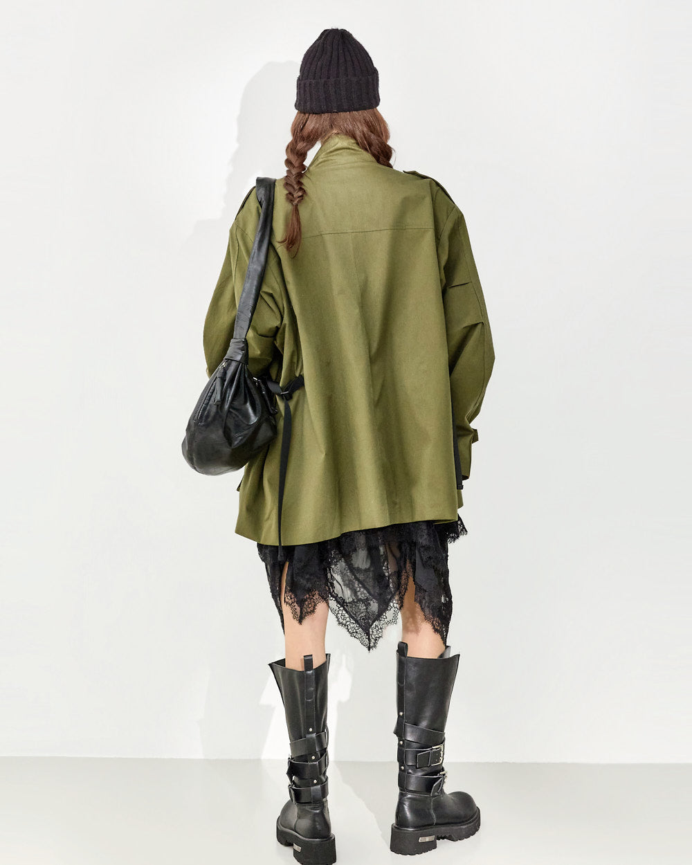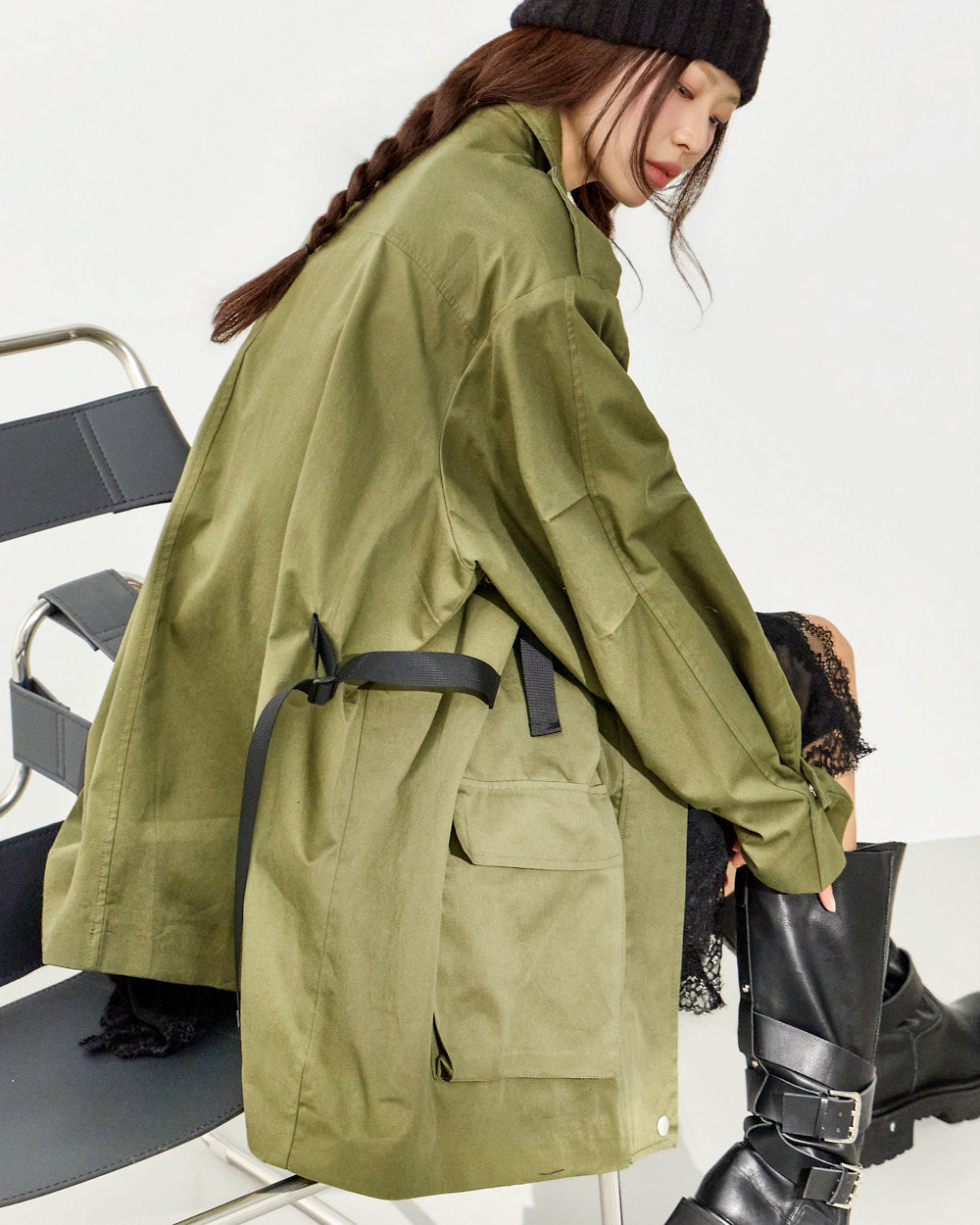 The 171cm model is wearing size one in Khaki.