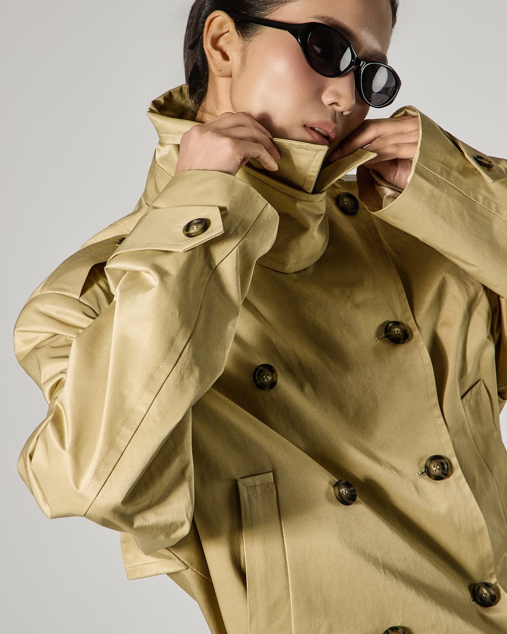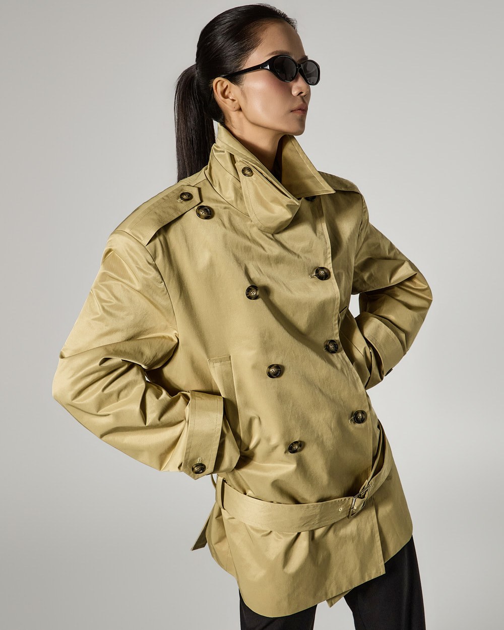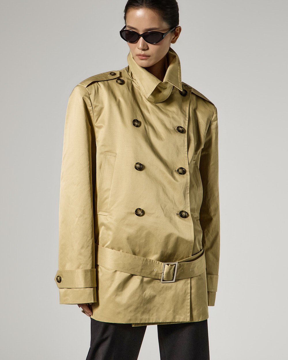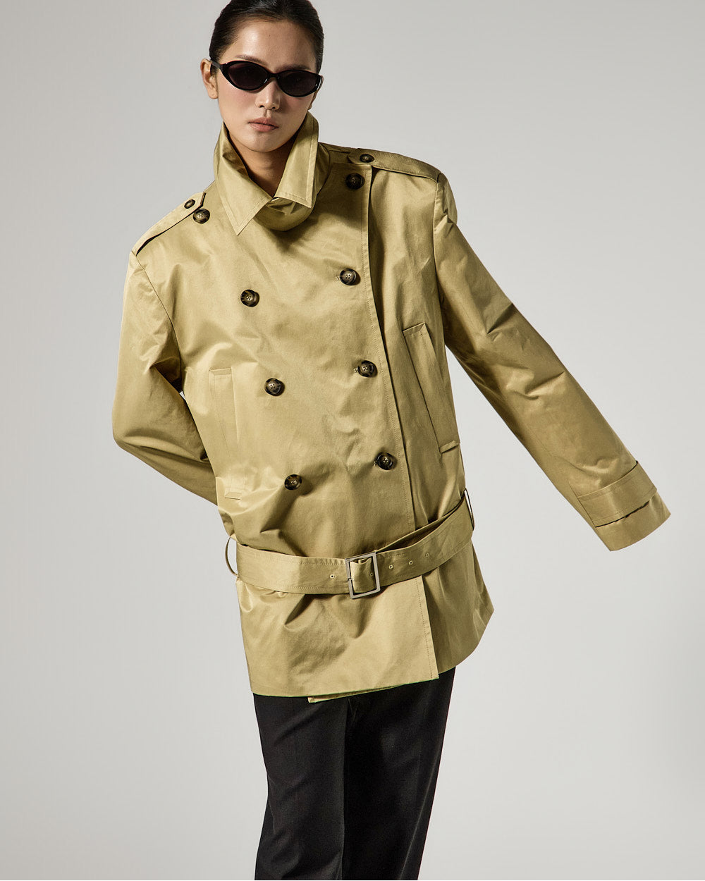 and the high neck design creates a classic, trench-like vibe.