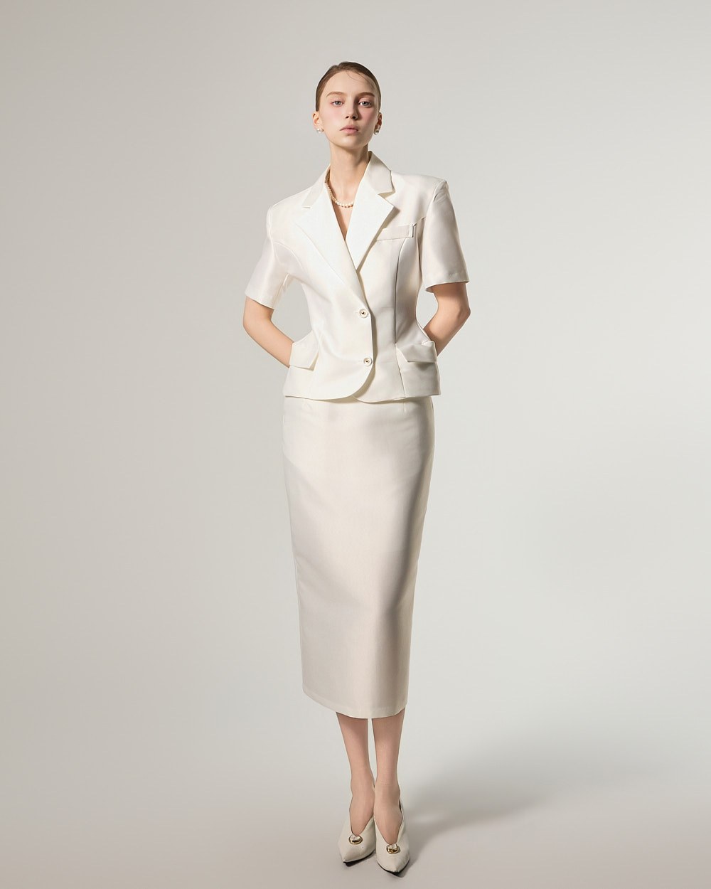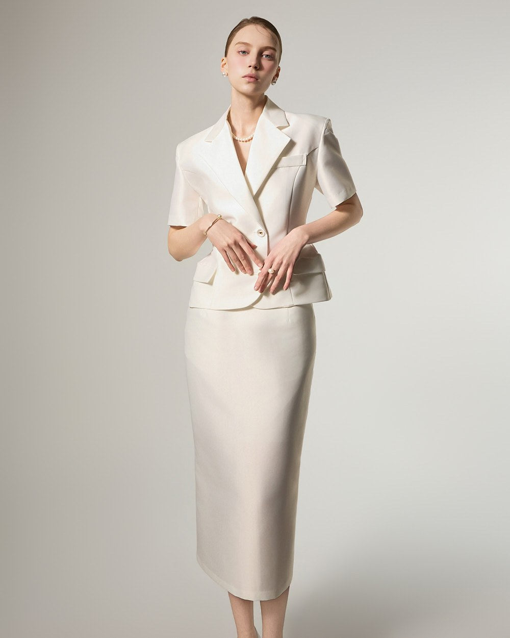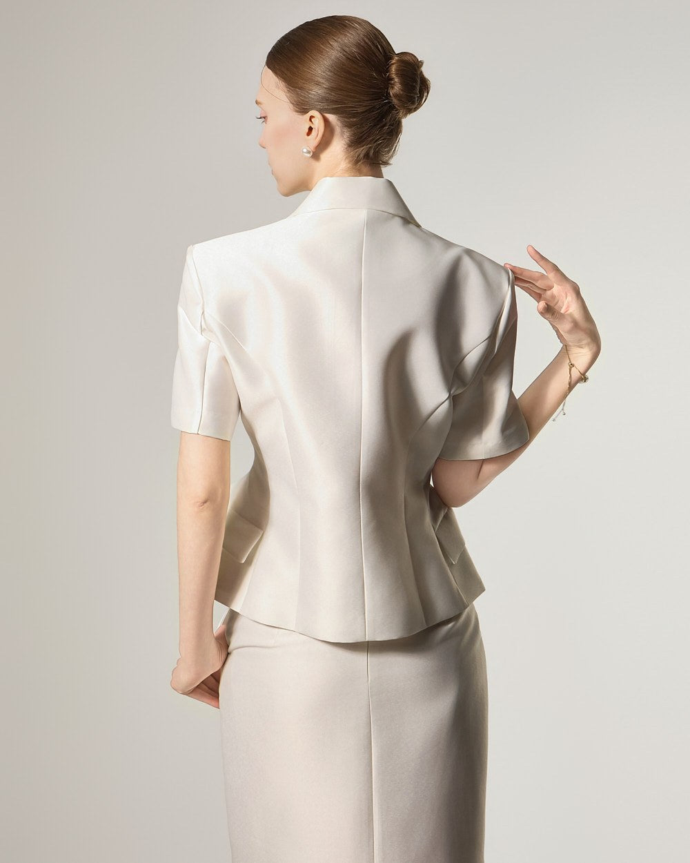 西装式夹克的设计特色是短袖,增添了简洁的美感。