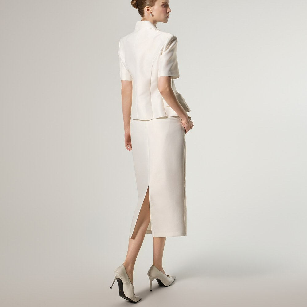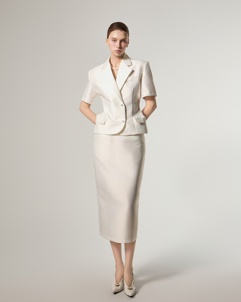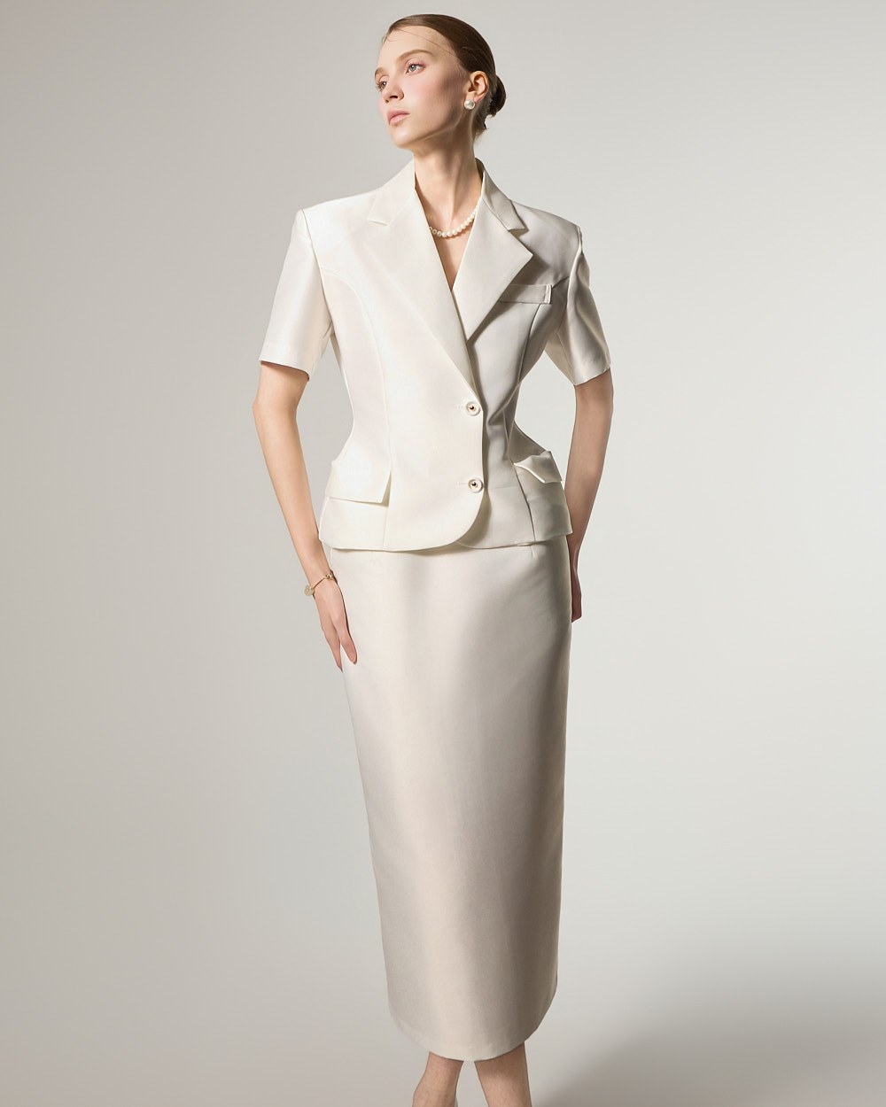 西装式夹克的设计特色是短袖,增添了简洁的美感。