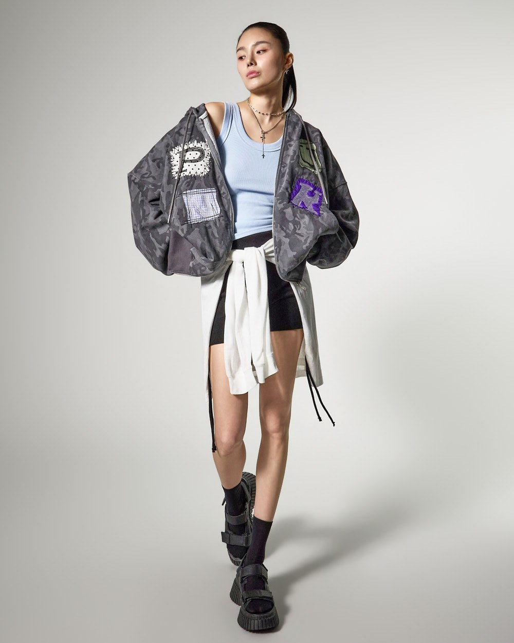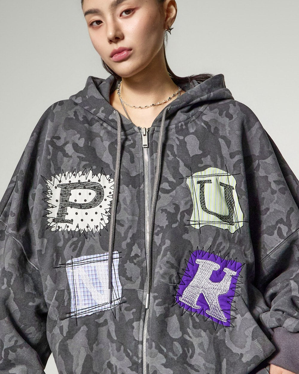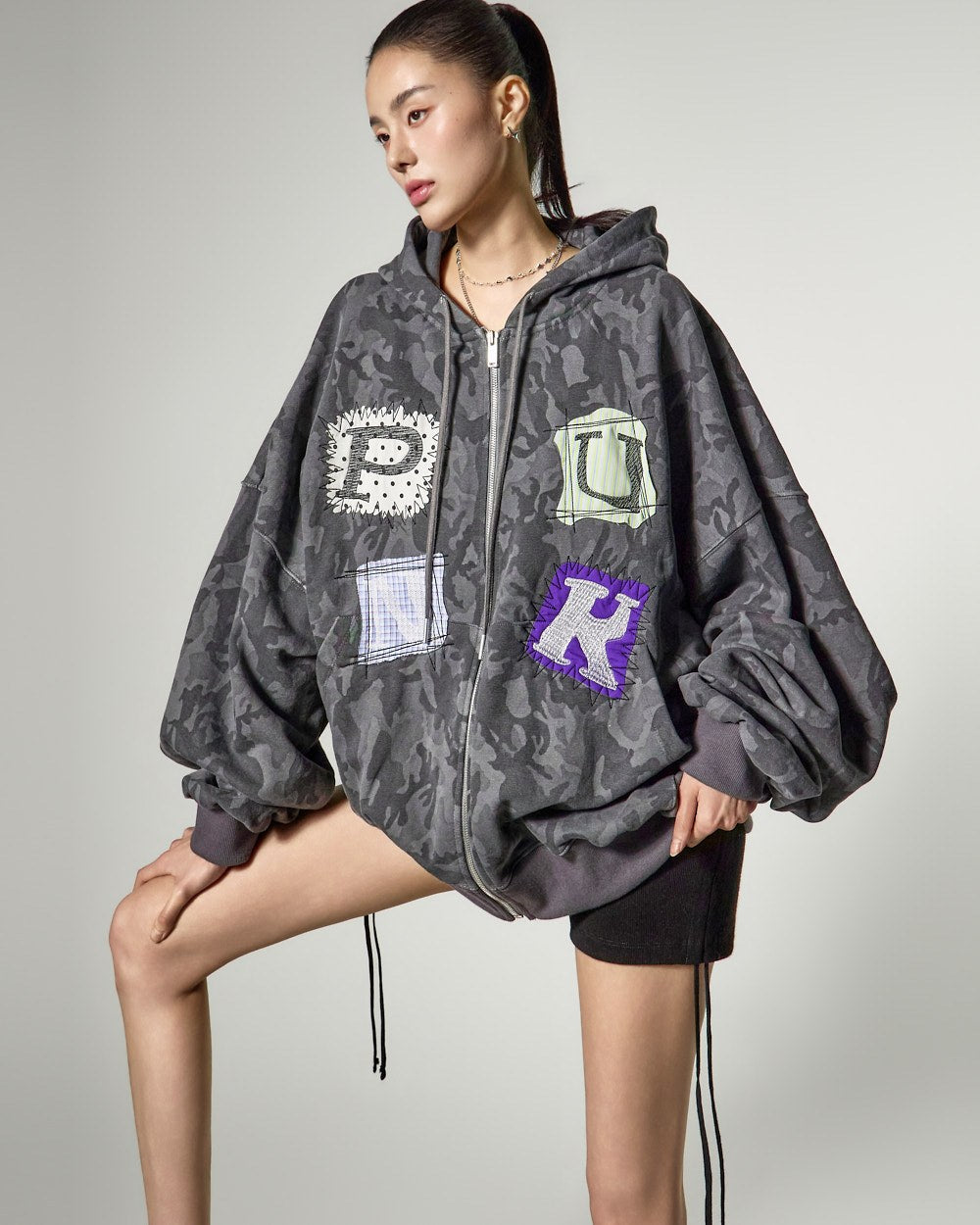 这是一款休闲印花设计的超大连帽拉链衫。