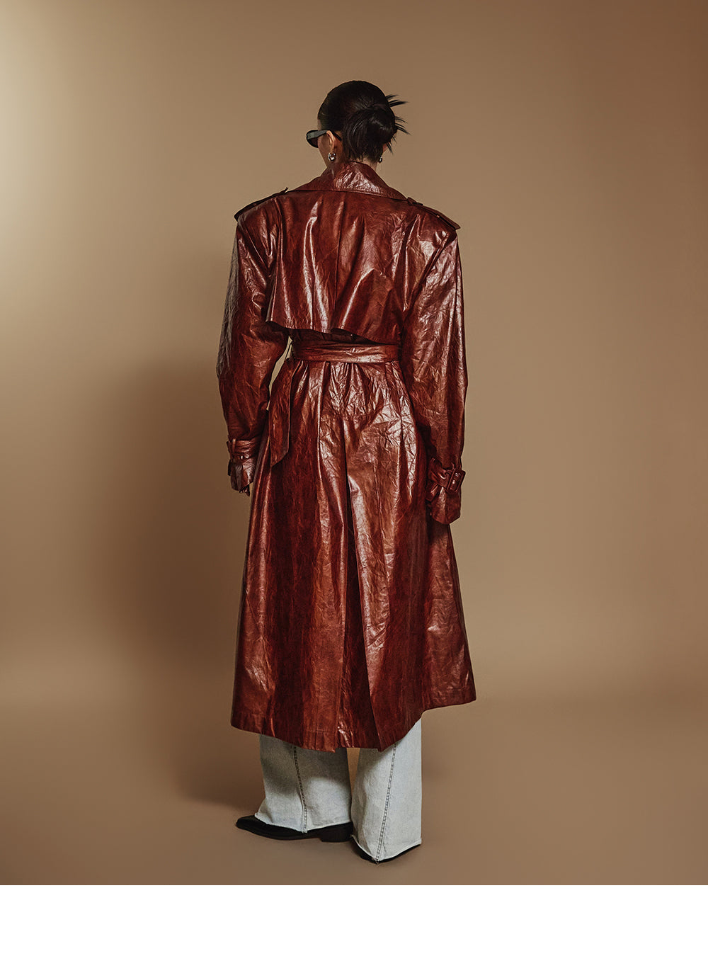 其宽大的轮廓和腰带组合营造出精致的阳刚外观,??
