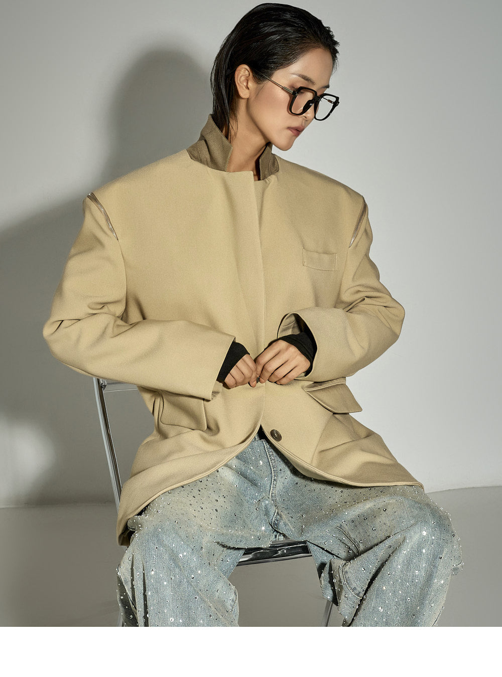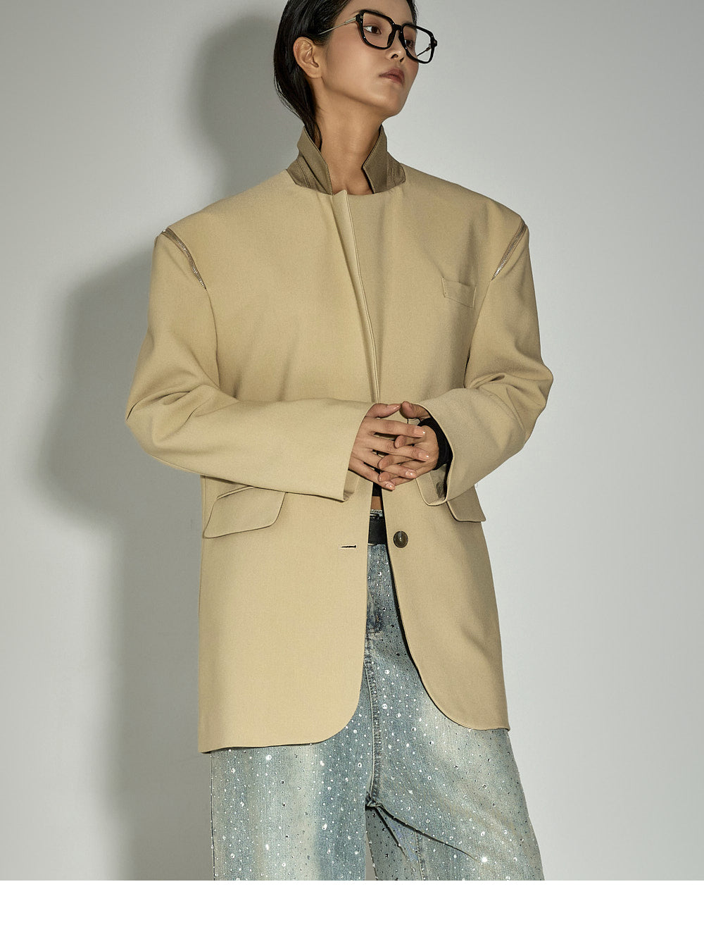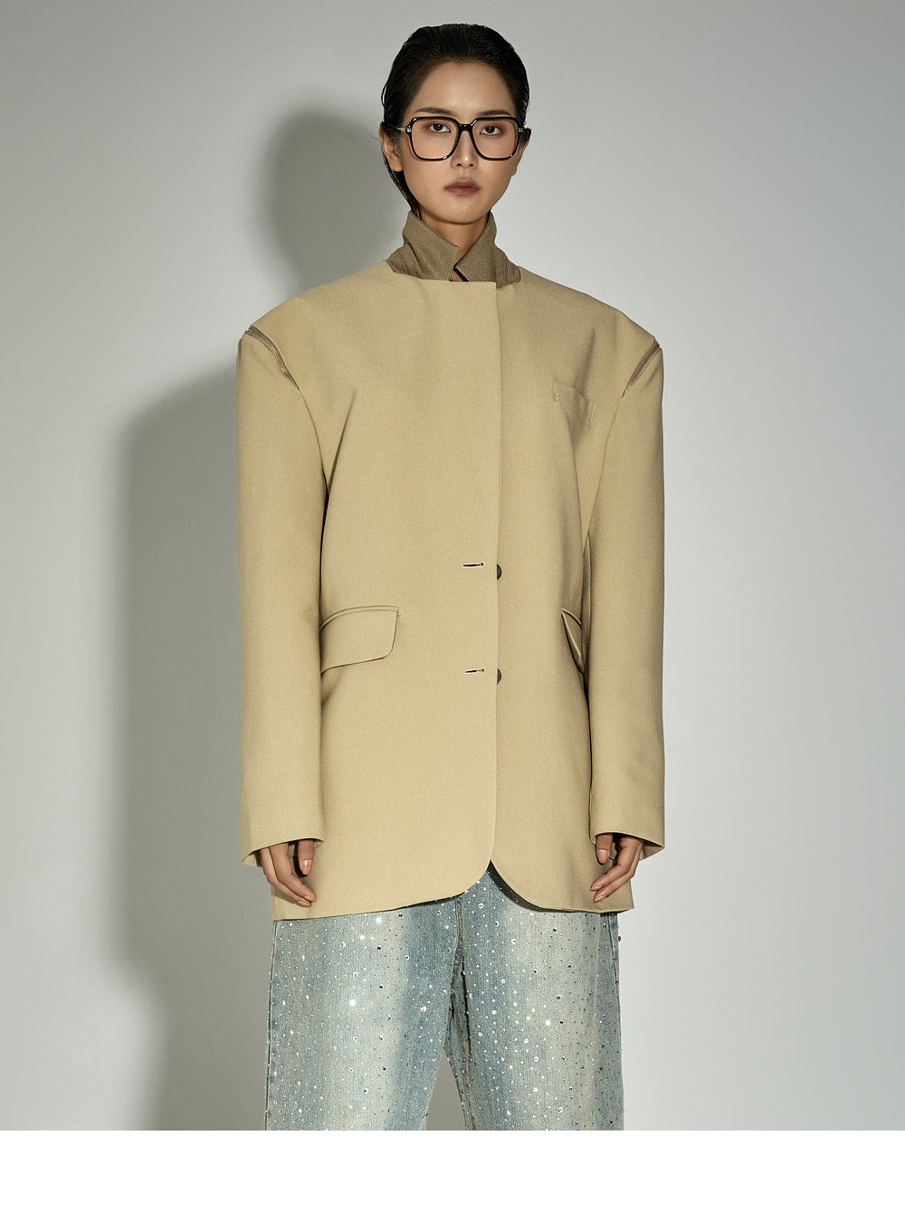 Zipper details on both shoulders offer a two-way styling option,