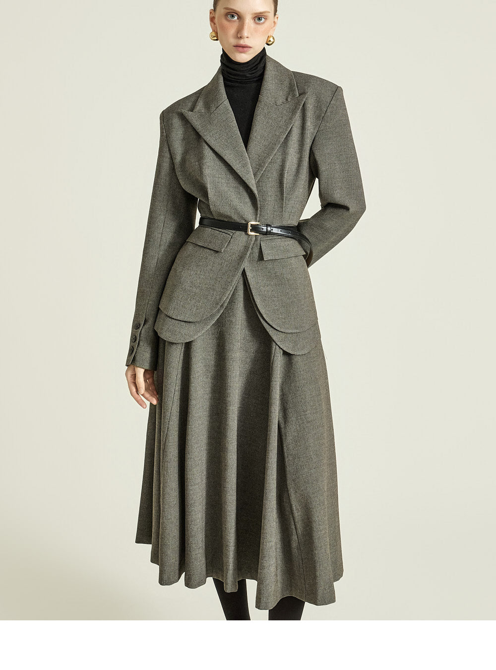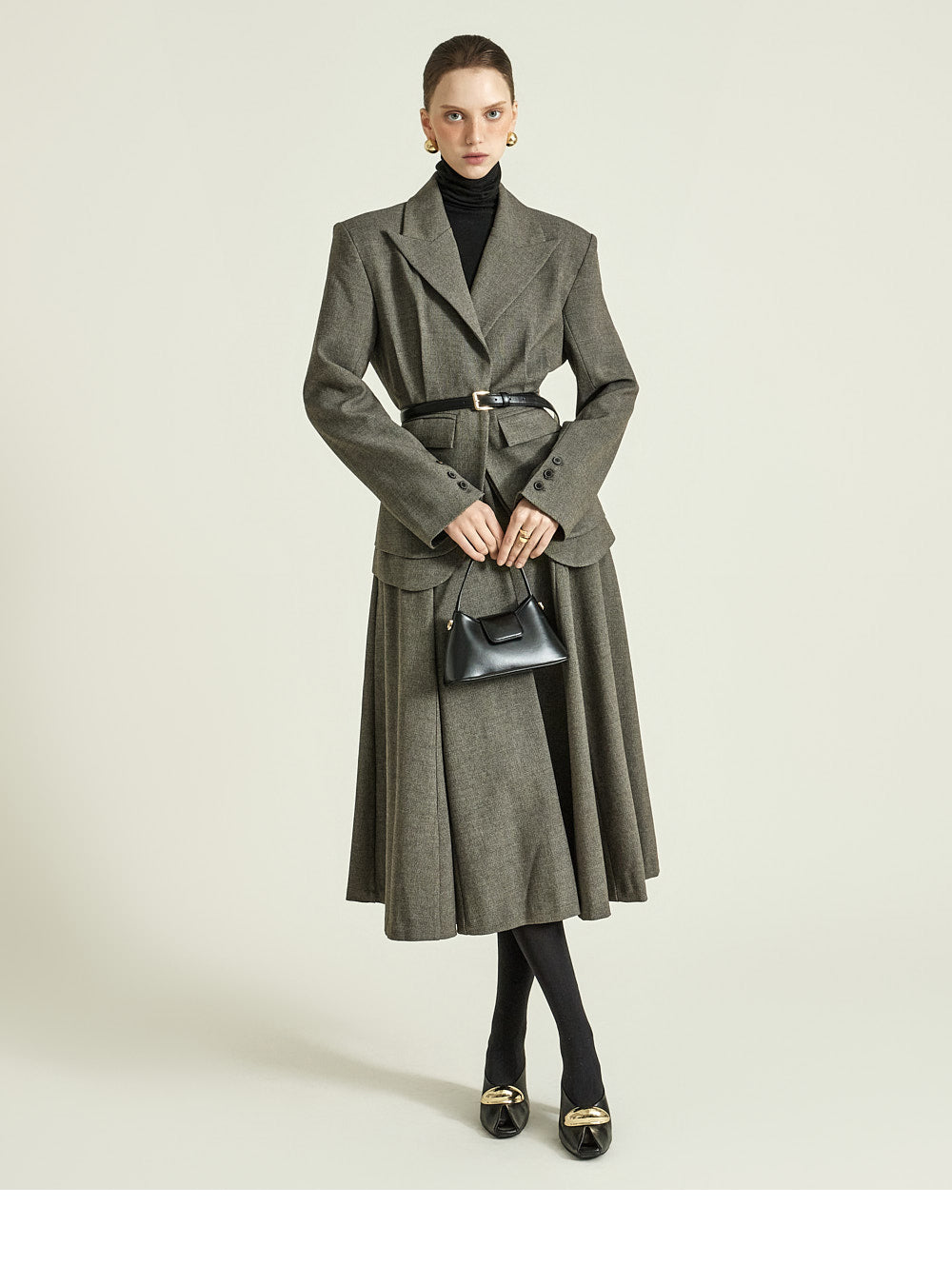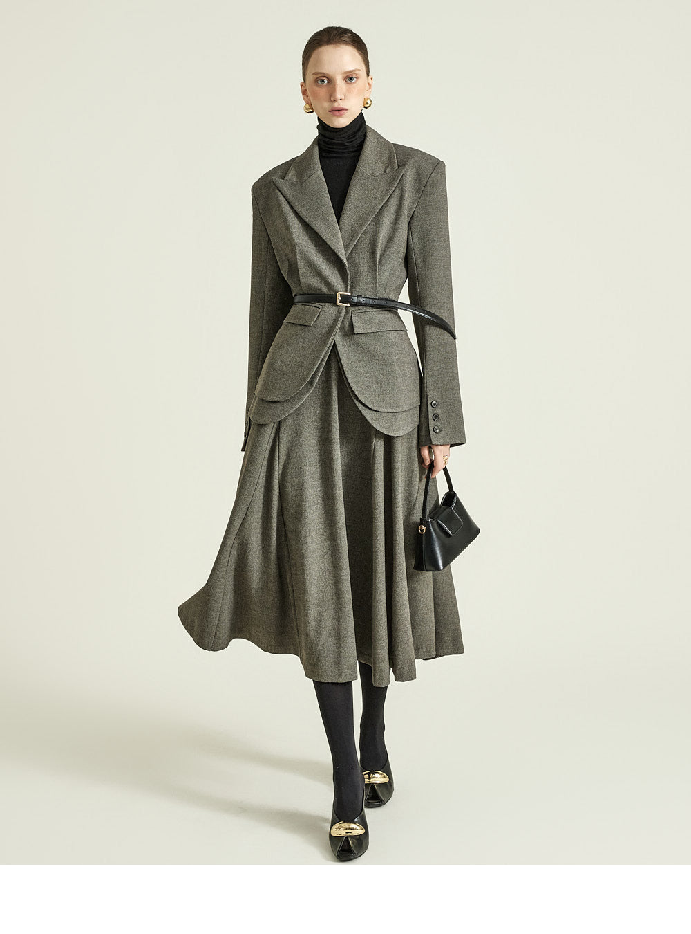 while the naturally cinched waist creates a sophisticated balance.