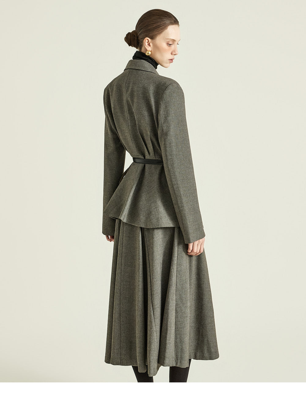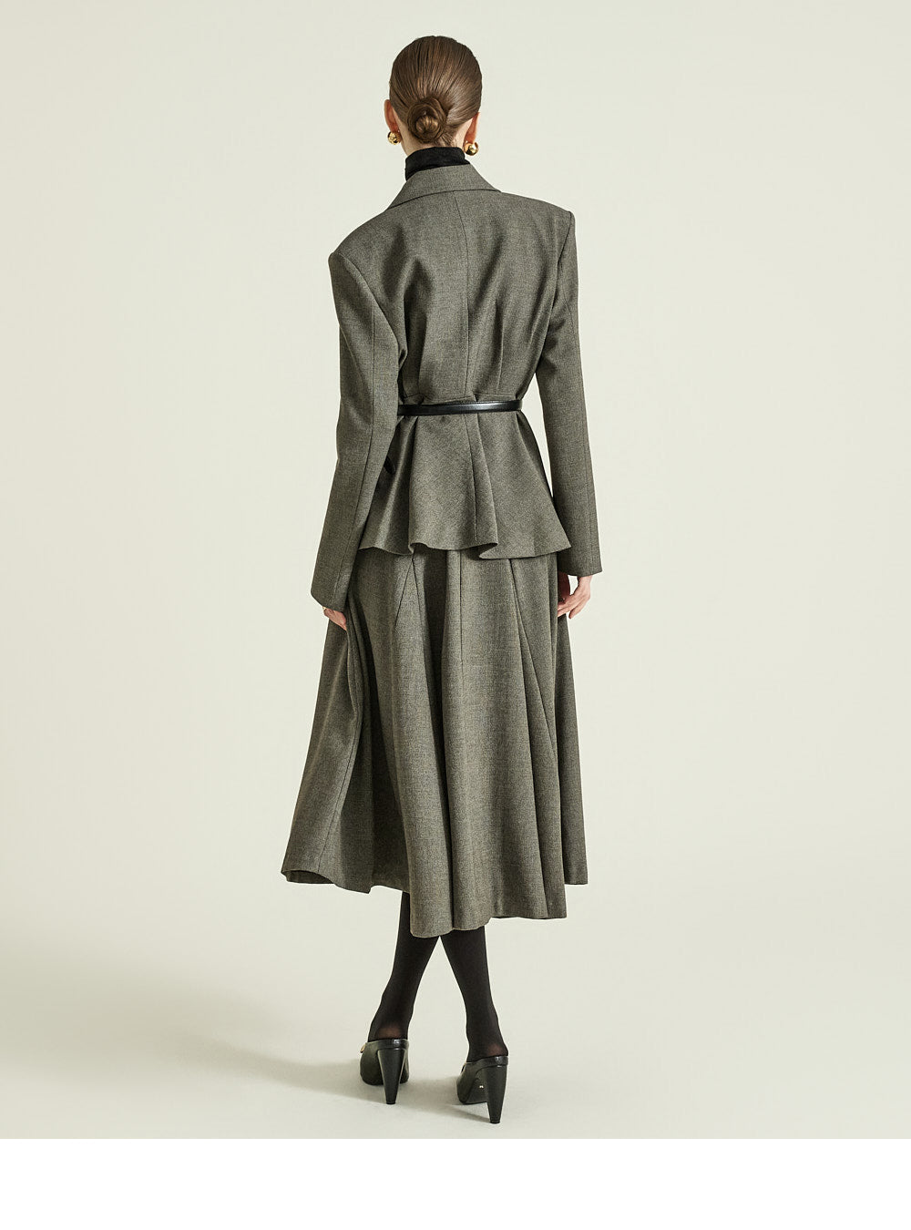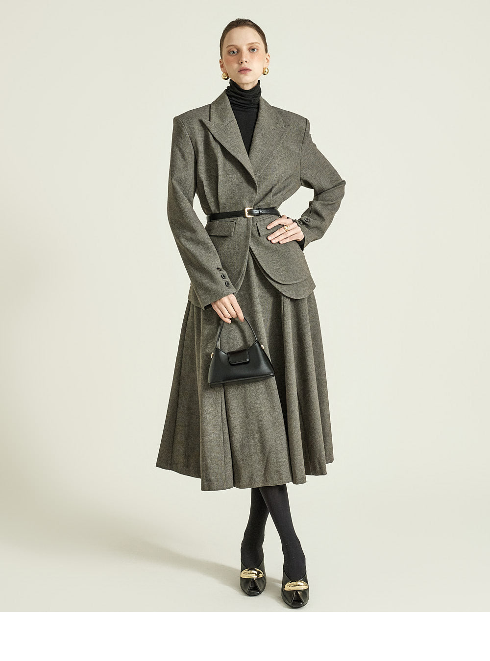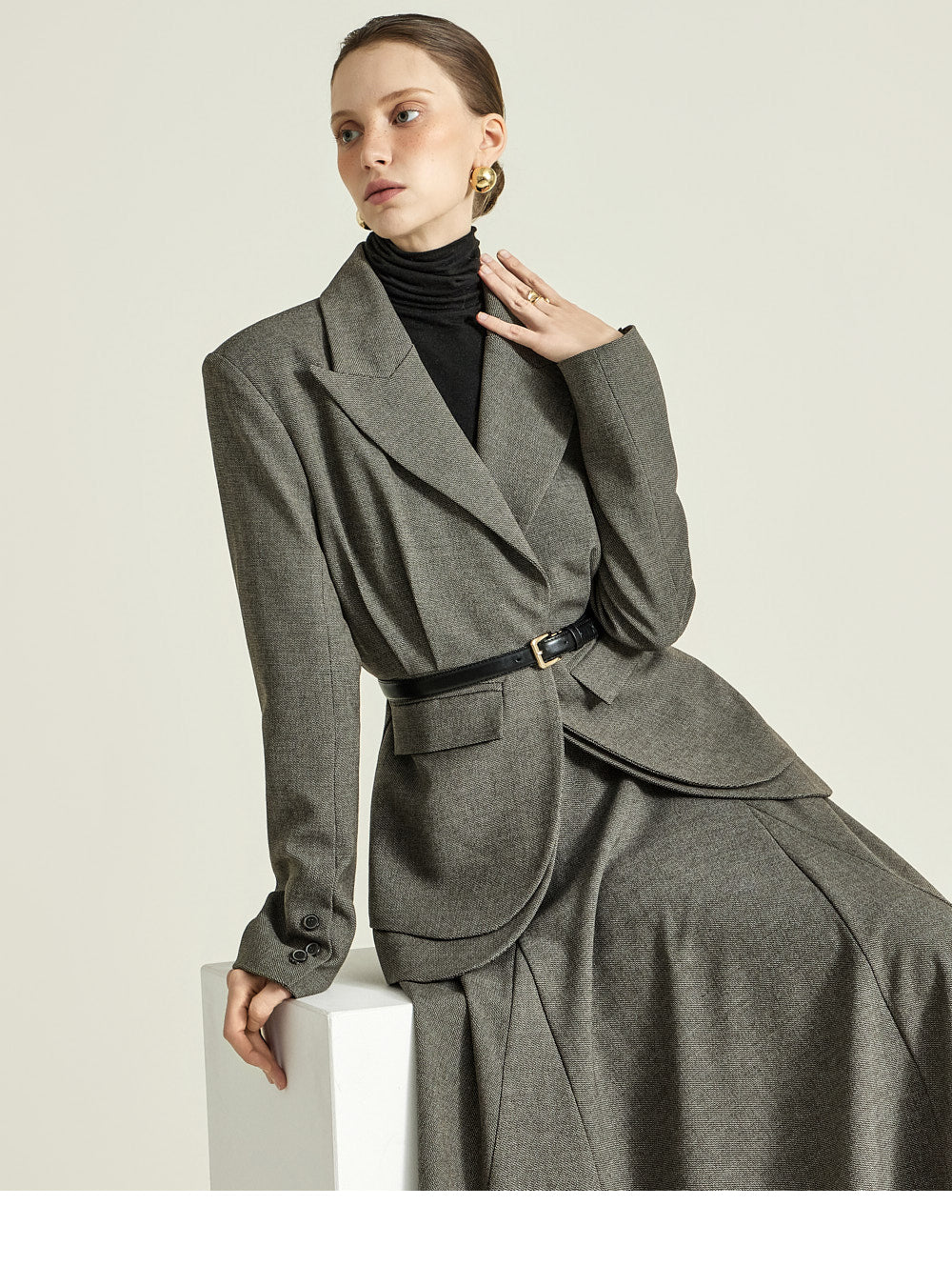 while the naturally cinched waist creates a sophisticated balance.