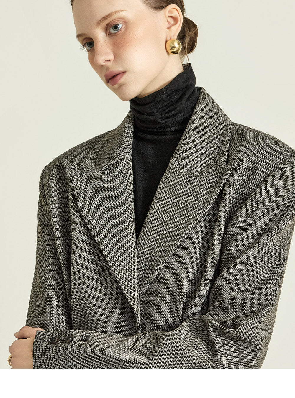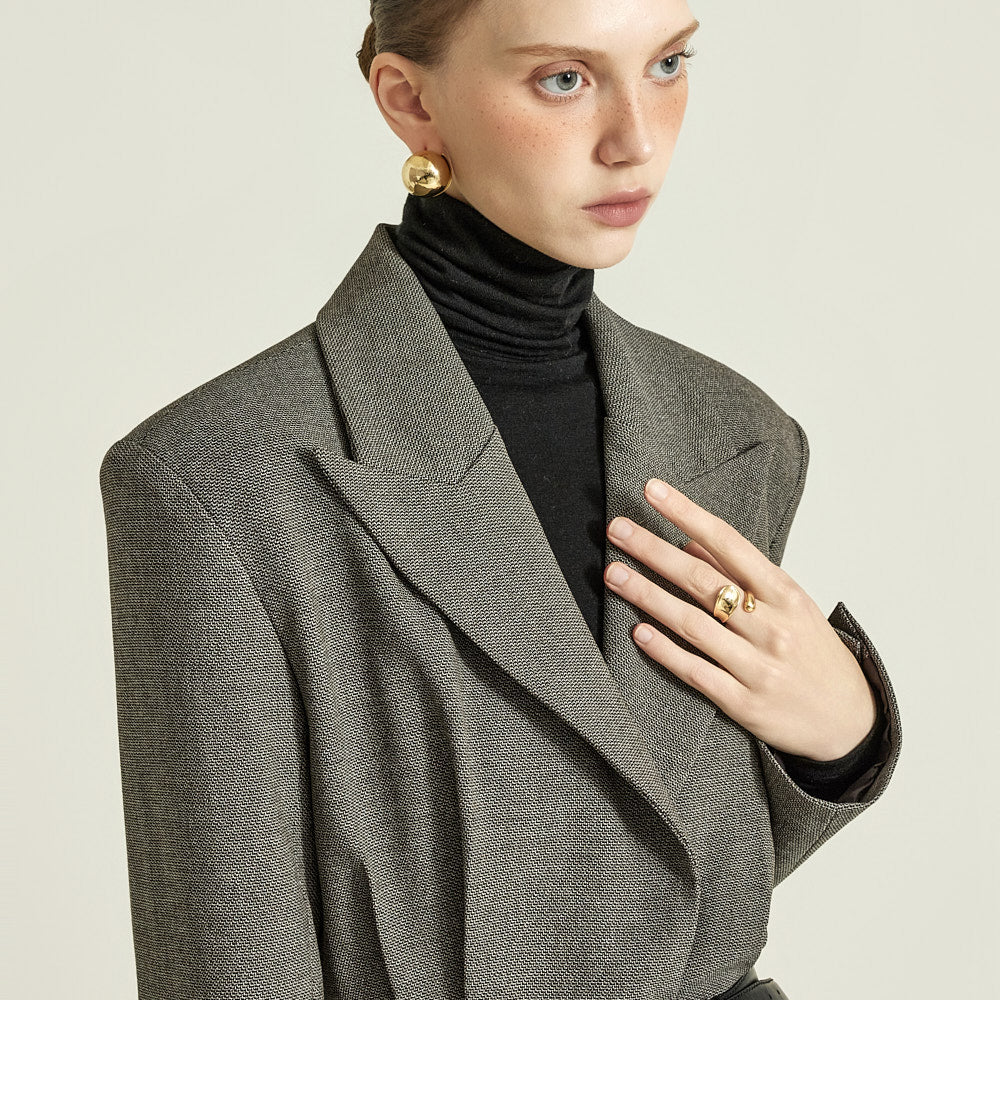 The wide lapels, understated one-button closure,