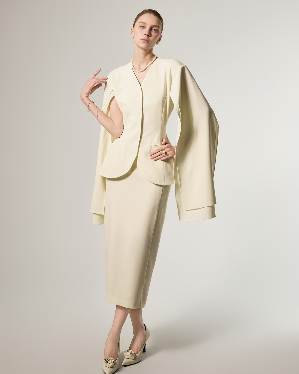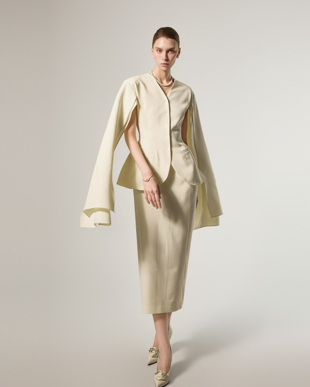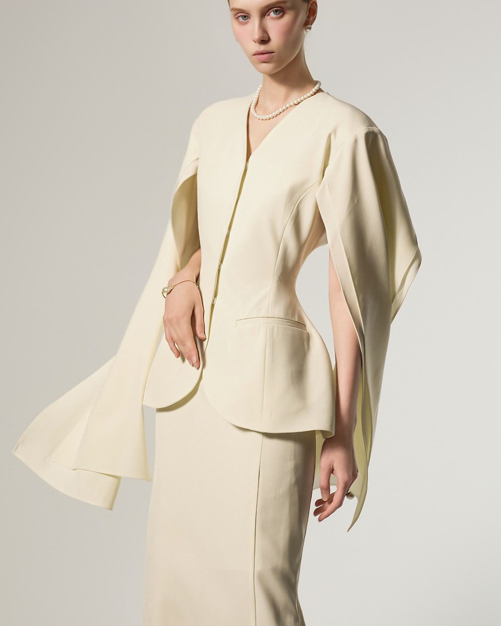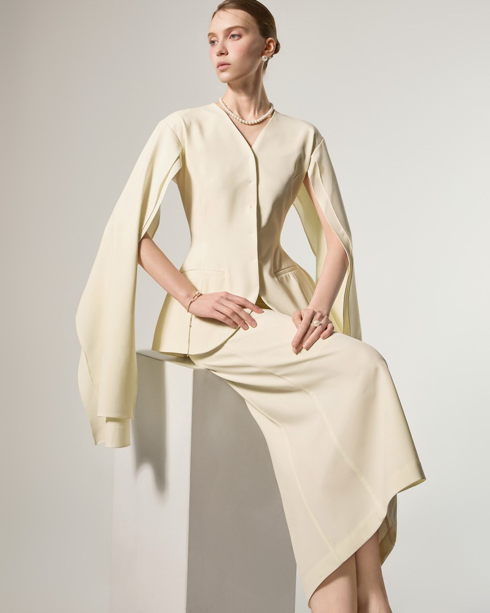 披肩袖设计带有开衩,举手投足间都散发出自然优雅的律动,
