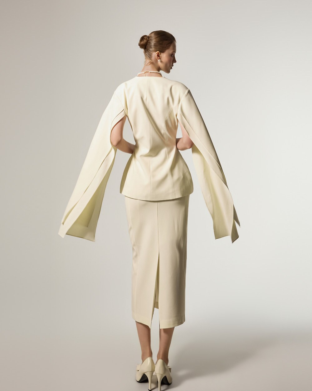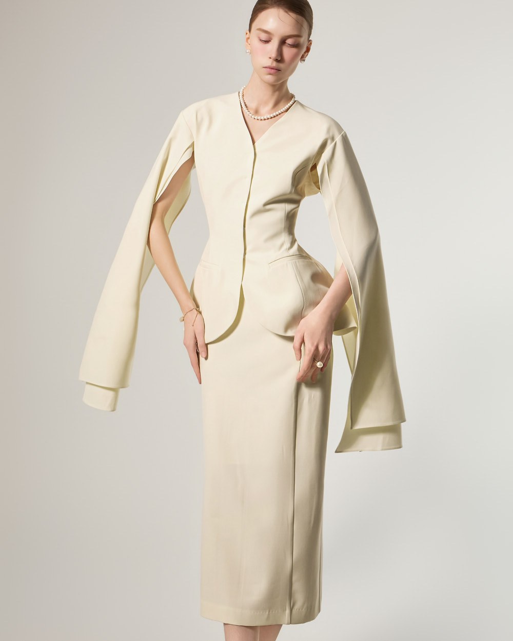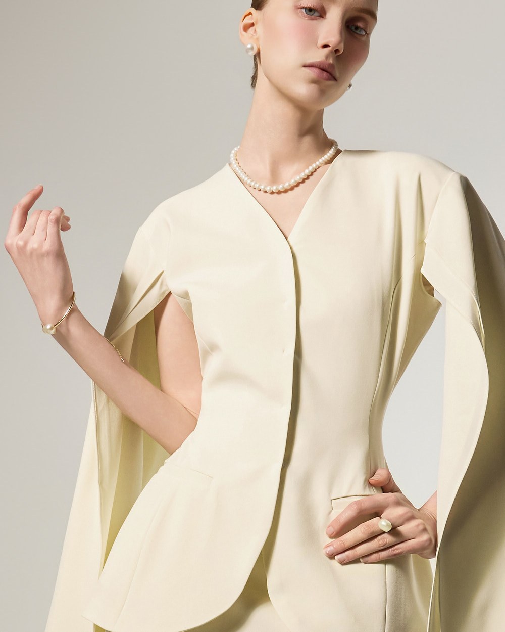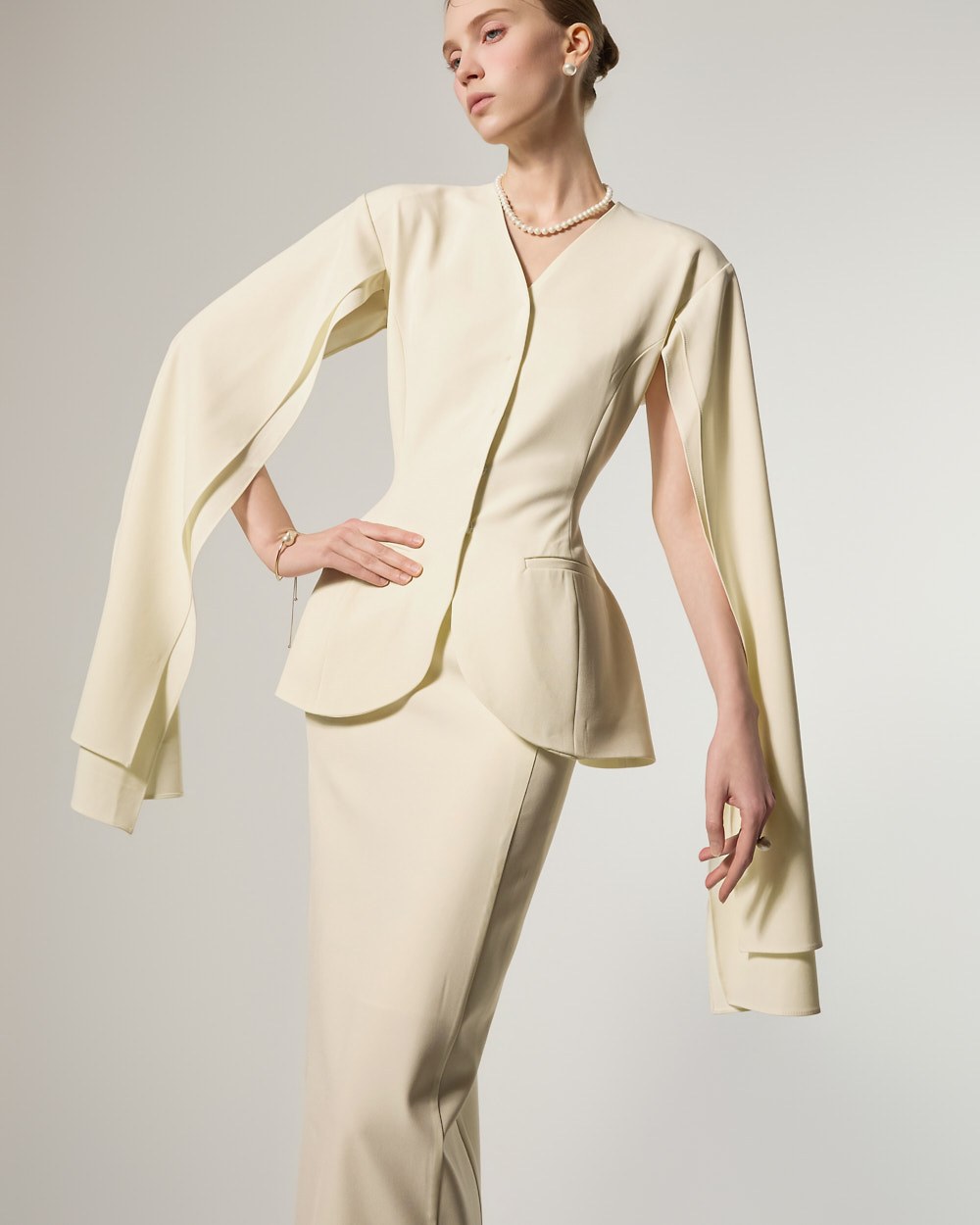 披肩袖设计带有开衩,举手投足间都散发出自然优雅的律动,