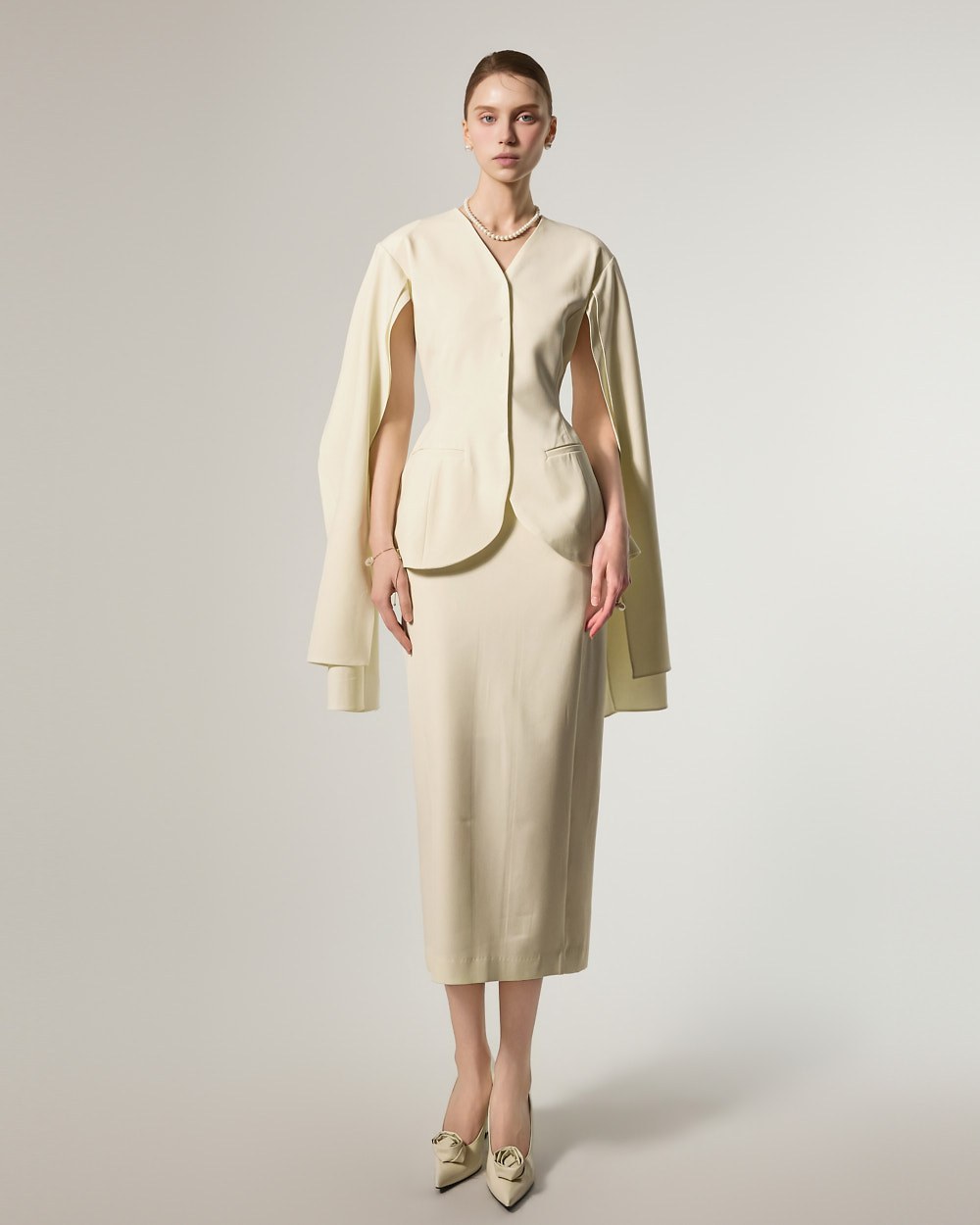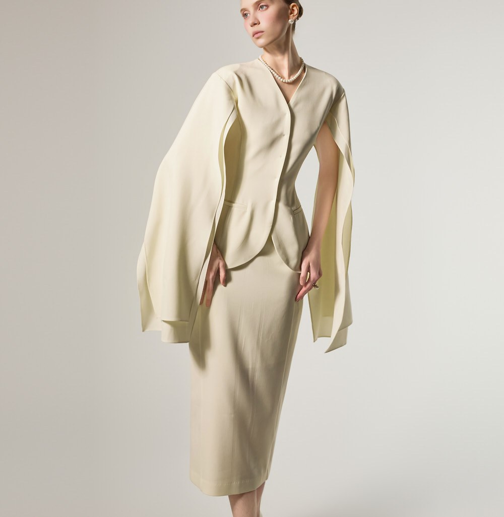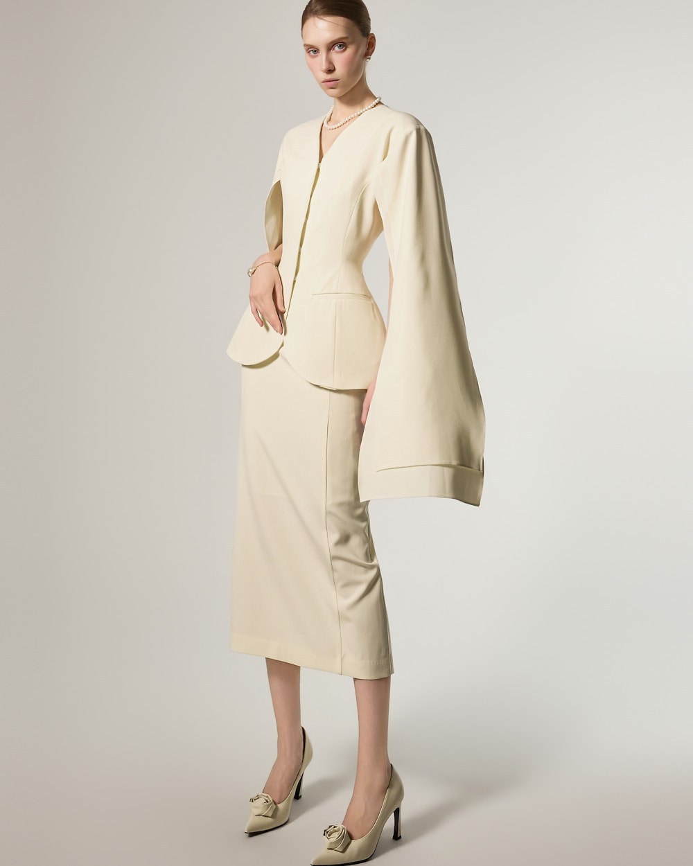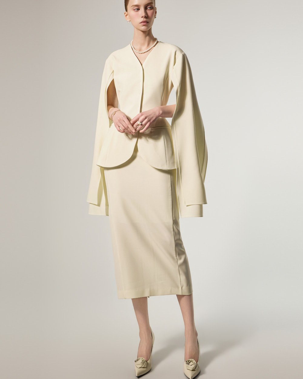 披肩袖设计带有开衩,举手投足间都散发出自然优雅的律动,