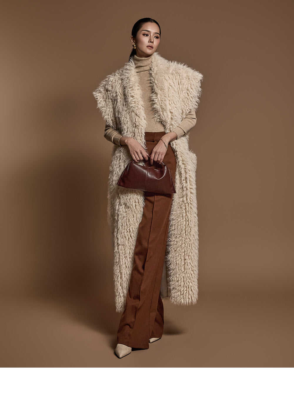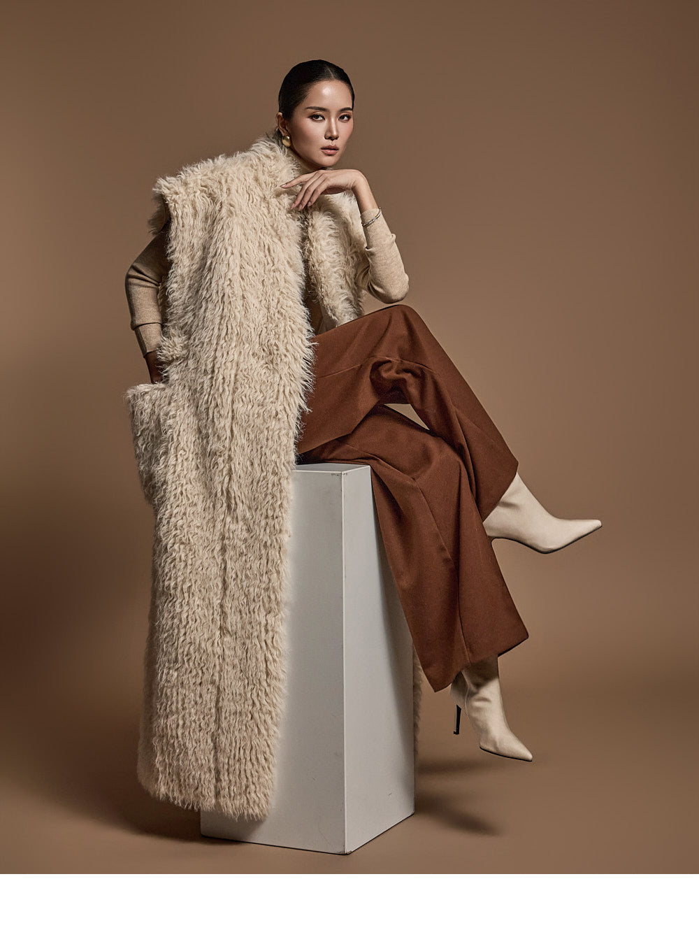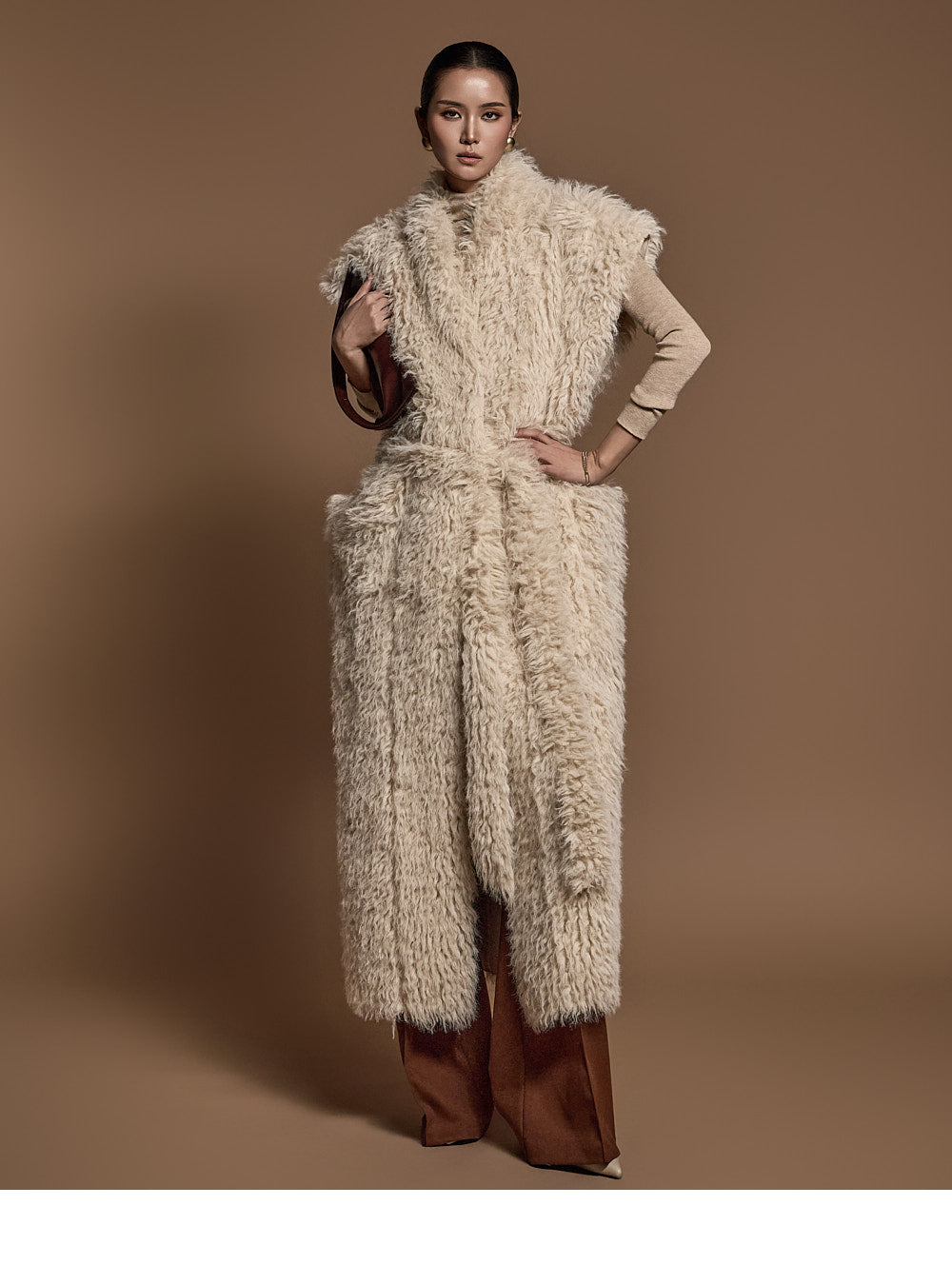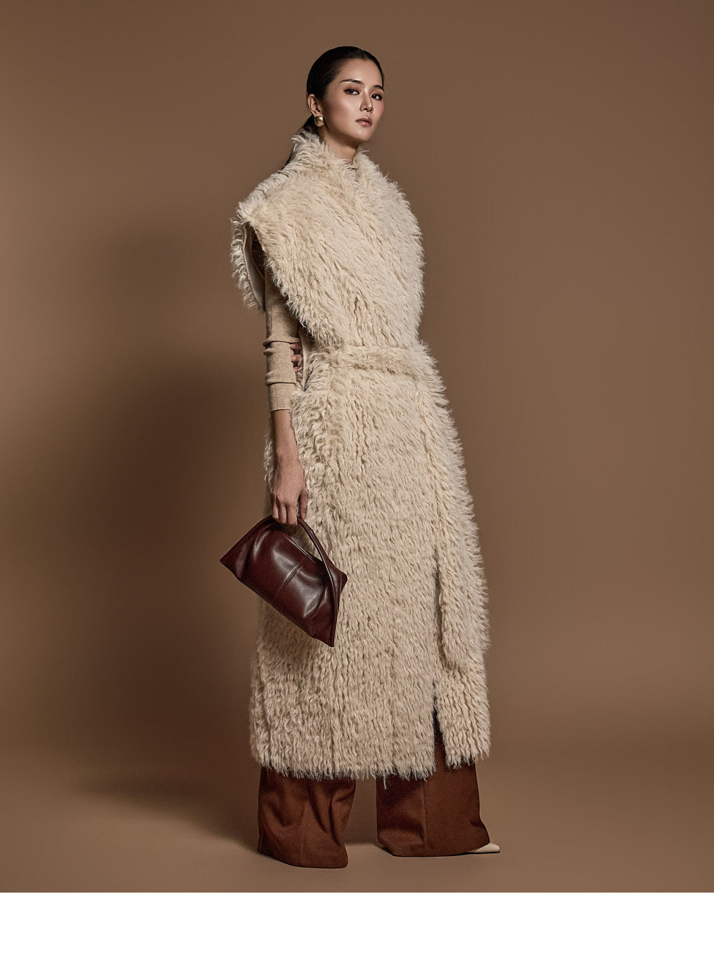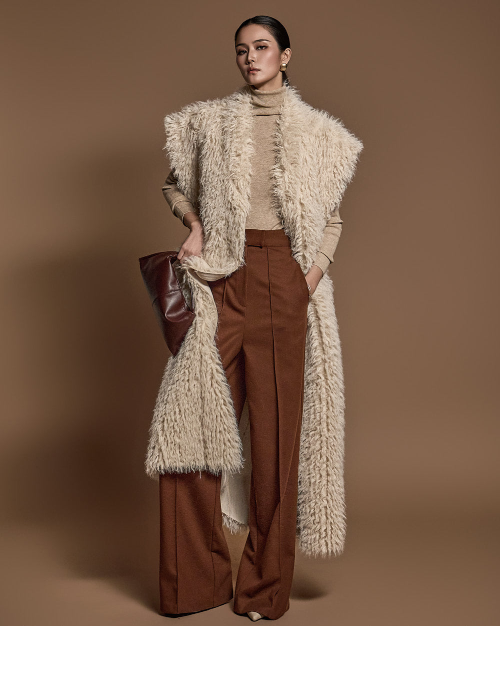 采用人造毛皮面料制成,具有轻盈、垂坠的感觉,