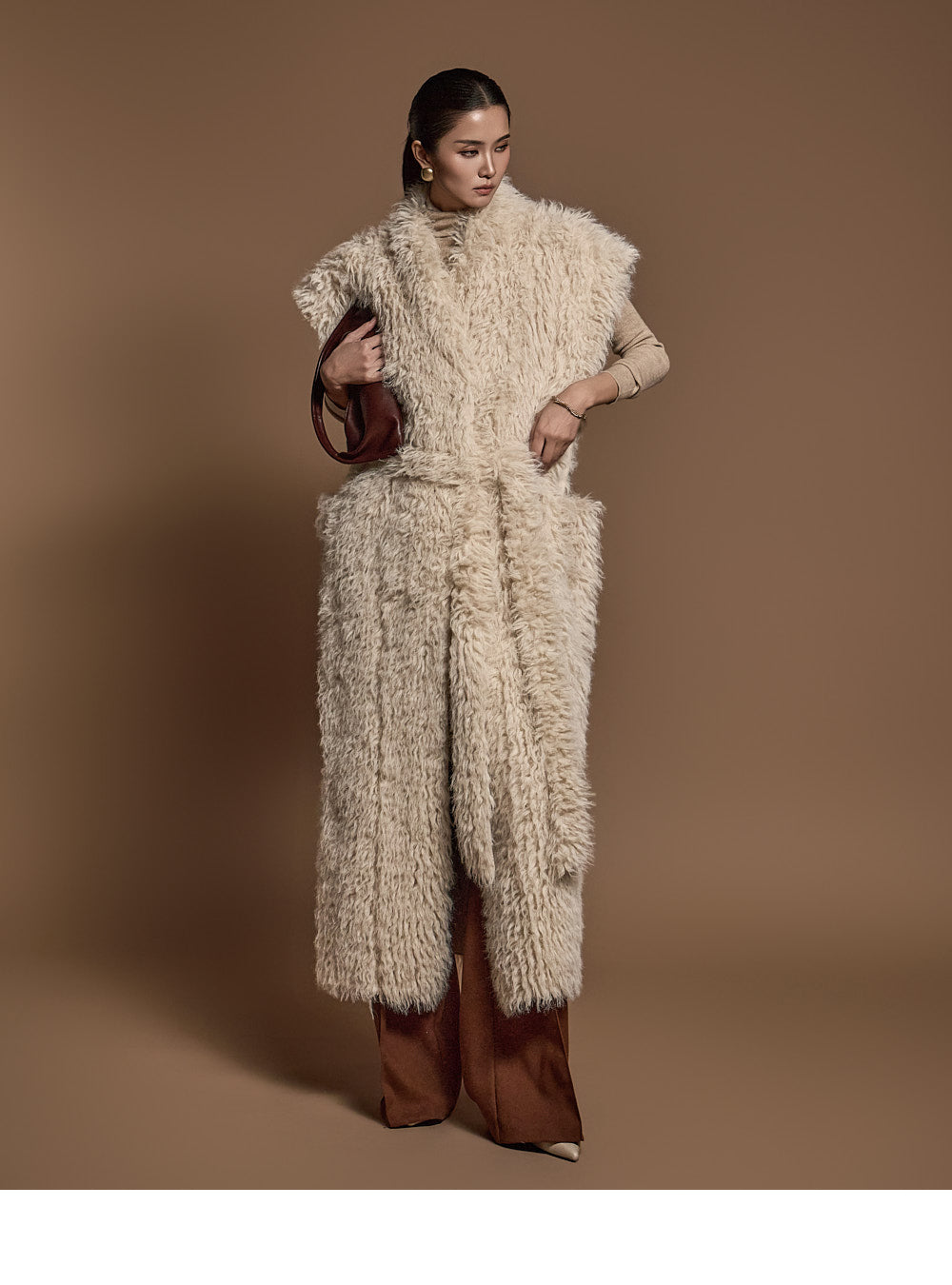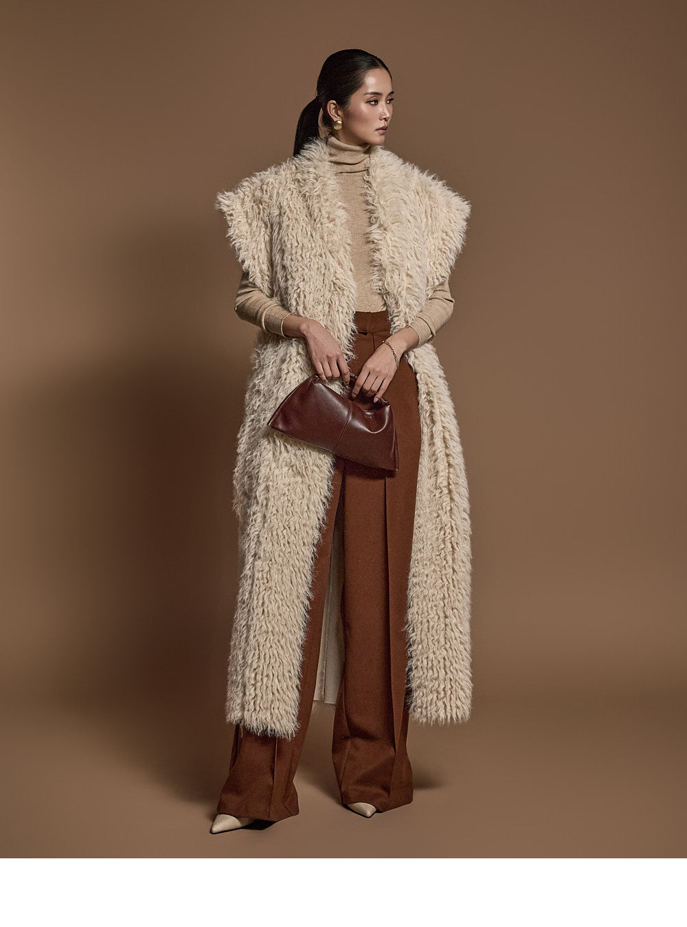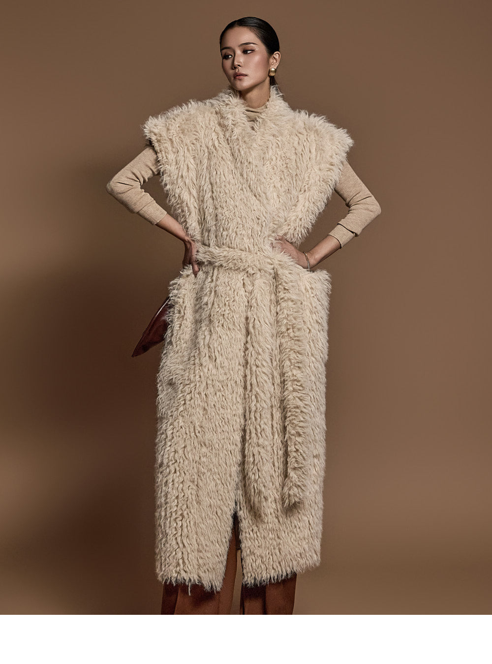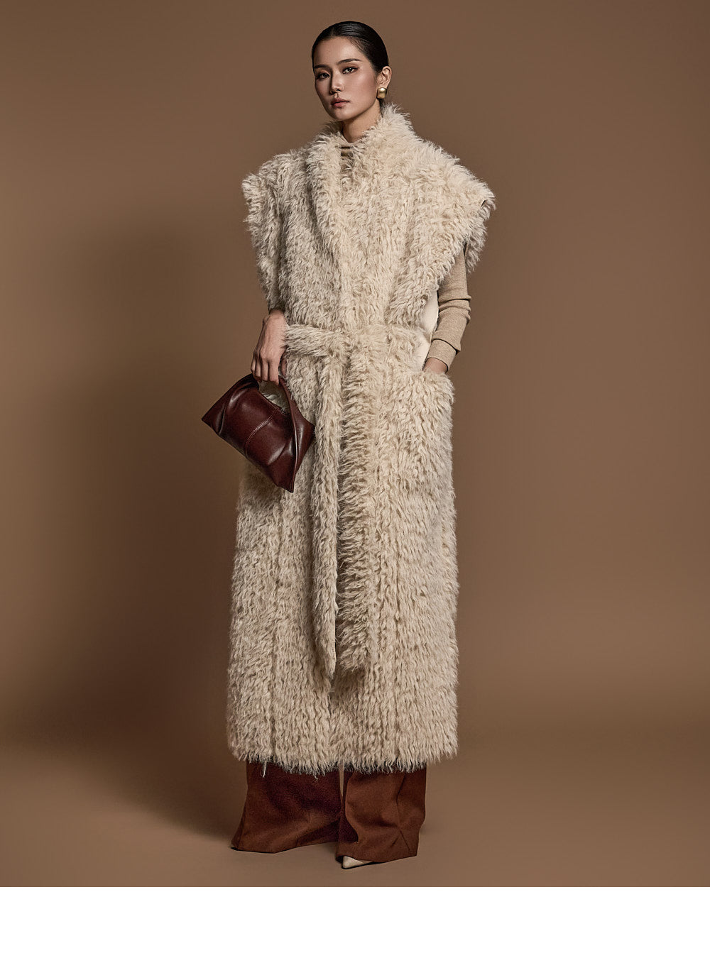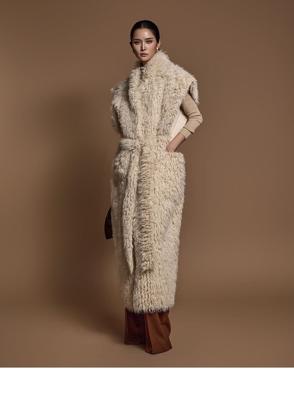 采用人造毛皮面料制成,具有轻盈、垂坠的感觉,