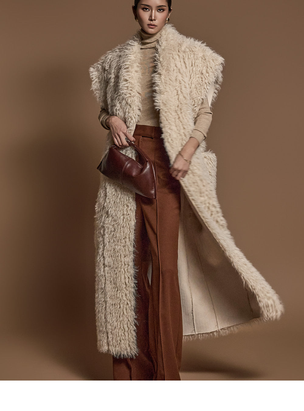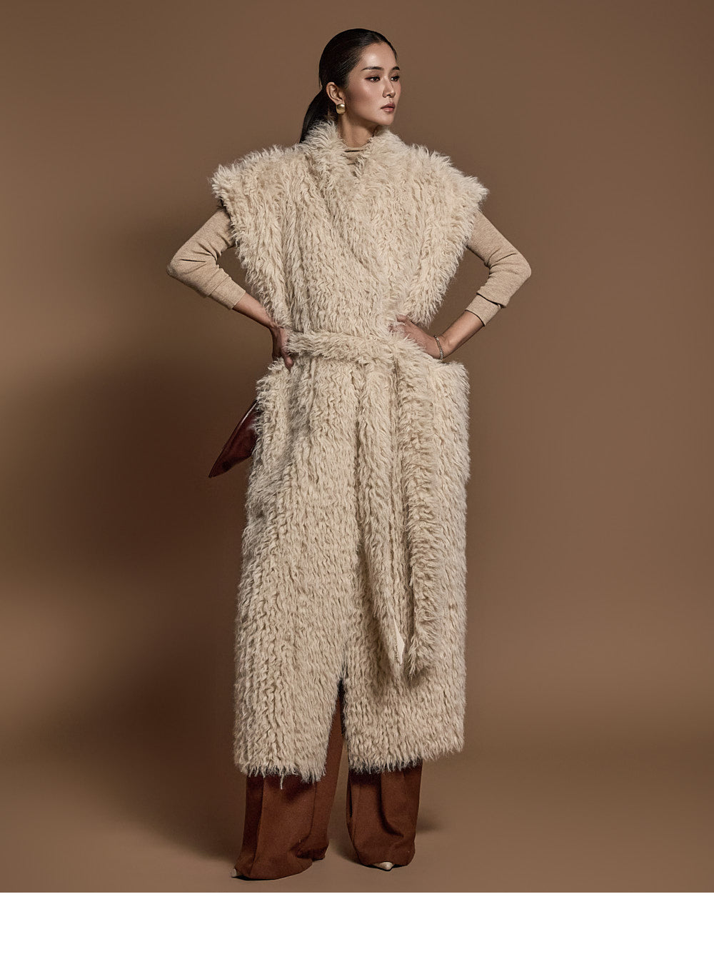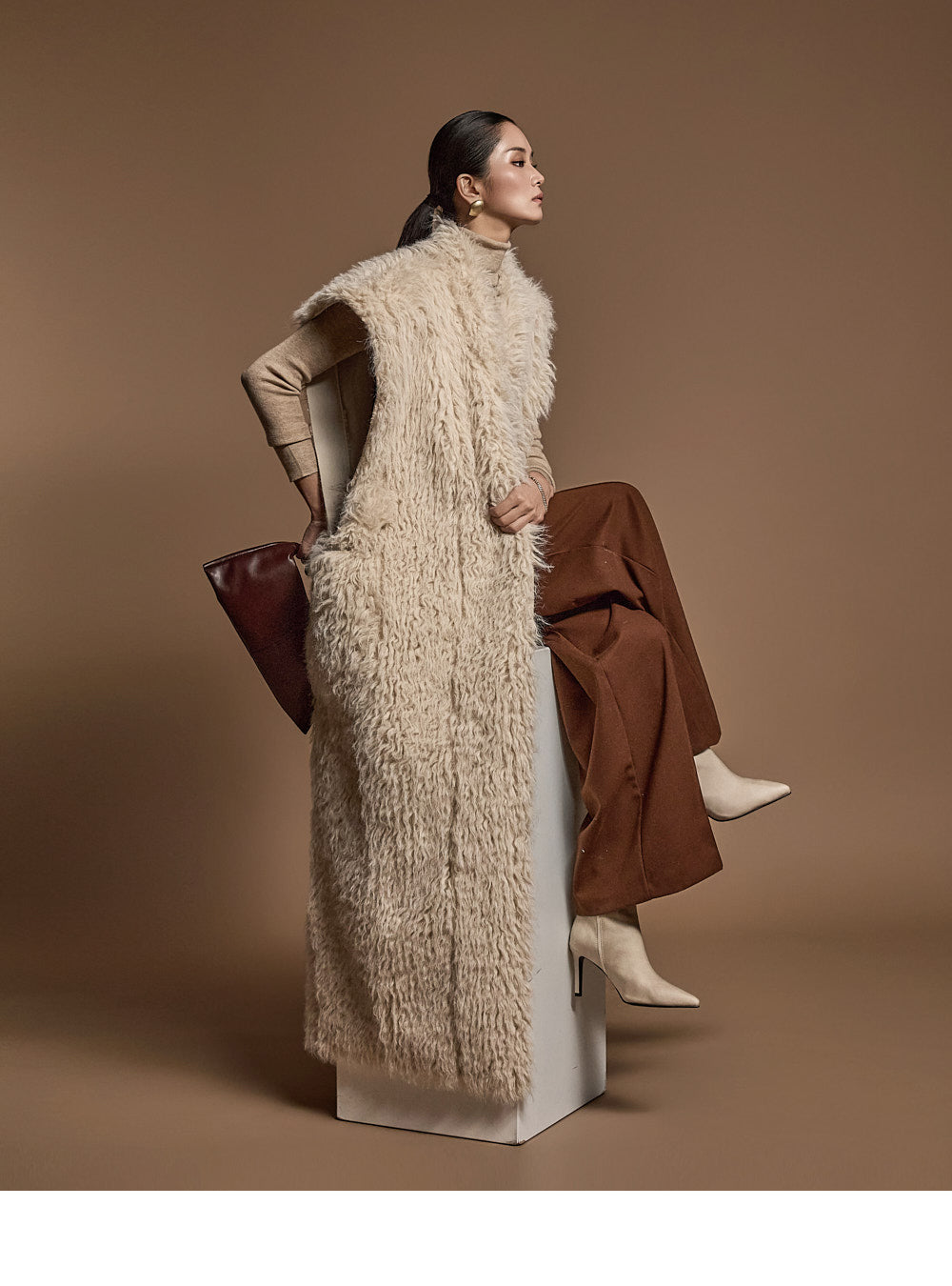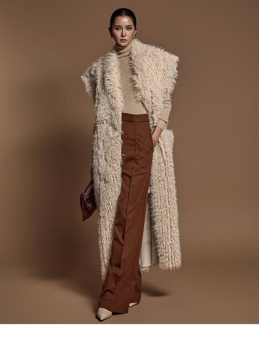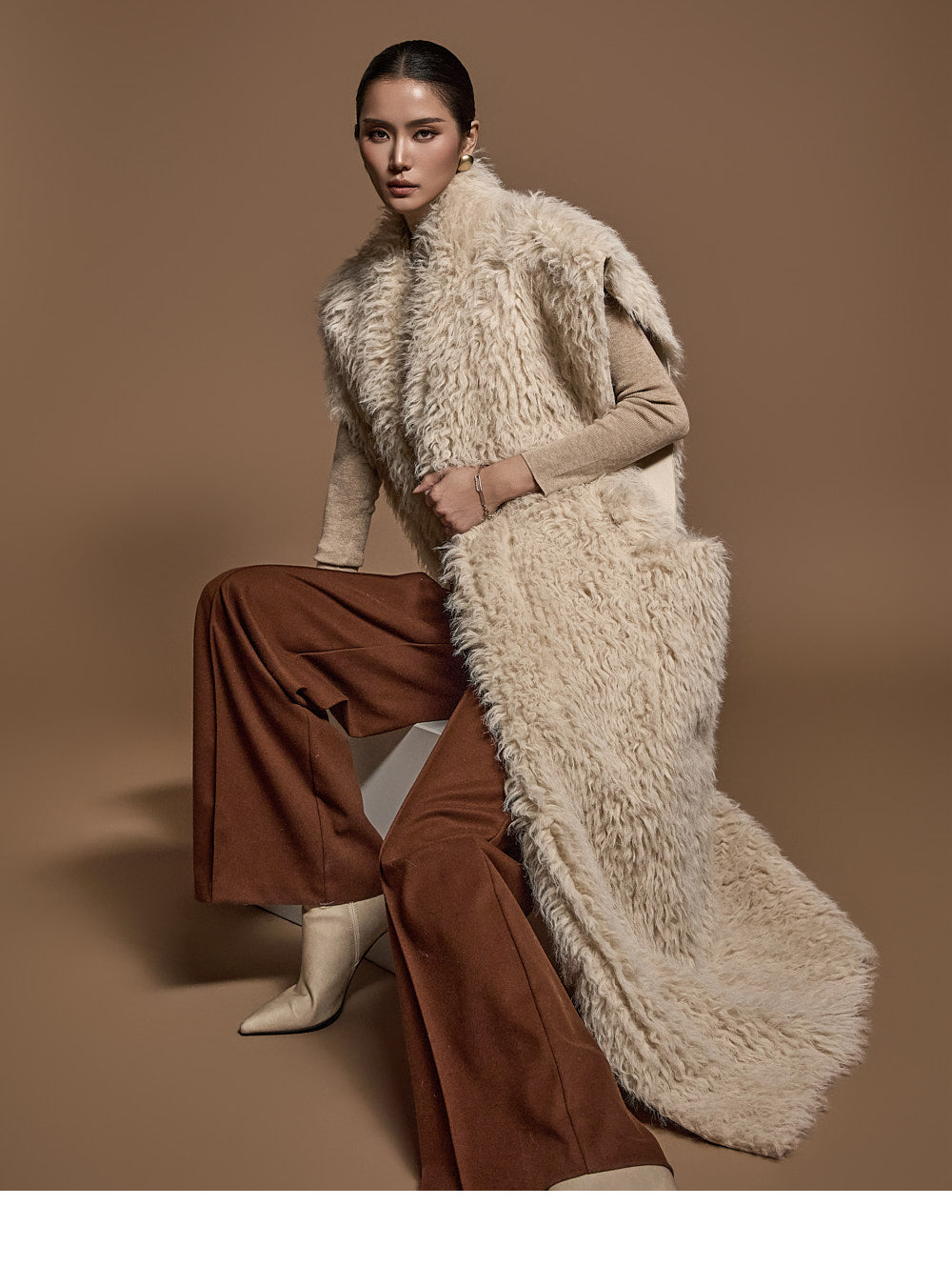 采用人造毛皮面料制成,具有轻盈、垂坠的感觉,