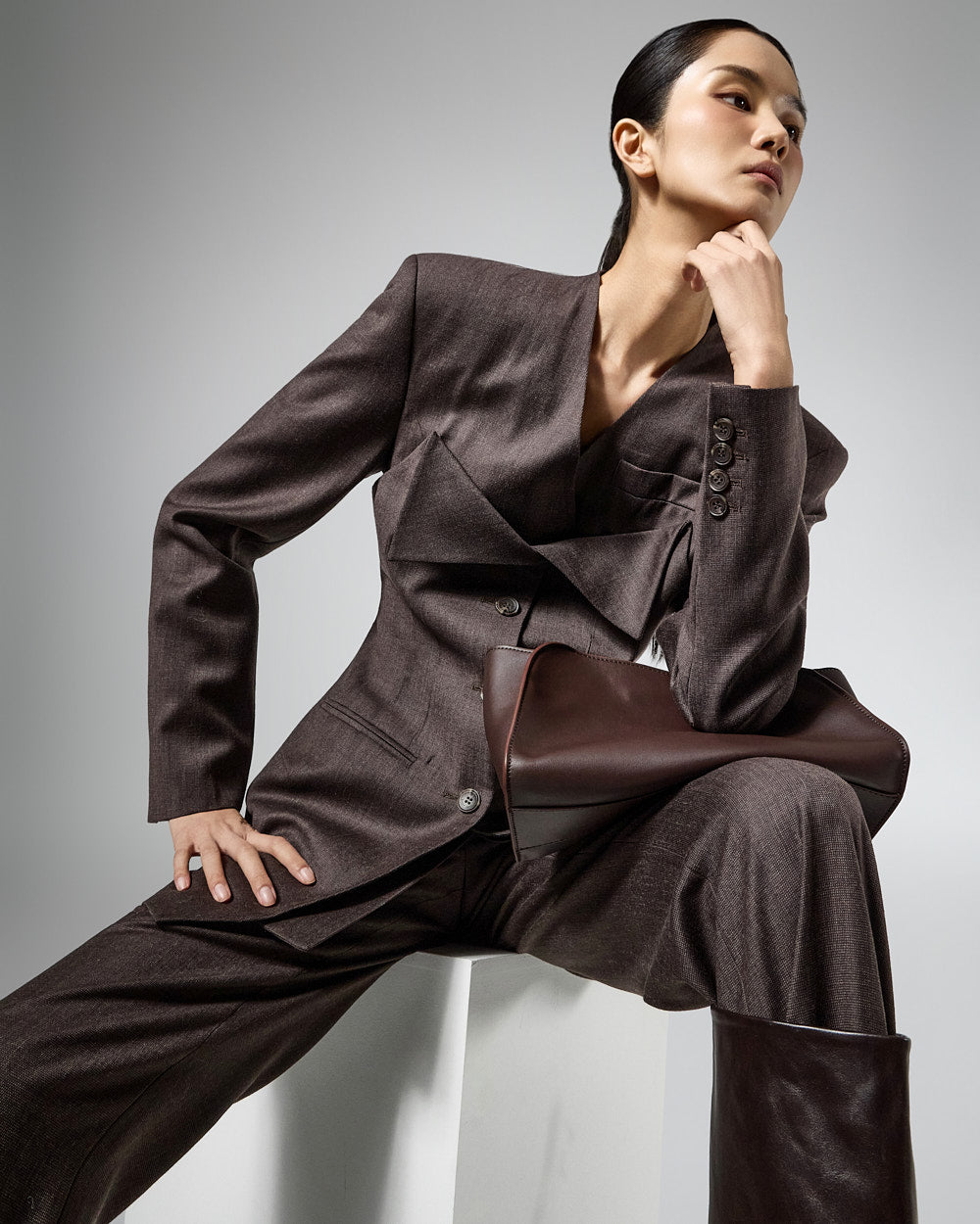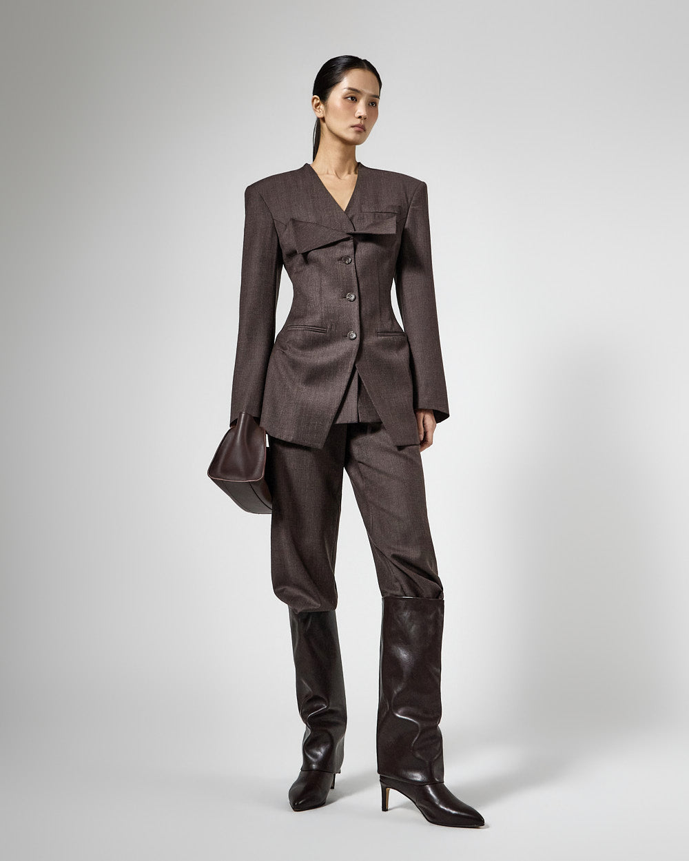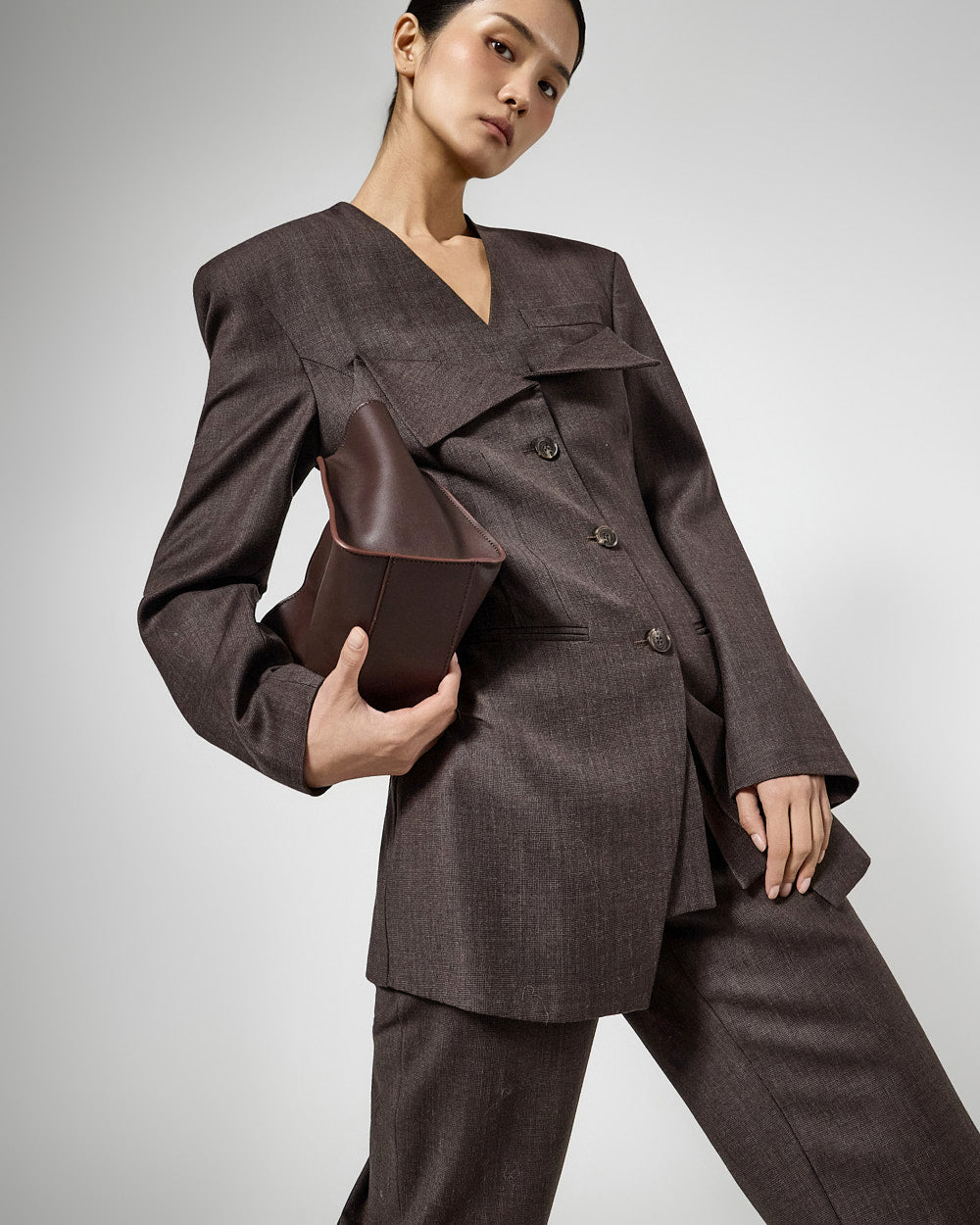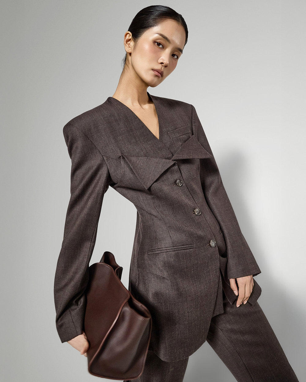 宽肩垫营造出结构化的轮廓。??