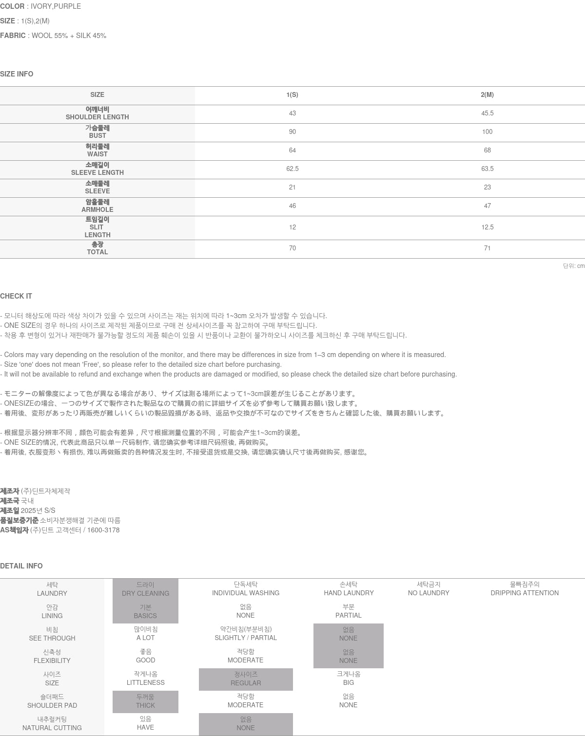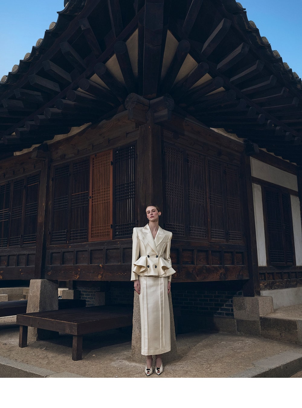 模特身高 175 厘米,穿象牙色 1(S) 码的衣服。