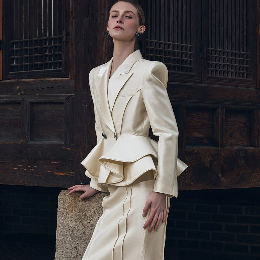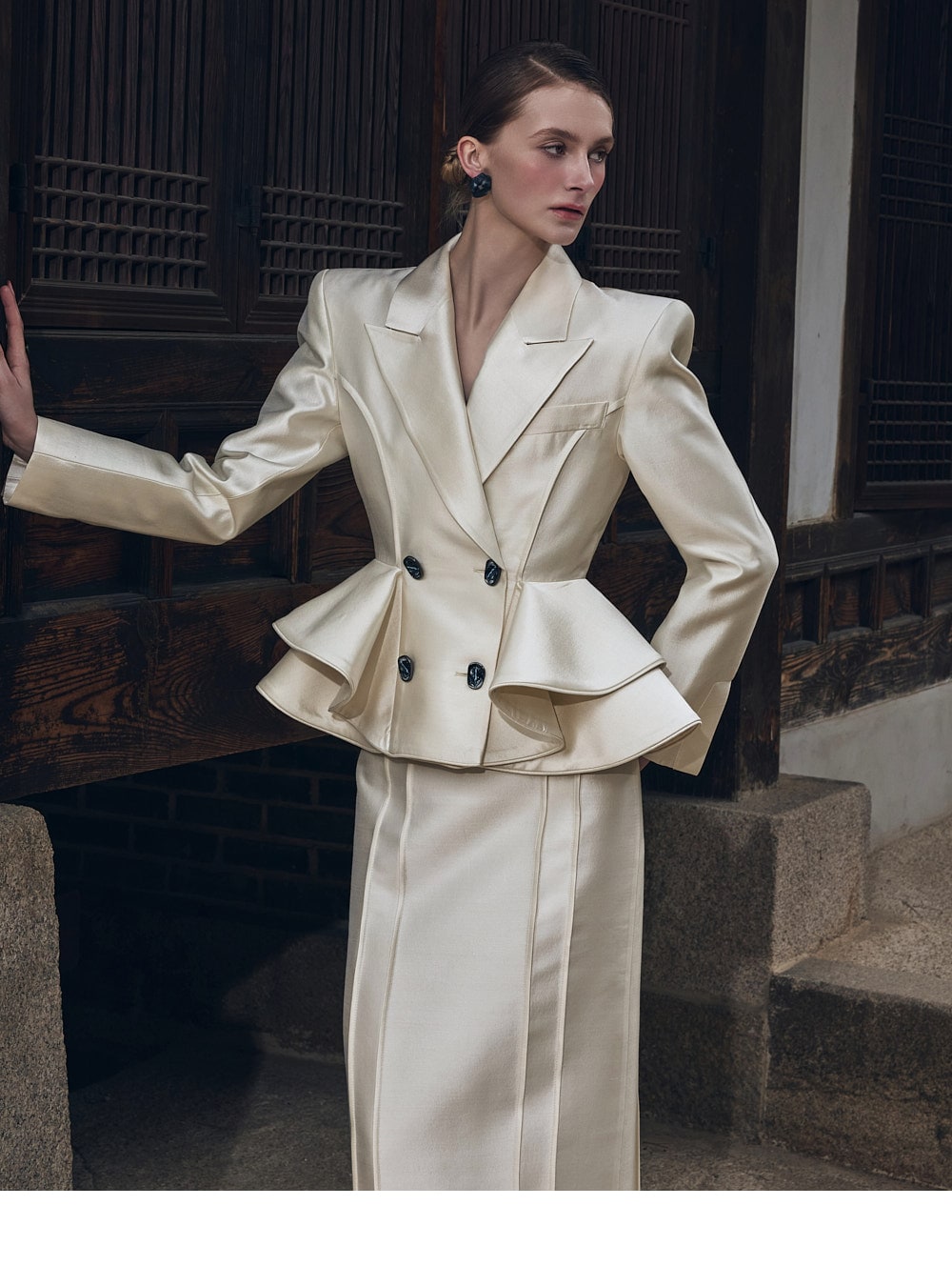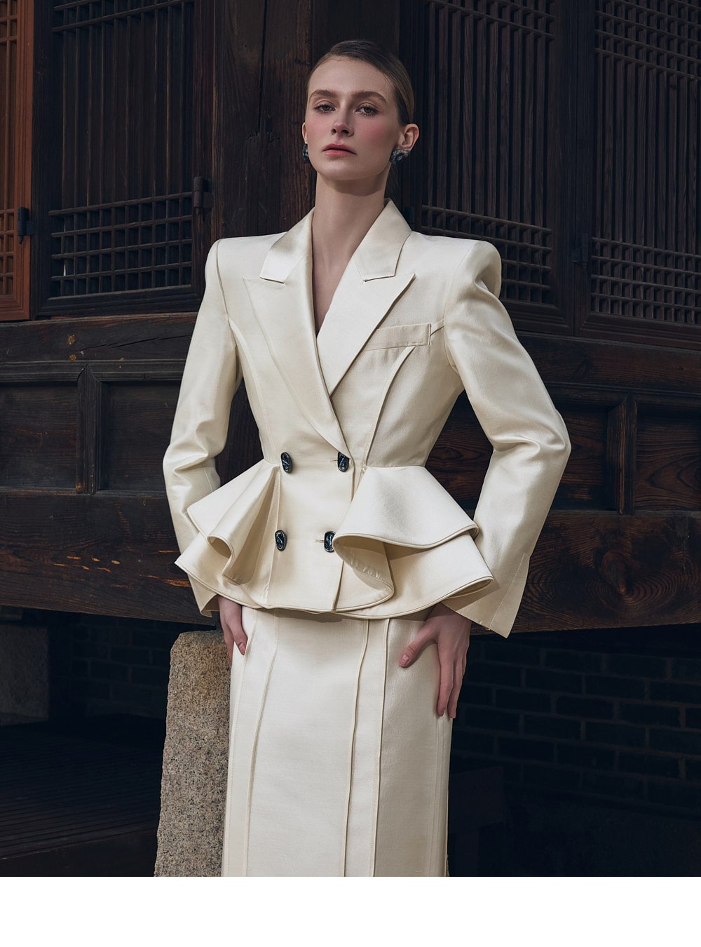 剪裁合身的衣领和双纽扣闭合增强了经典的感觉,