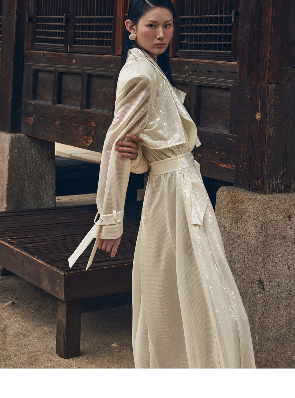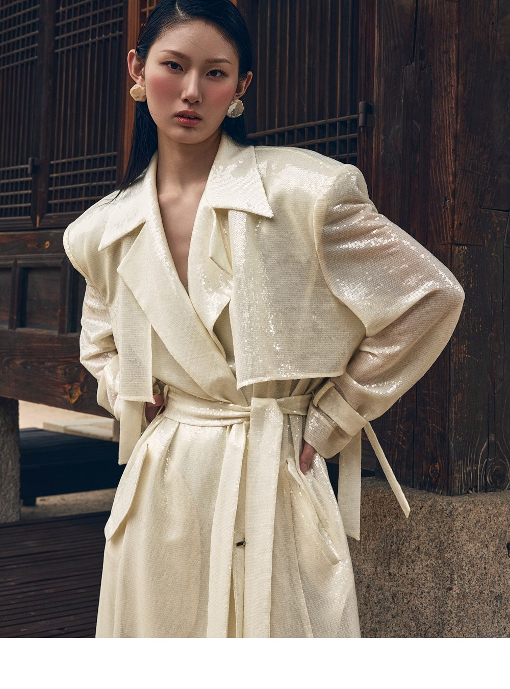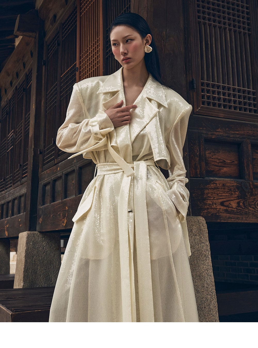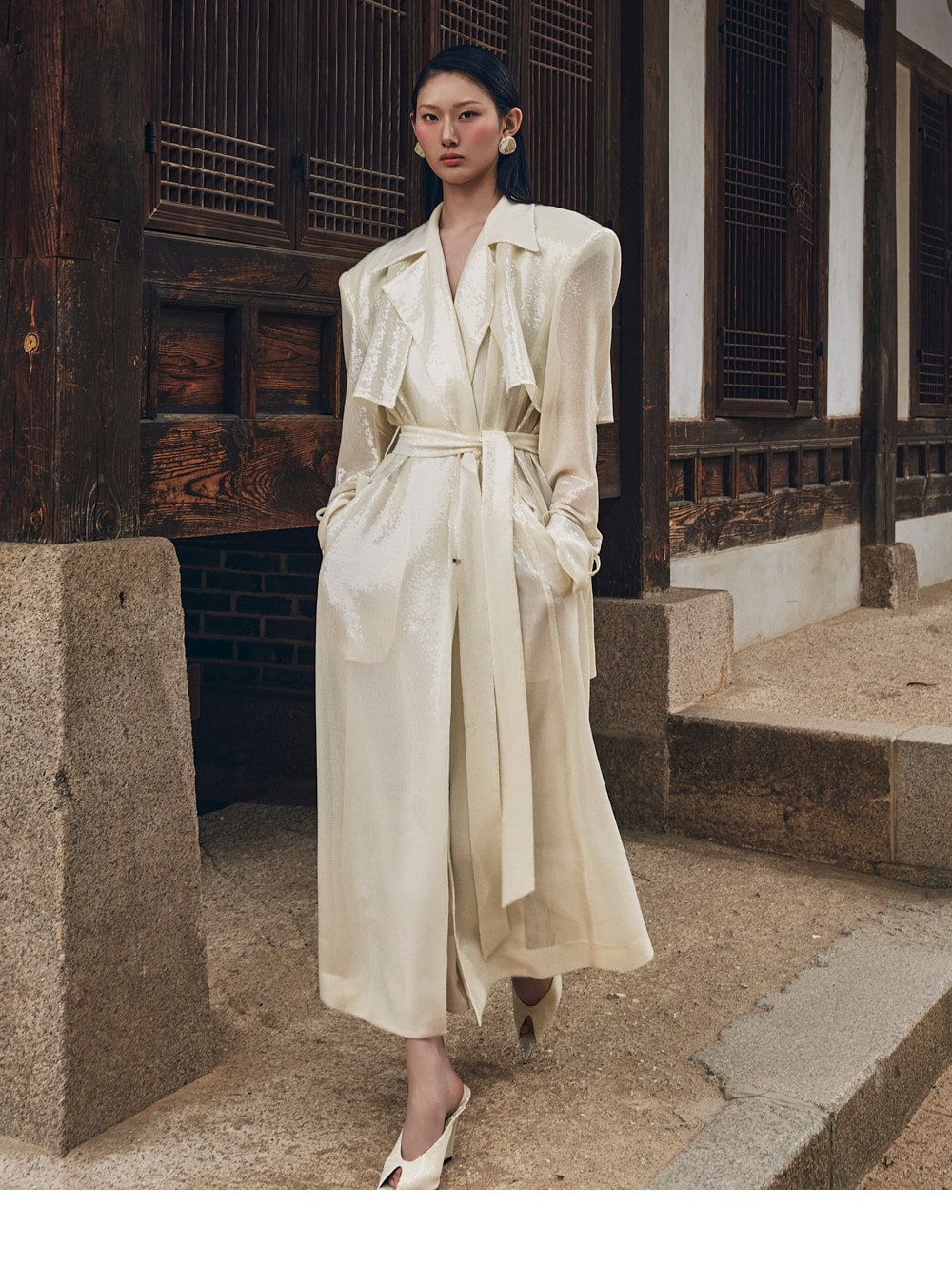 经典剪裁的衣领和宽松的长款增添了精致的感觉,