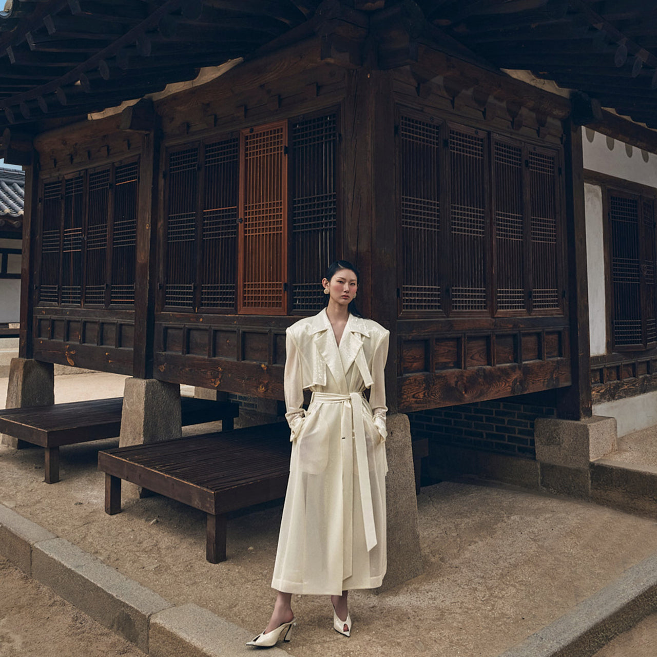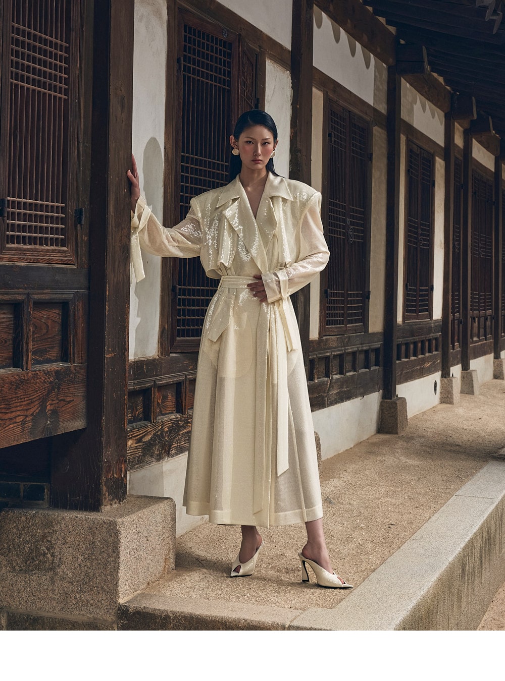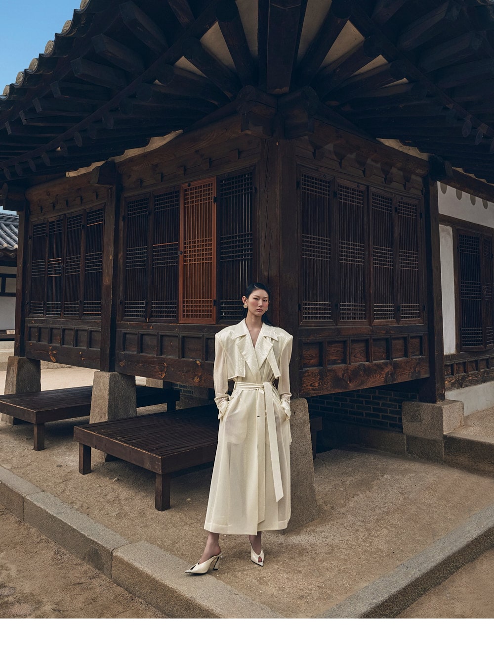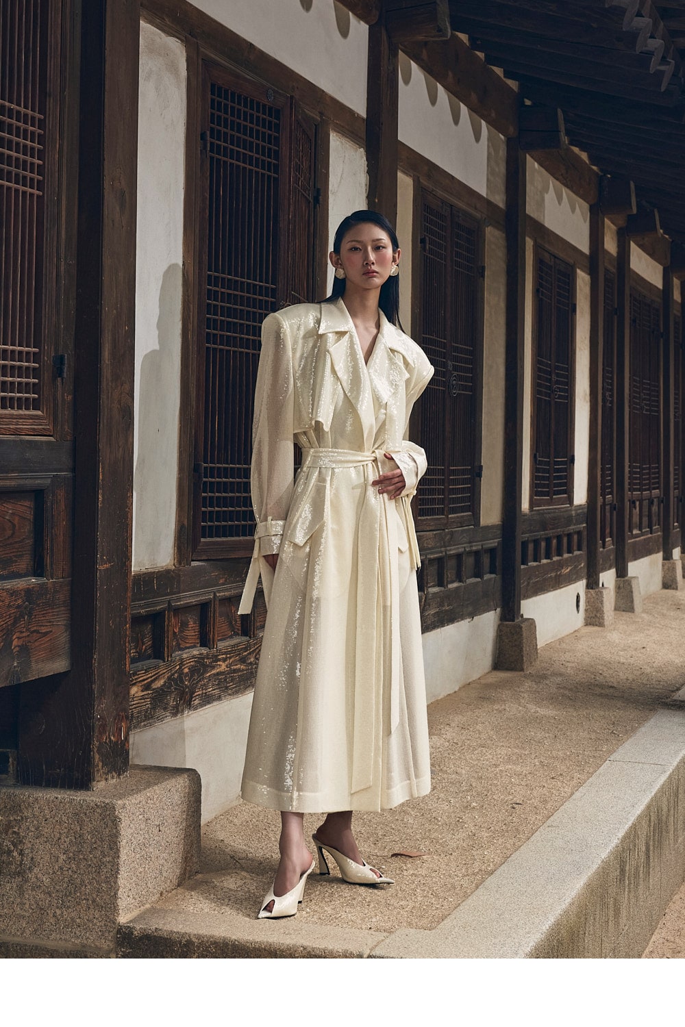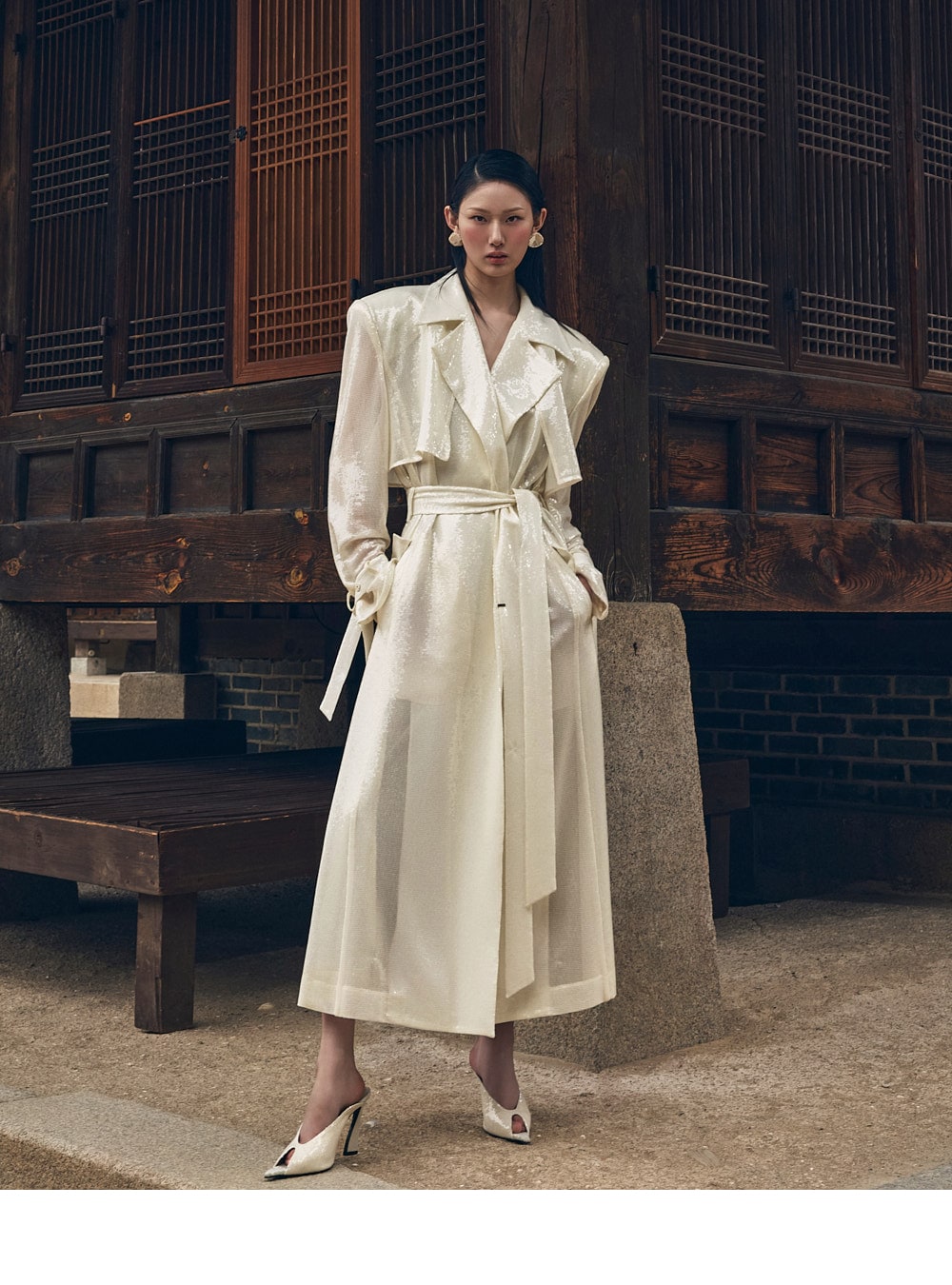 经典剪裁的衣领和宽松的长款增添了精致的感觉,