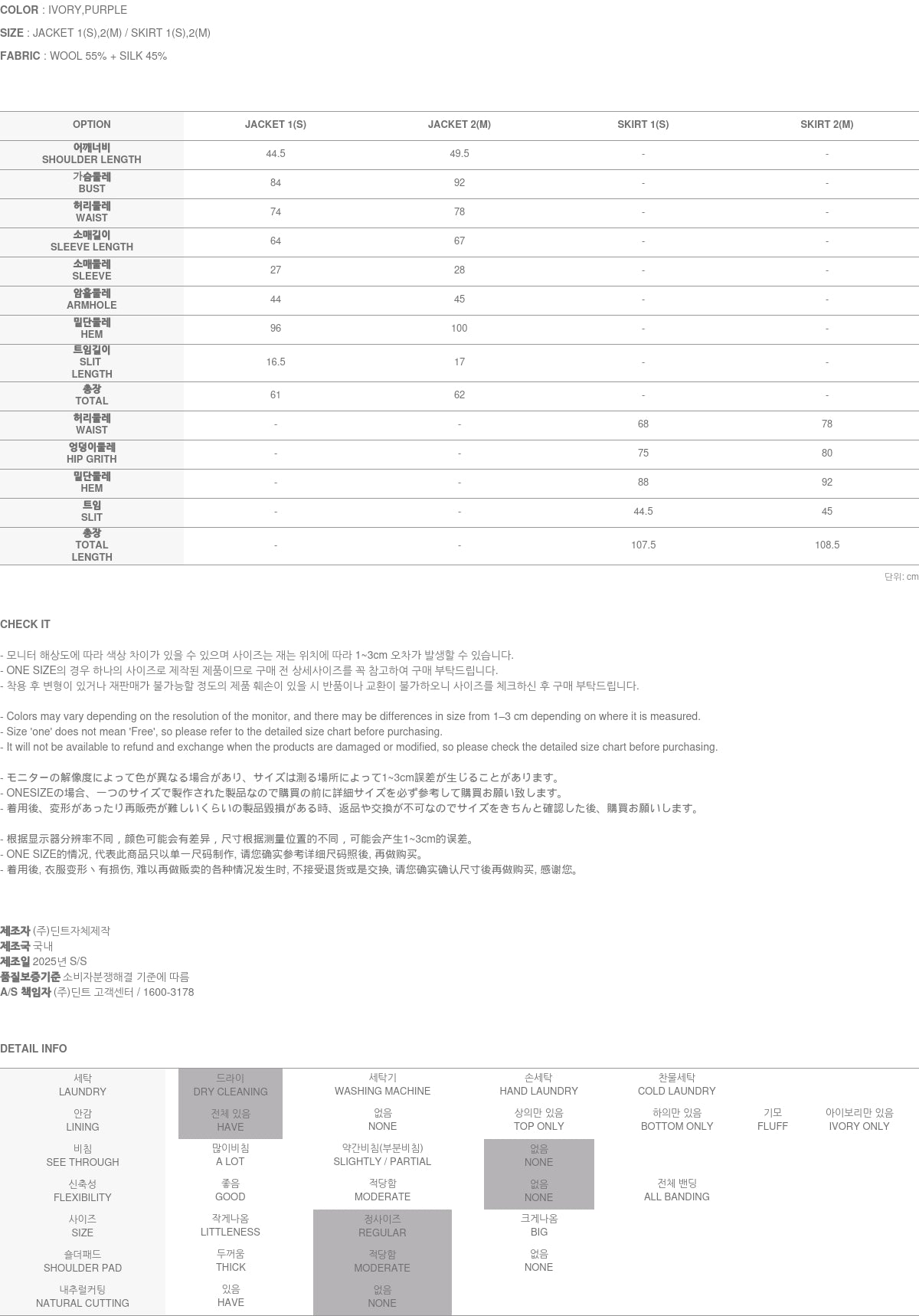 上衣和下装均有 1(S) 和 2(M) 尺码可选,