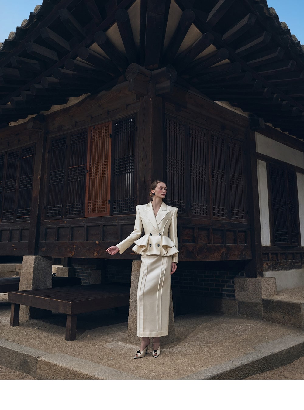 模特身高 175 厘米,穿象牙色 1(S) 码的衣服。