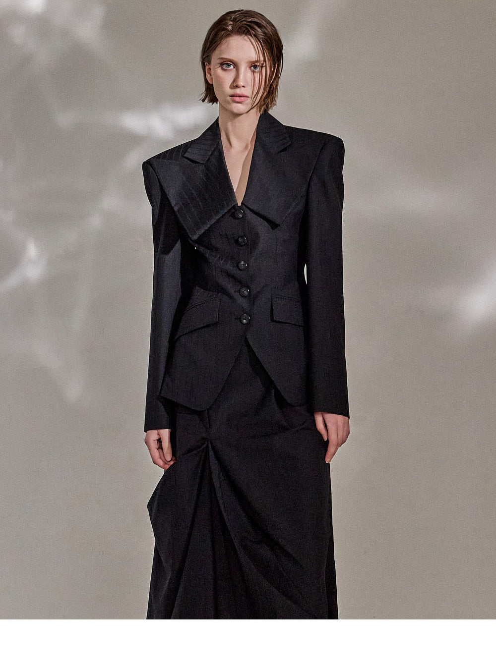 这件夹克采用宽翻领设计,外观柔和。